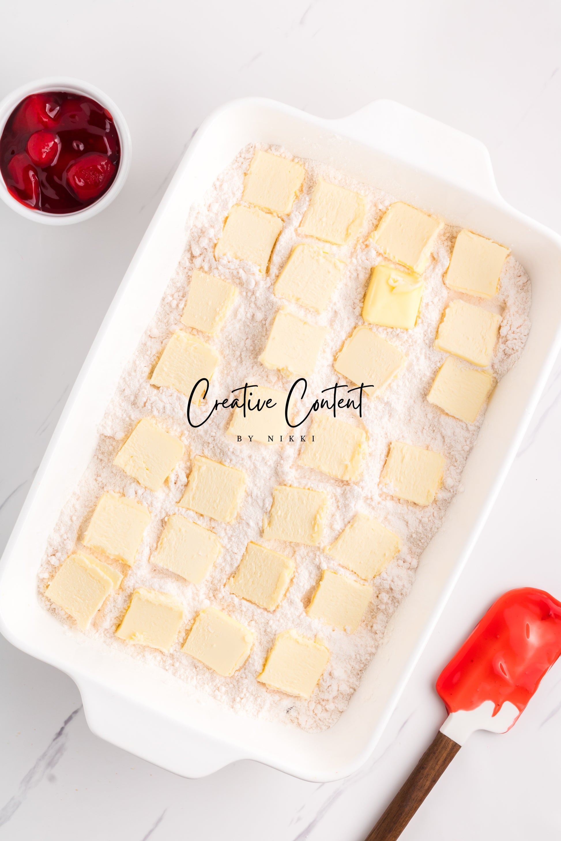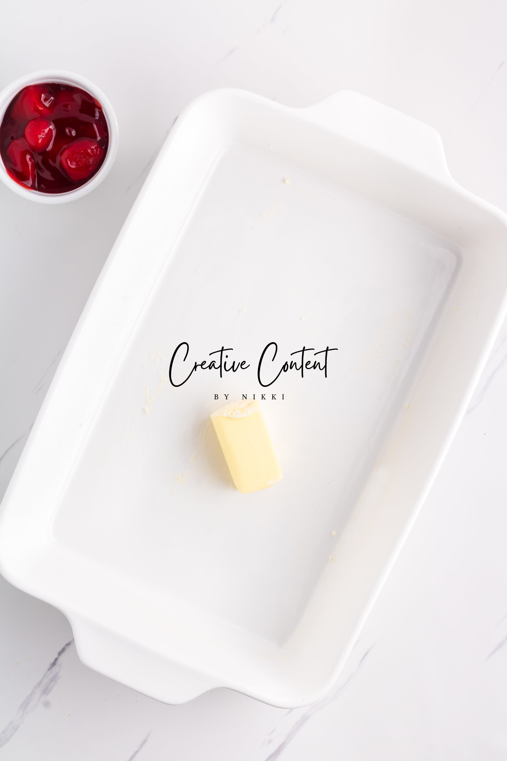 Featured Ingredients; strawberry pie filling, yellow cake mix, and unsalted butter.