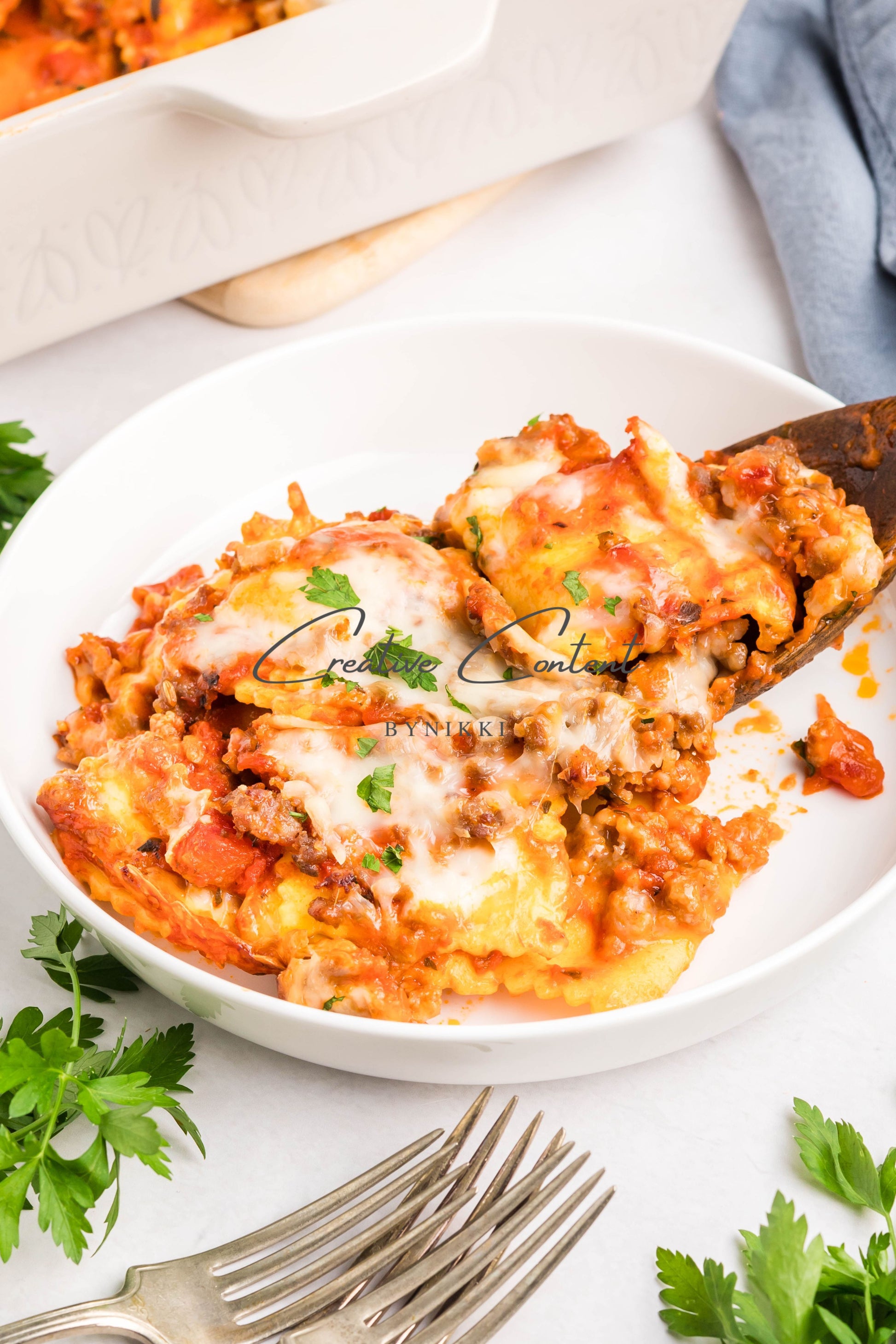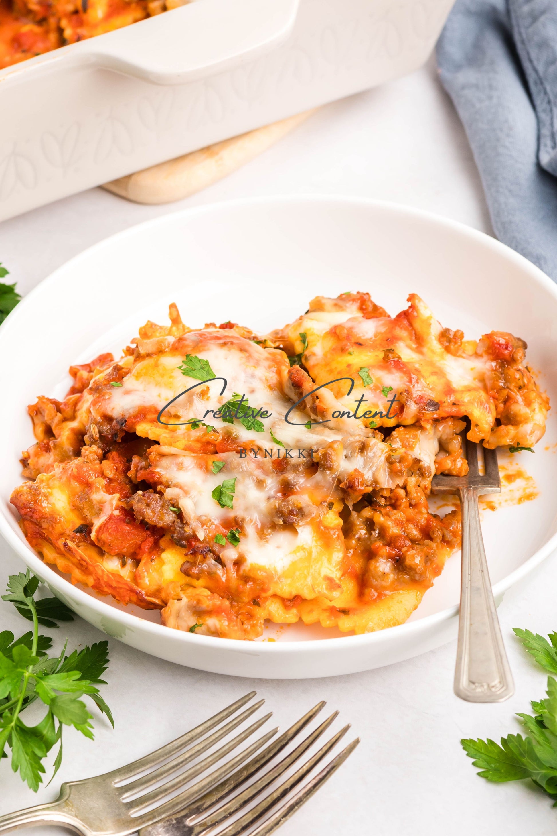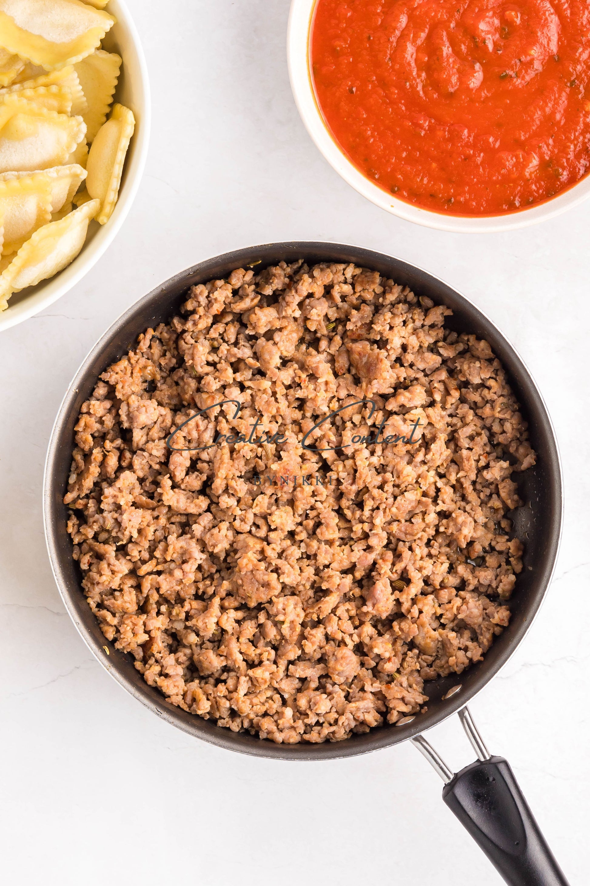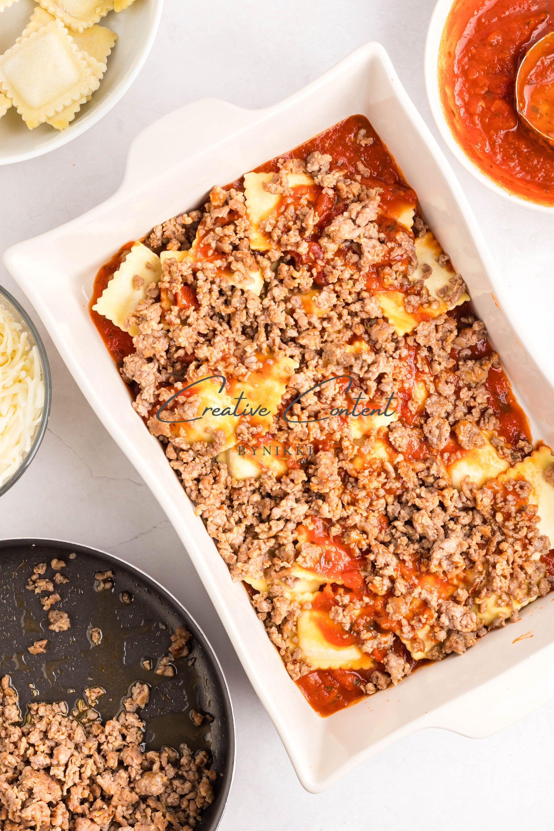 - Ingredients: frozen cheese ravioli, marinara sauce, Italian sausage, shredded mozzarella cheese, parsley