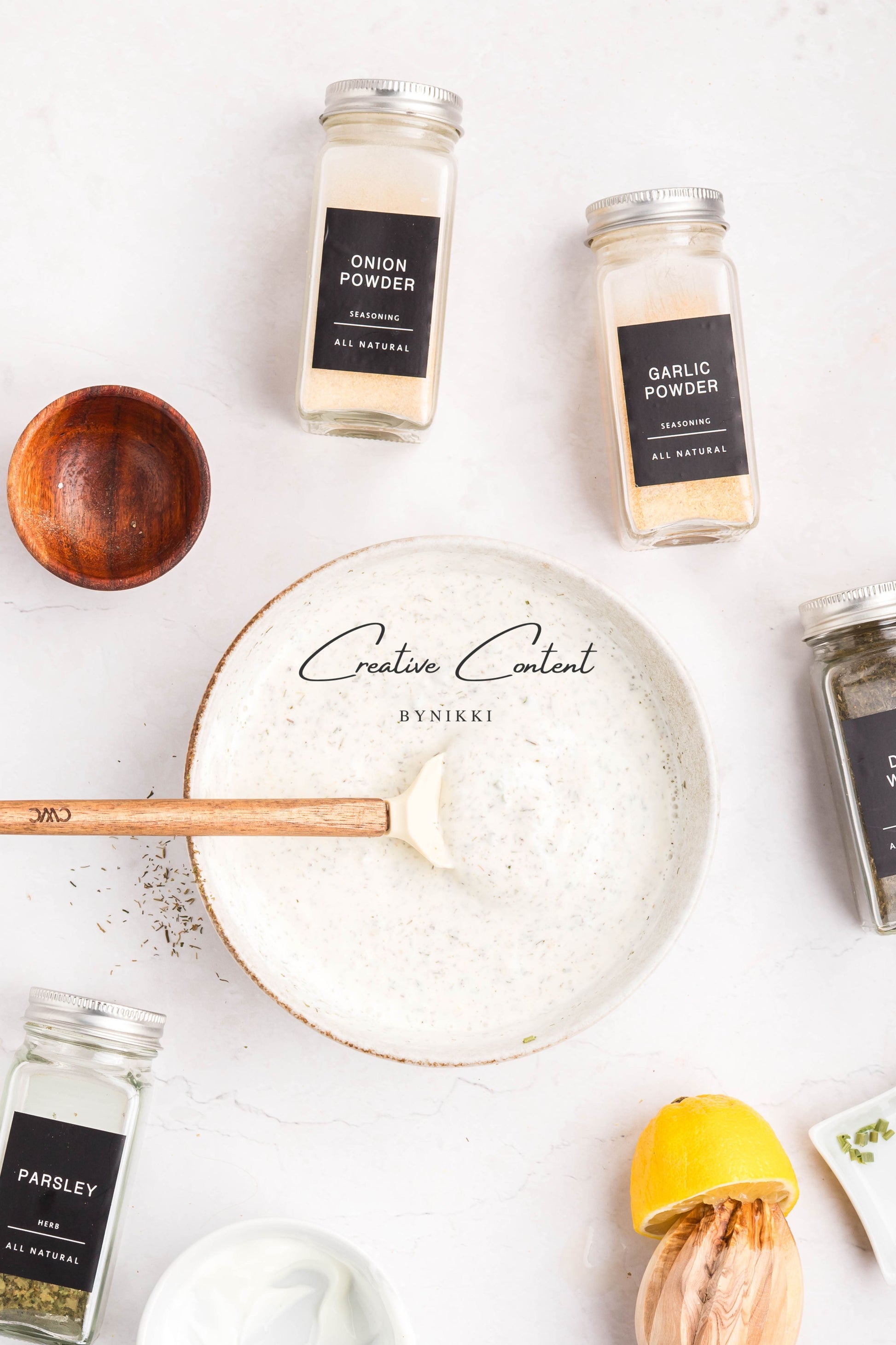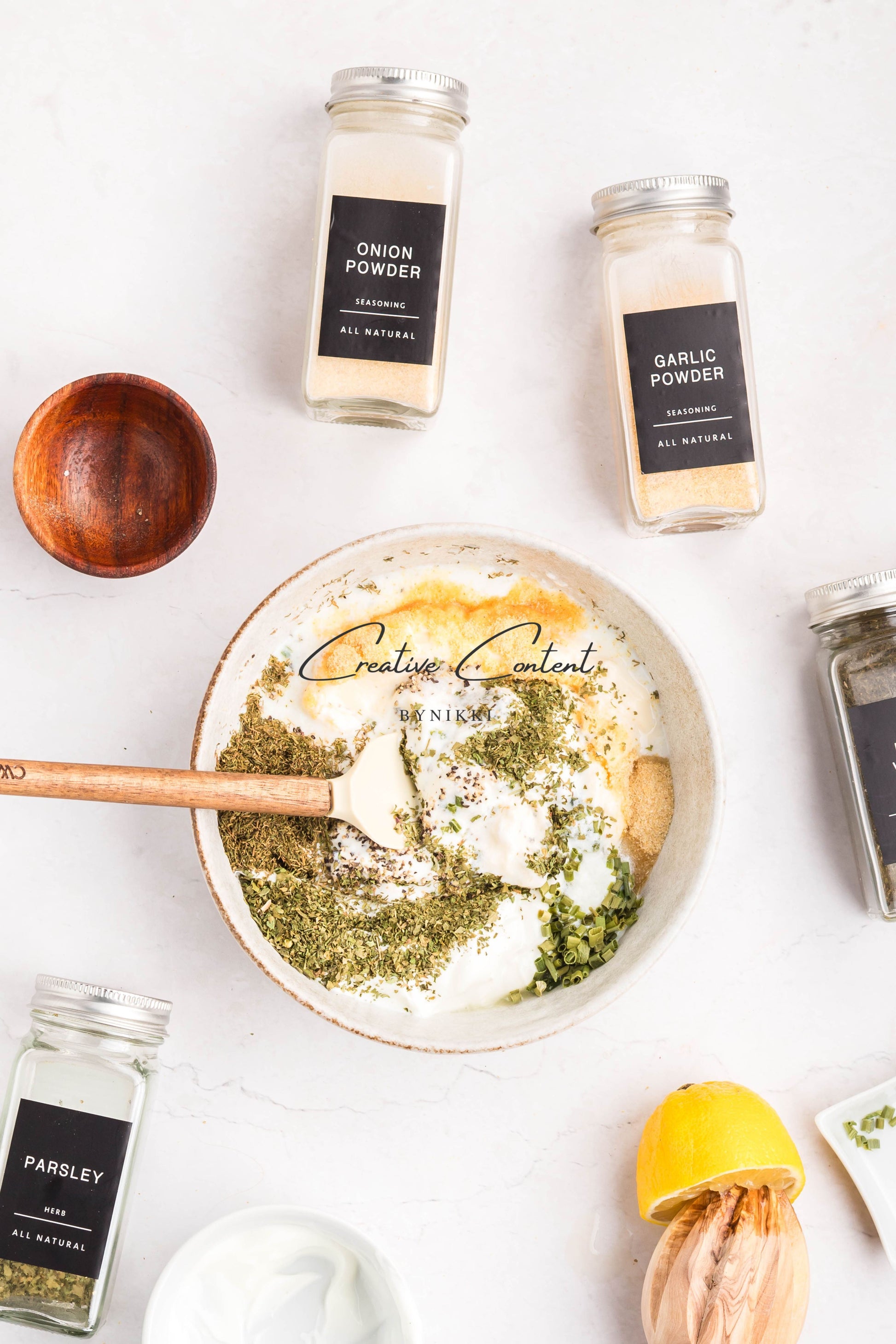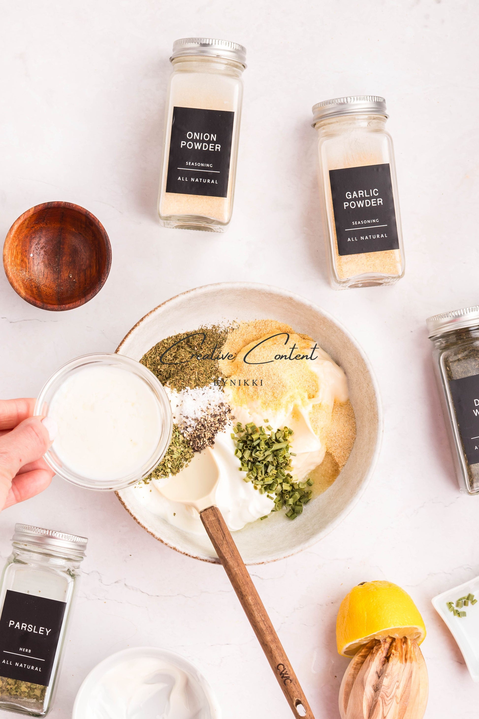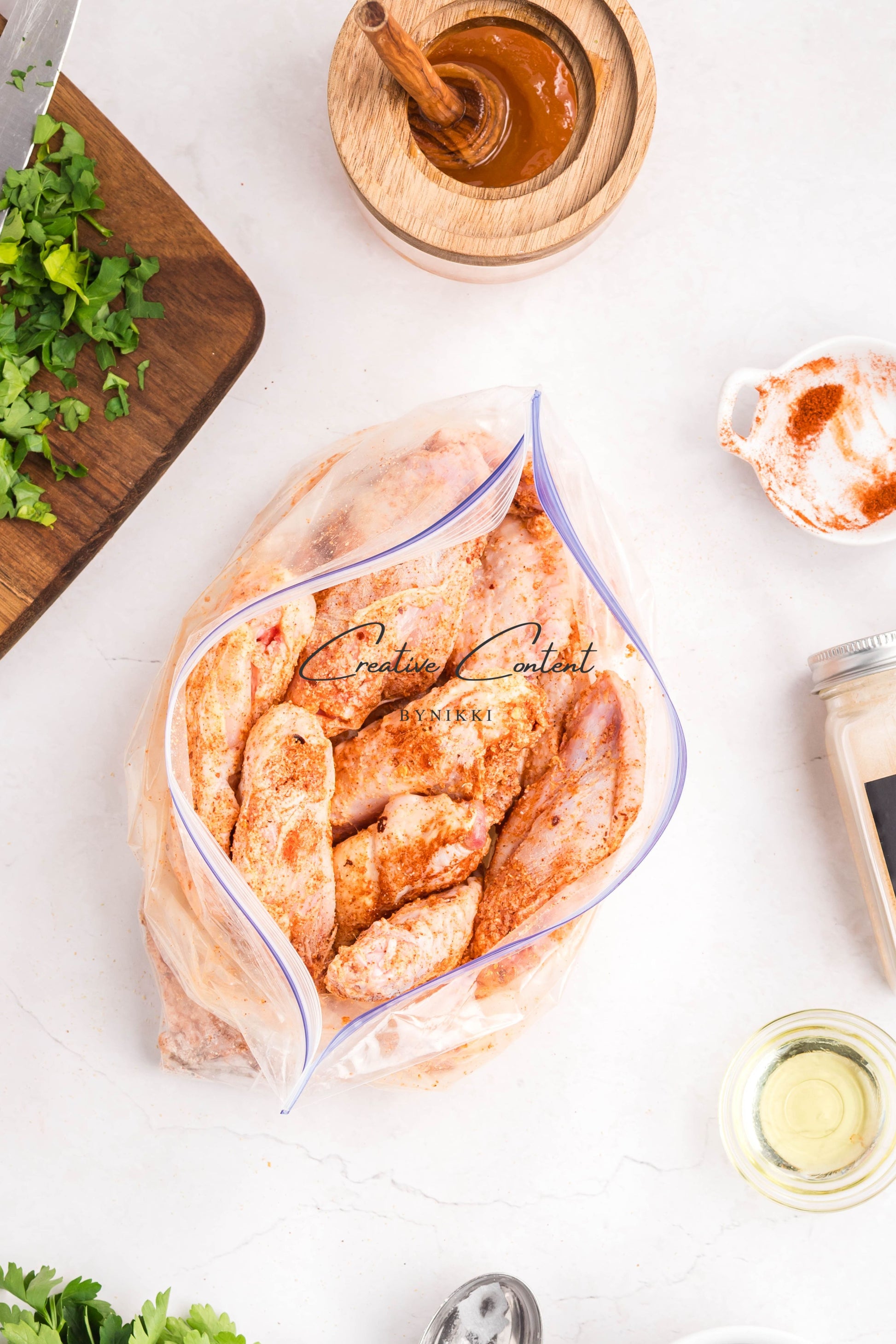 - Ingredients: Frozen chicken wings, baking powder, sweet paprika, garlic powder, onion powder, red pepper flakes, avocado oil, barbecue sauce, parsley, mayonnaise, sour cream, buttermilk, dried dill, lemon juice, dried parsley, garlic powder, onion powder, salt, black pepper