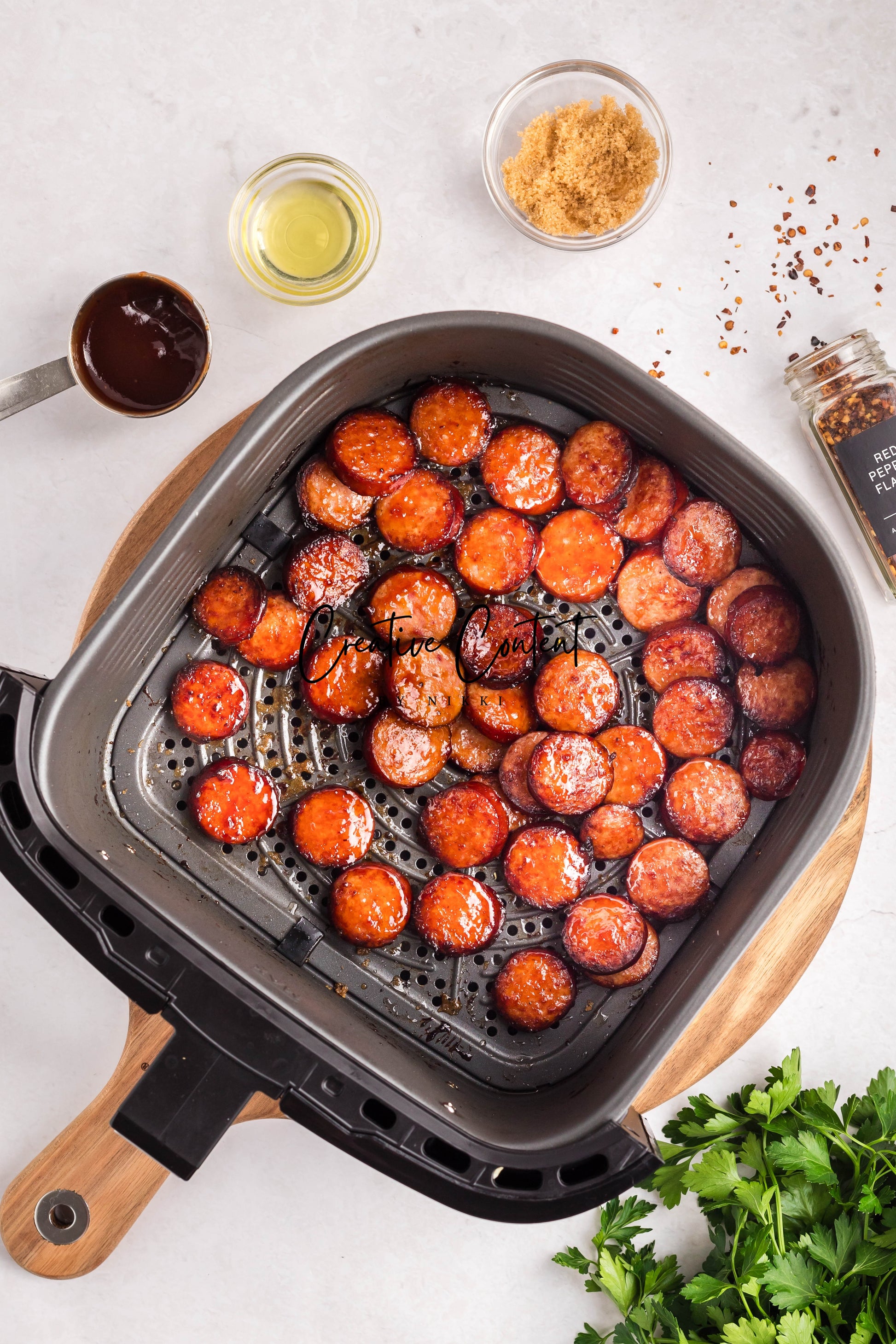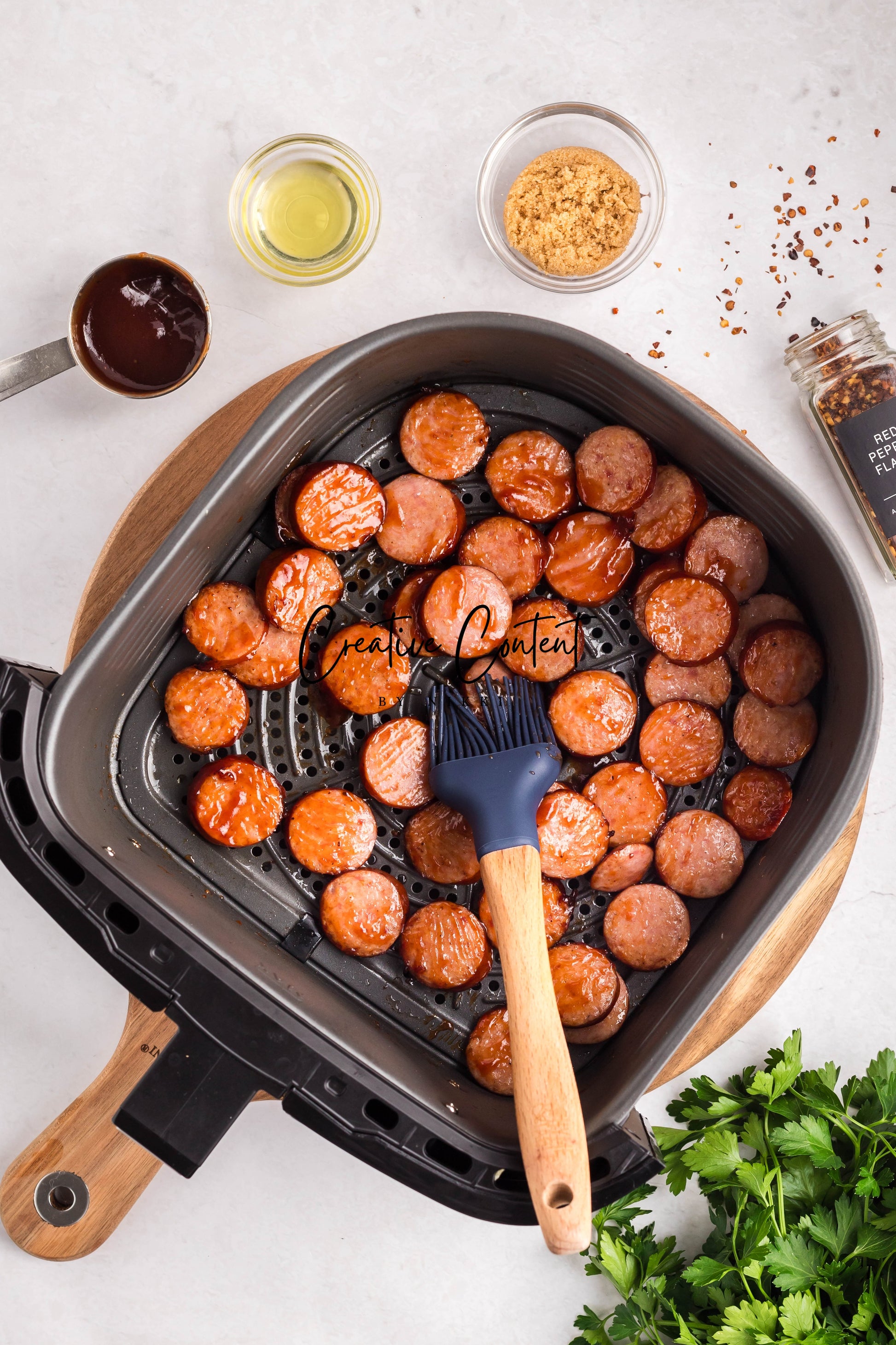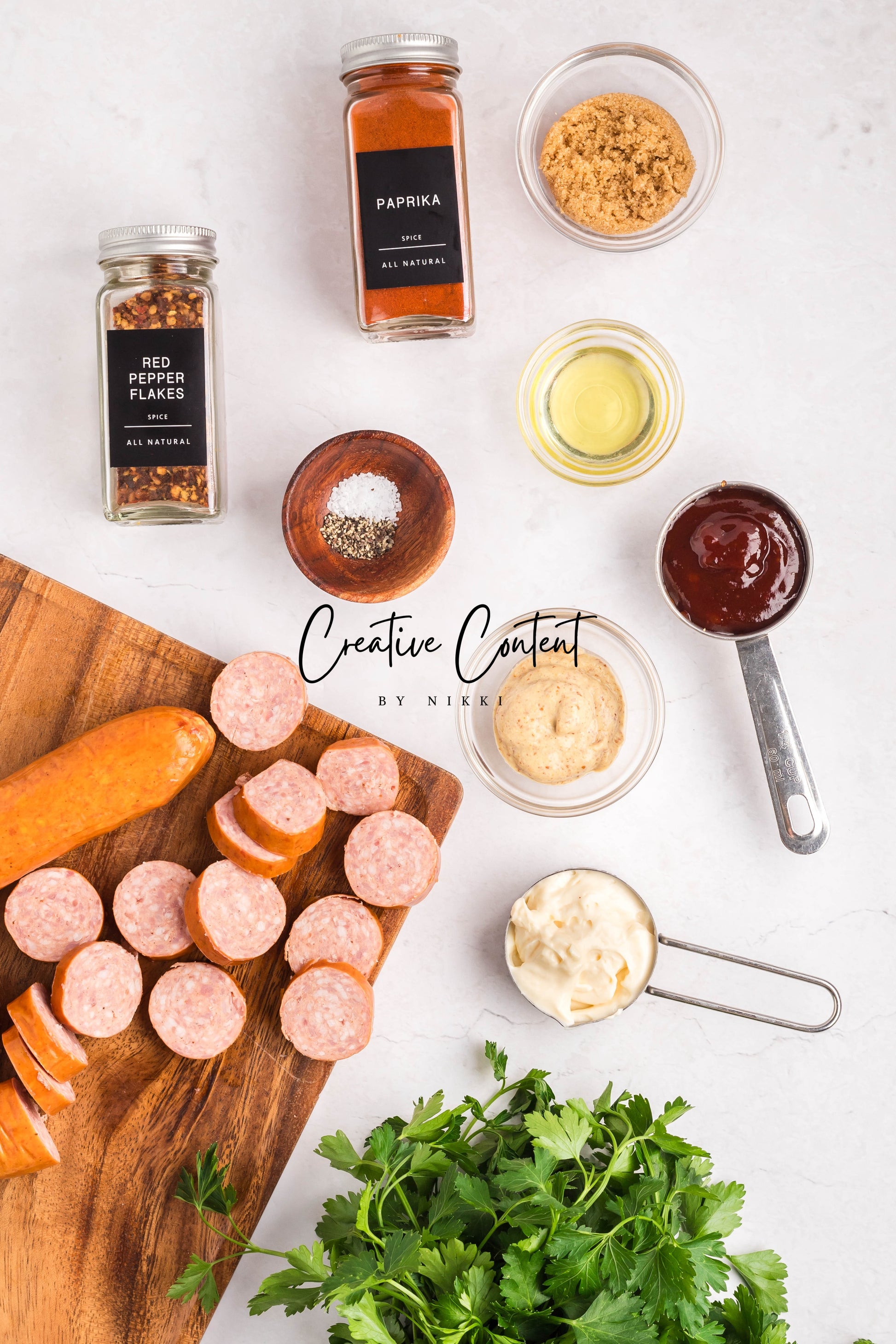 - Ingredients: kielbasa, avocado oil, barbecue sauce, light brown sugar, red pepper flakes, mayonnaise, Dijon mustard, parsley, paprika, salt, and pepper.