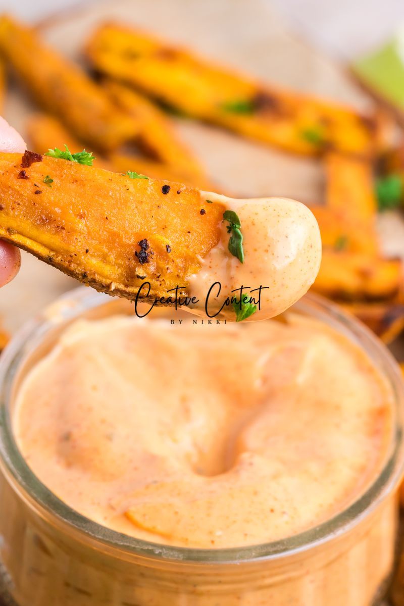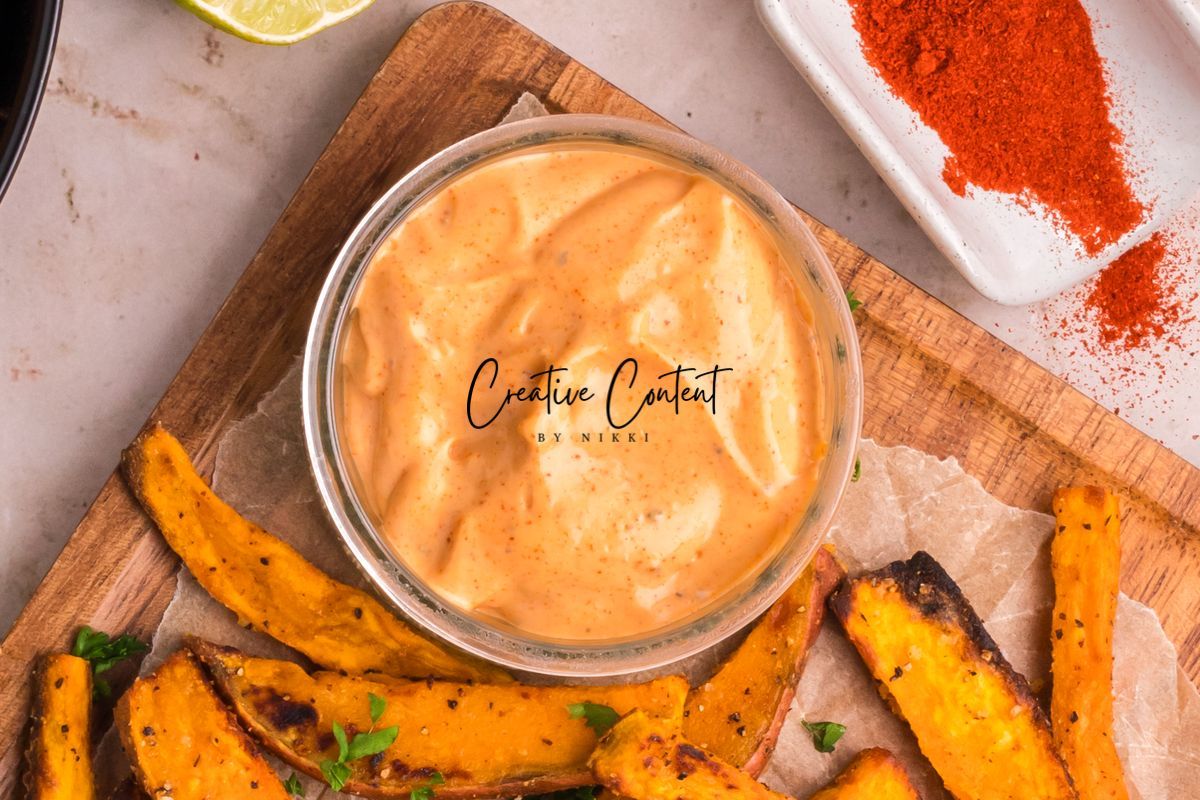 - Featured Ingredients; mayonnaise, ketchup, lime juice, hot sauce, chili powder, paprika, garlic powder, garlic cloves, lemon juice, dried dill, sweet potatoes, avocado oil, cornstarch, onion powder, red pepper flakes, and parsley.