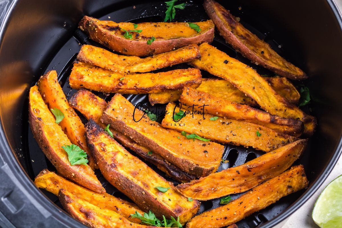 These air fryer sweet potato wedges are crispy and flavored with onion powder, garlic powder, and red pepper flakes. Enjoy these sweet potato wedges with the spicy mayo. One sauce is spicy and the other sauce is garlic-infused. These sweet potato wedges are great as an appetizer or as a side with your burger or a chicken sandwich. In just 25 minutes you will have an amazing appetizer or side dish.