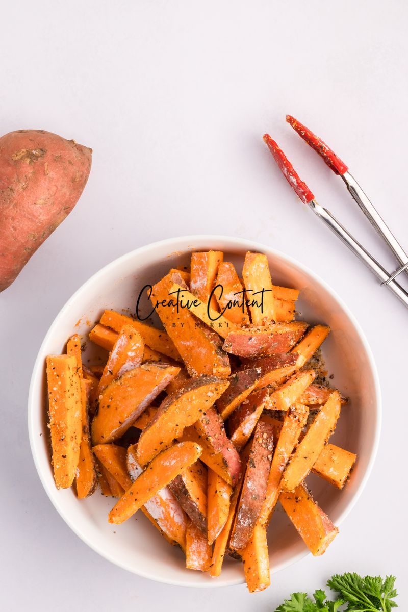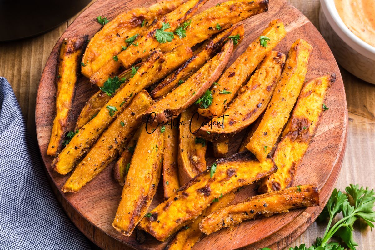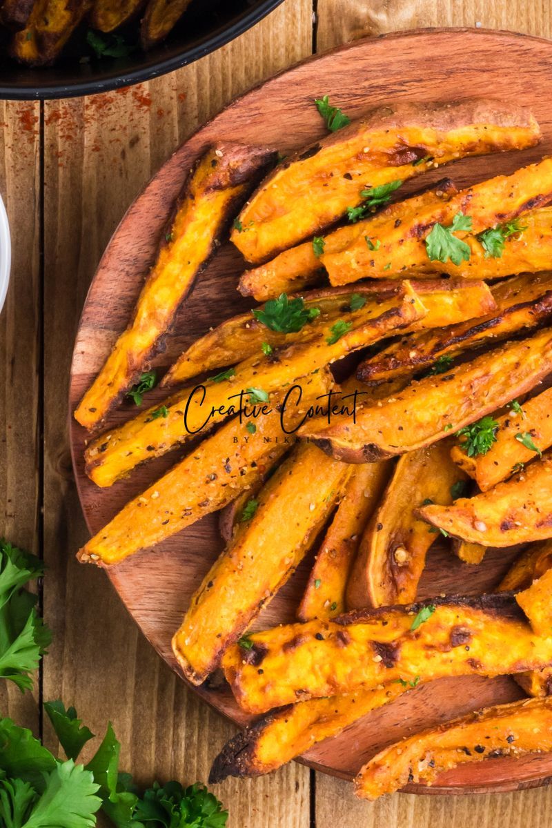 These air fryer sweet potato wedges are crispy and flavored with onion powder, garlic powder, and red pepper flakes. Enjoy these sweet potato wedges with the spicy mayo. One sauce is spicy and the other sauce is garlic-infused. These sweet potato wedges are great as an appetizer or as a side with your burger or a chicken sandwich. In just 25 minutes you will have an amazing appetizer or side dish.