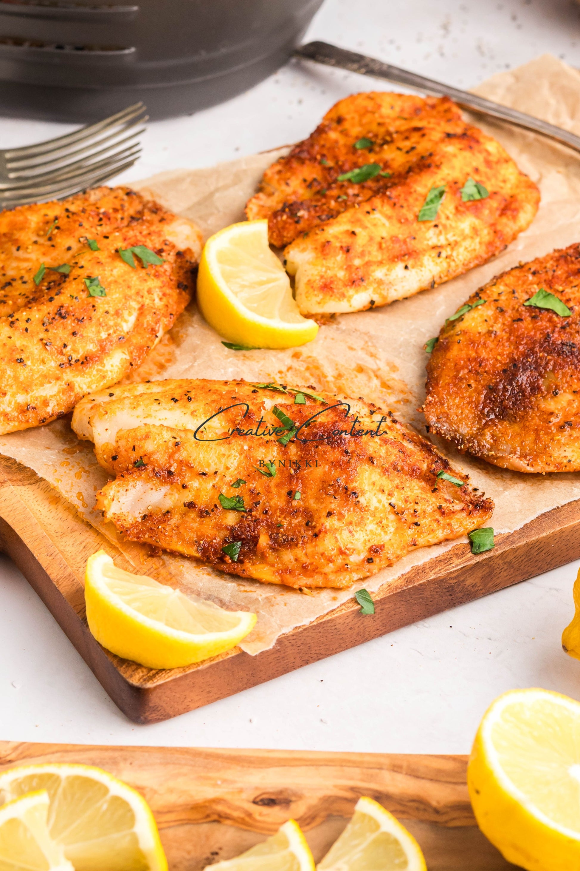 - Ingredients: Tilapia, avocado oil, paprika, kosher salt, black pepper, garlic powder, onion powder, parsley, lemon.