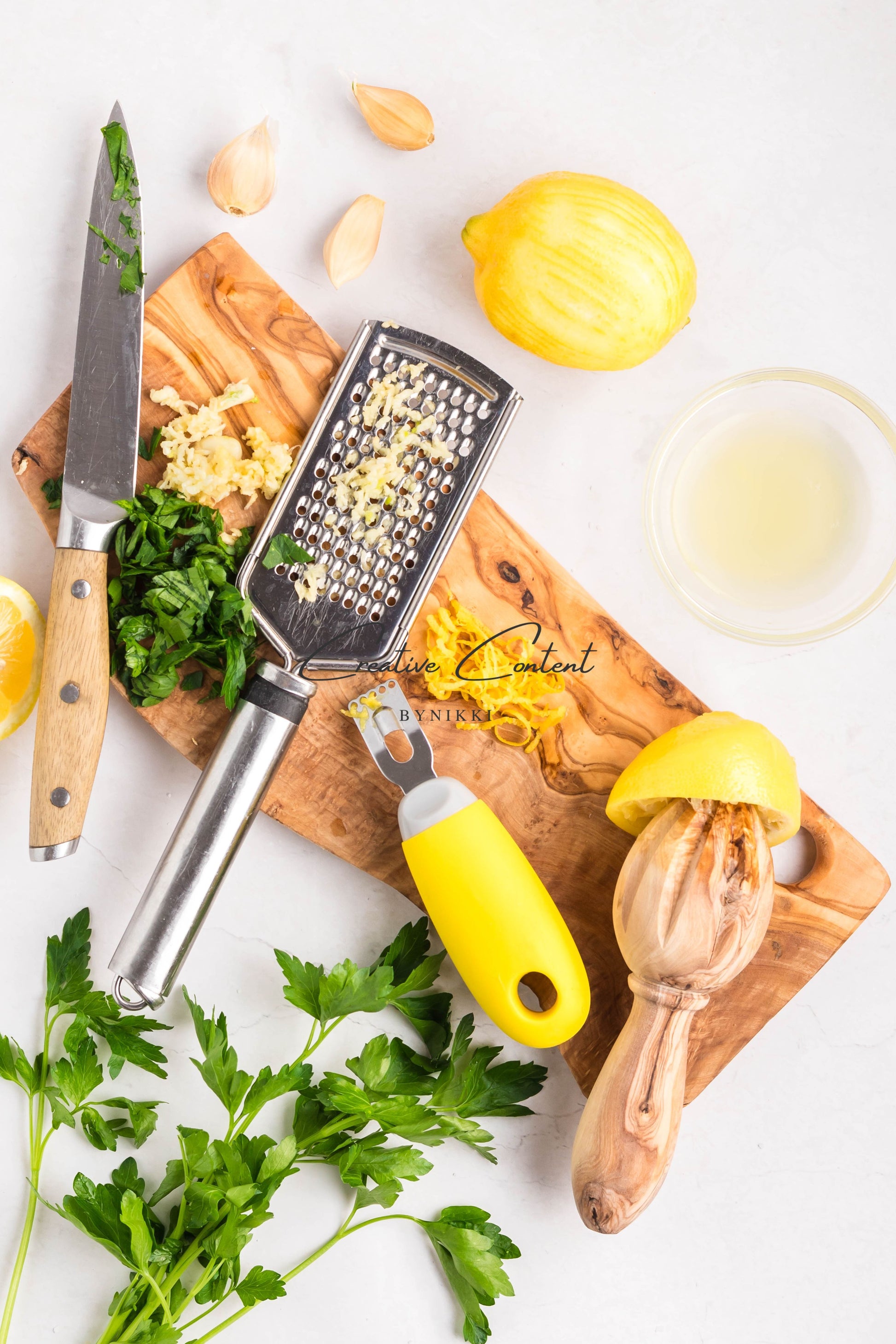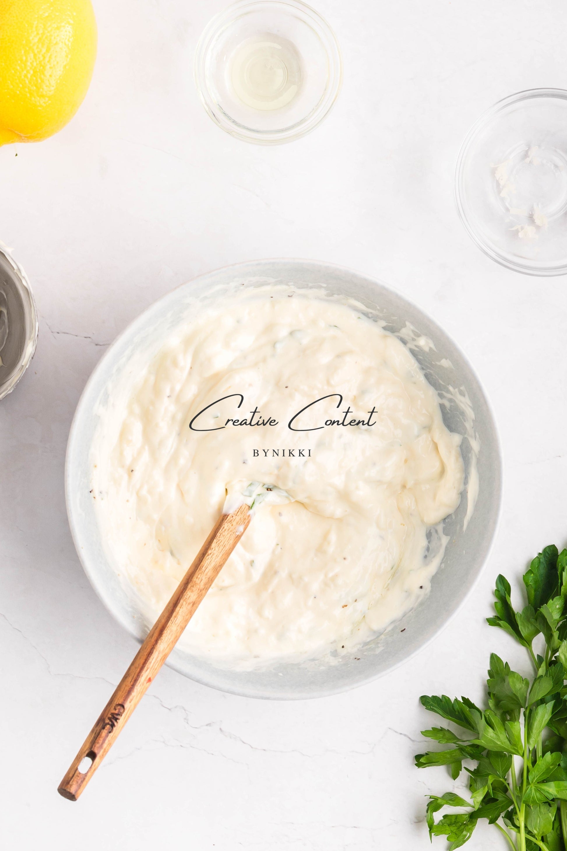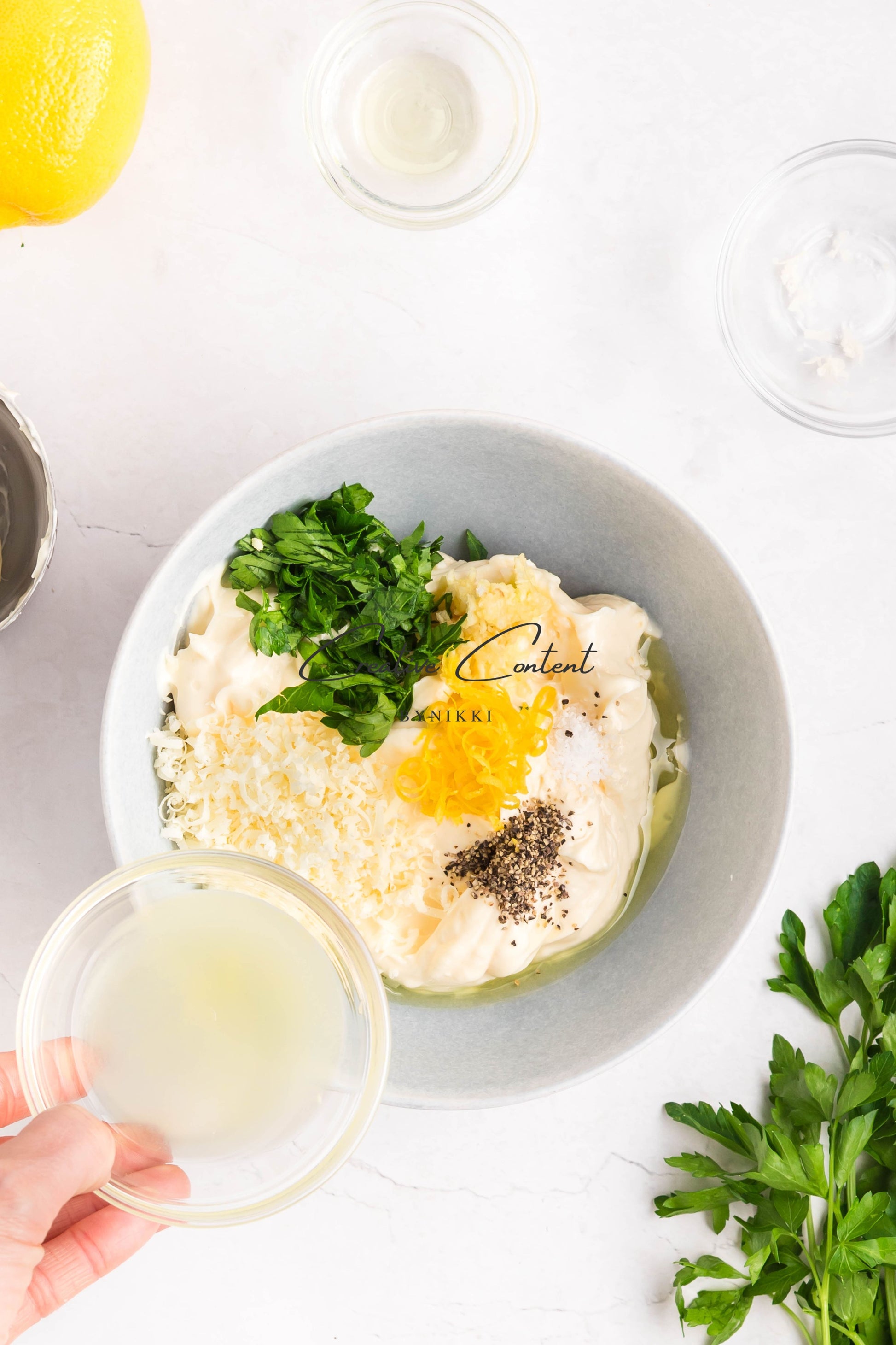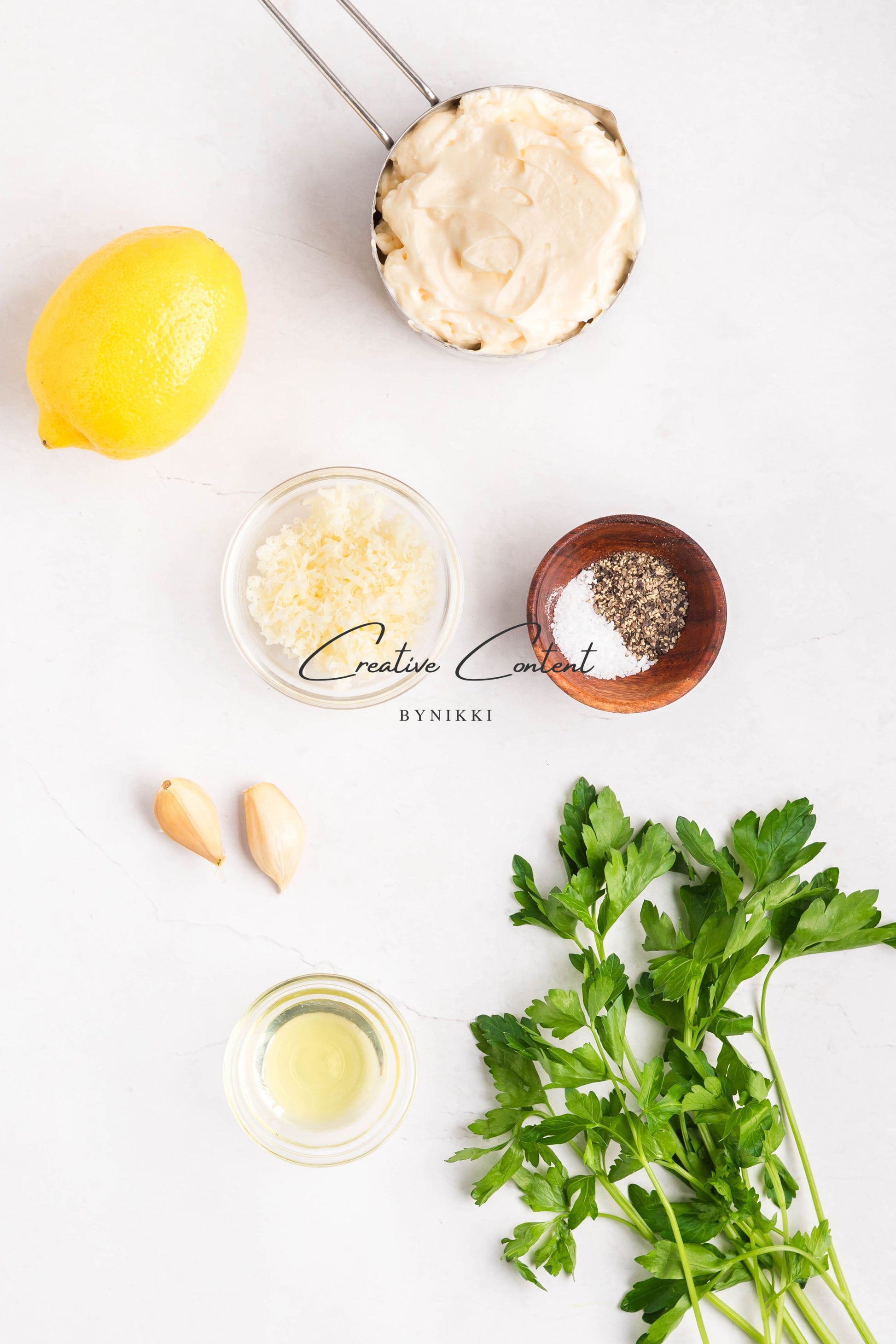 - Mayonnaise, garlic cloves, lemon juice, lemon zest, olive oil, parsley, parmesan cheese, coarse kosher salt, black pepper, zucchini, coarse kosher salt, eggs, water, panko bread crumbs, grated parmesan cheese, Italian breadcrumbs, garlic powder, avocado oil, all-purpose flour.