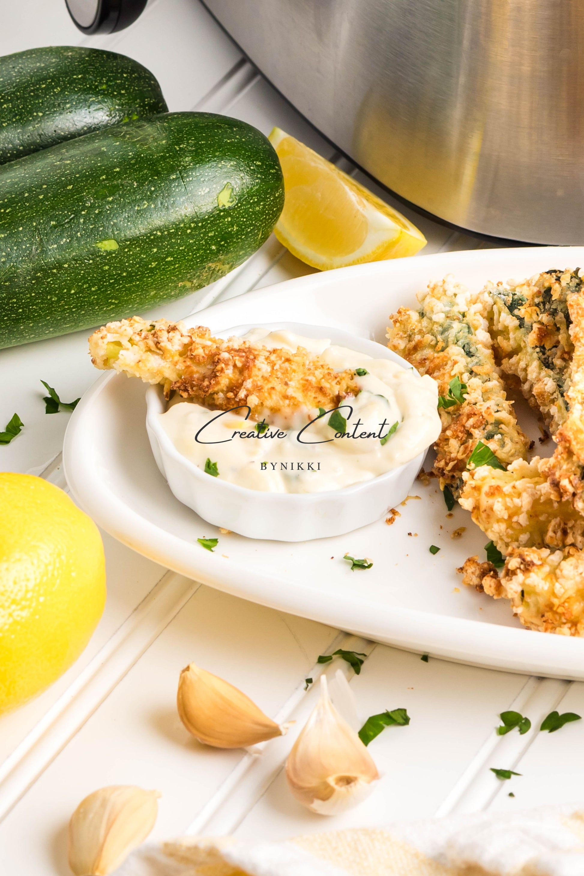 These Air Fryer Zucchini Fries paired with Garlic Lemon Aioli are a perfect combination of crispy and flavorful. The zucchini fries are lightly seasoned and cooked to perfection in the air fryer, giving them a golden crunch without all the oil. The garlic lemon aioli adds a refreshing, tangy kick that complements the savory fries beautifully.