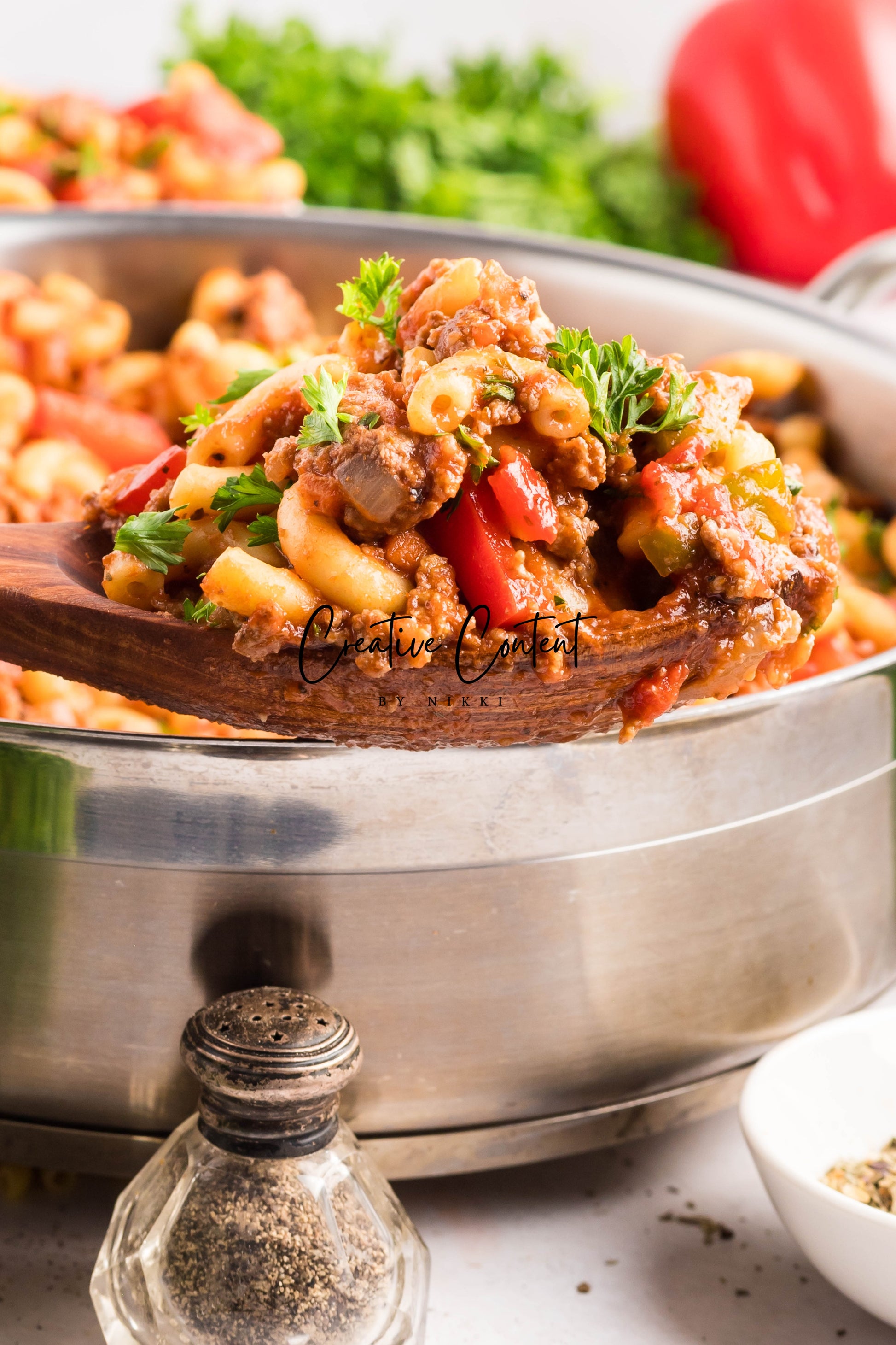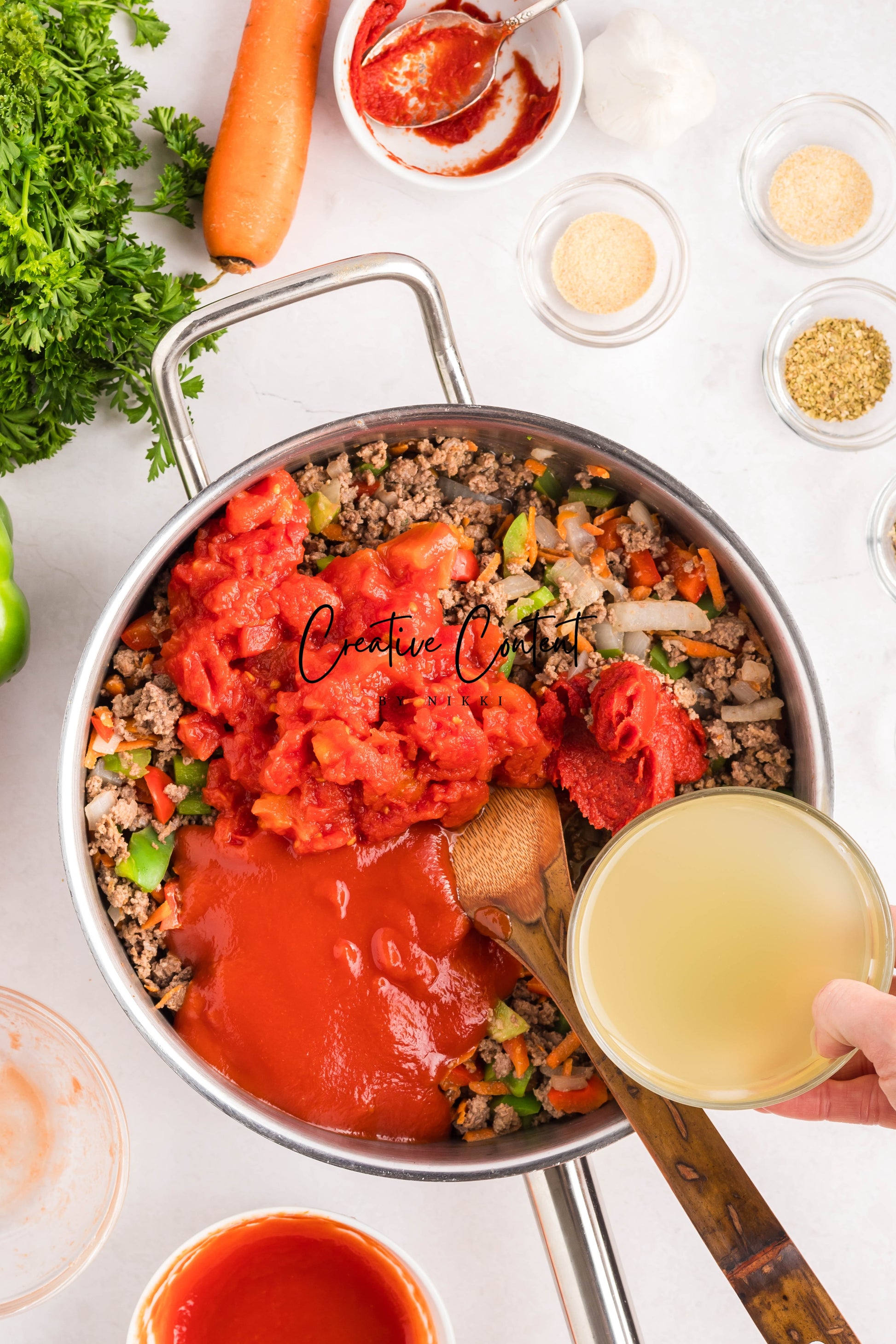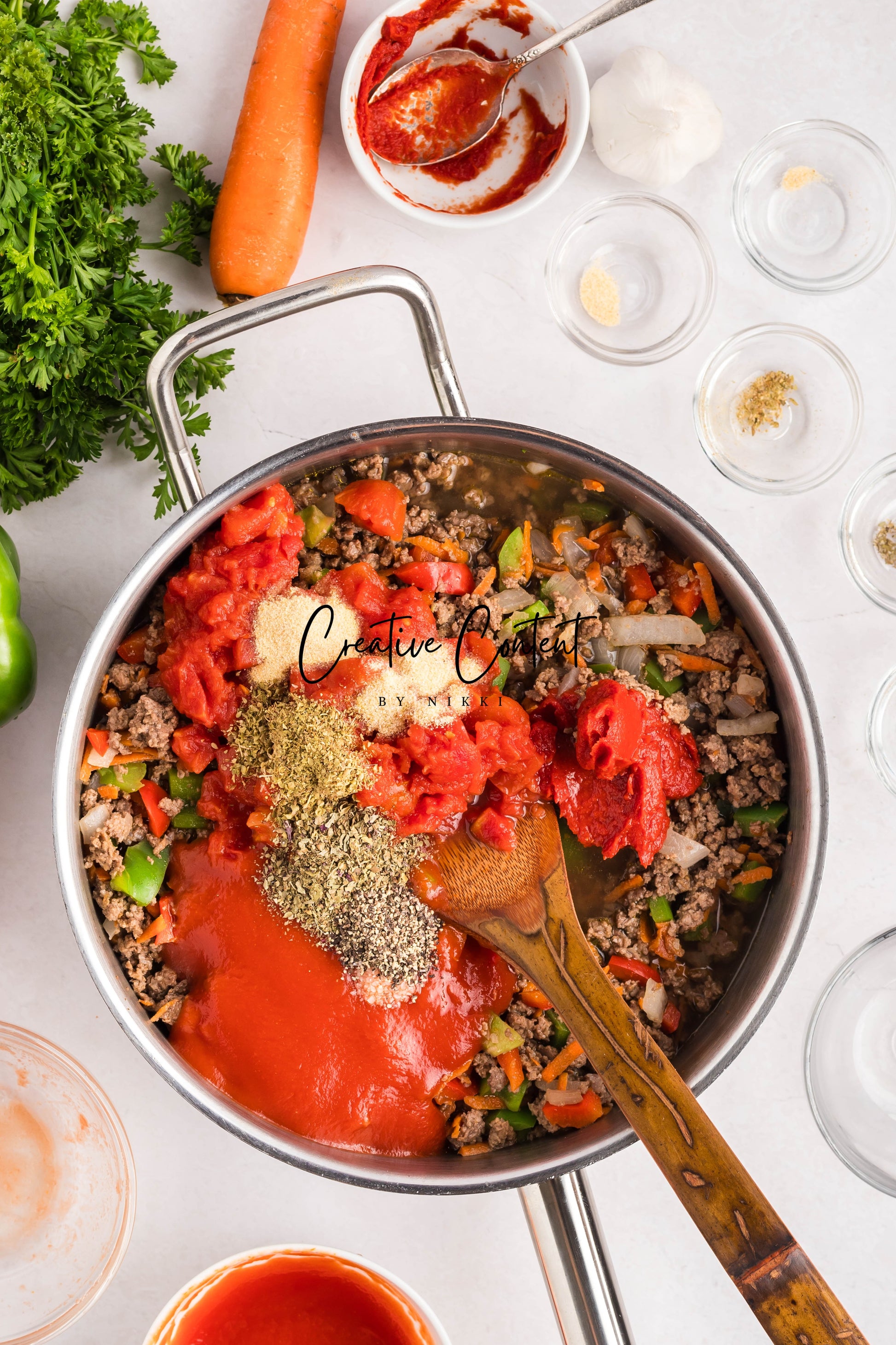 - Featured Ingredients; Ground beef, yellow onion, green bell pepper, red bell pepper, carrot, garlic, diced tomatoes, tomato sauce, chicken broth, tomato paste, dried oregano, dried basil, Worcestershire, garlic powder, onion powder, black pepper, coarse kosher salt, parsley