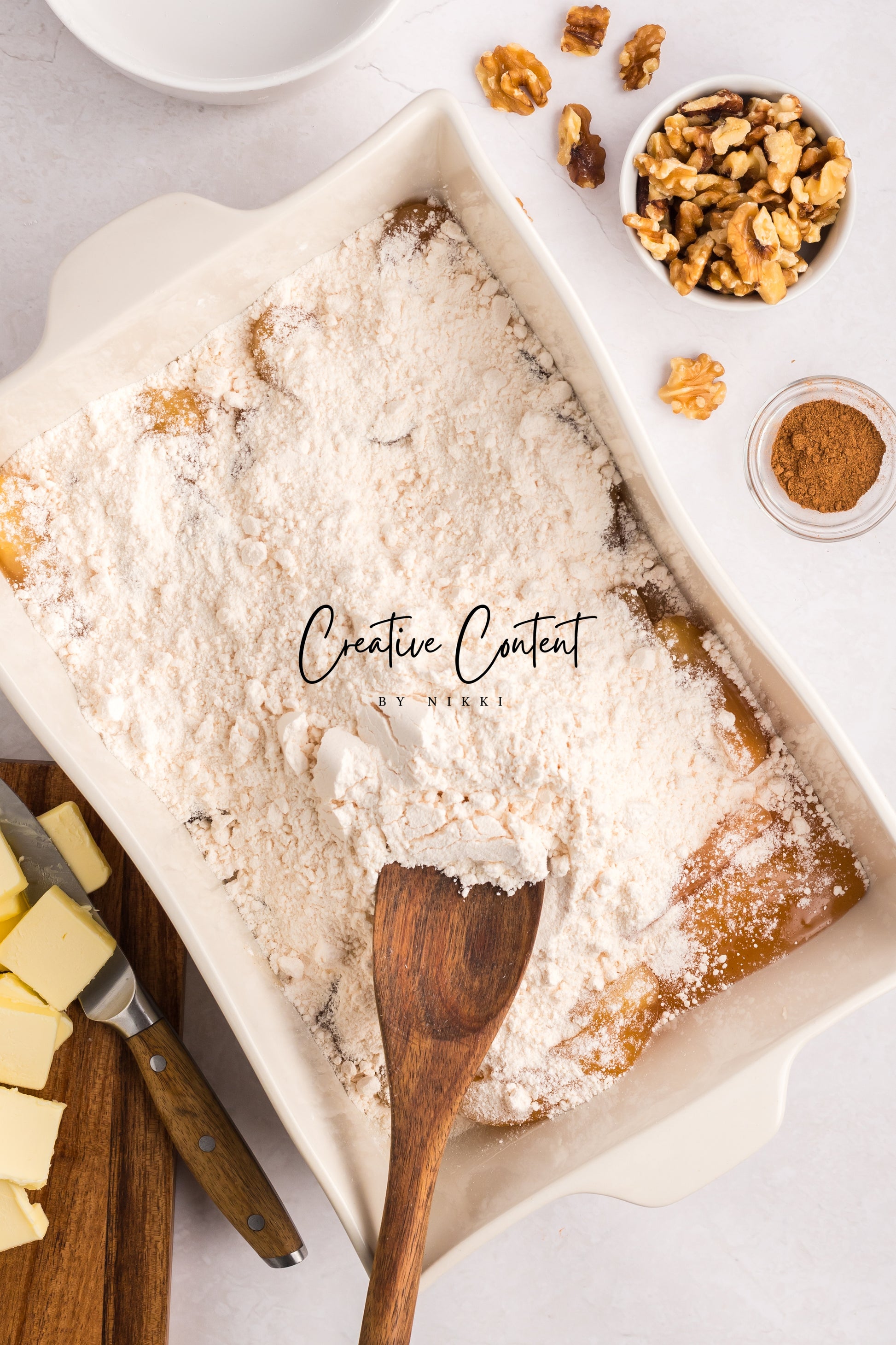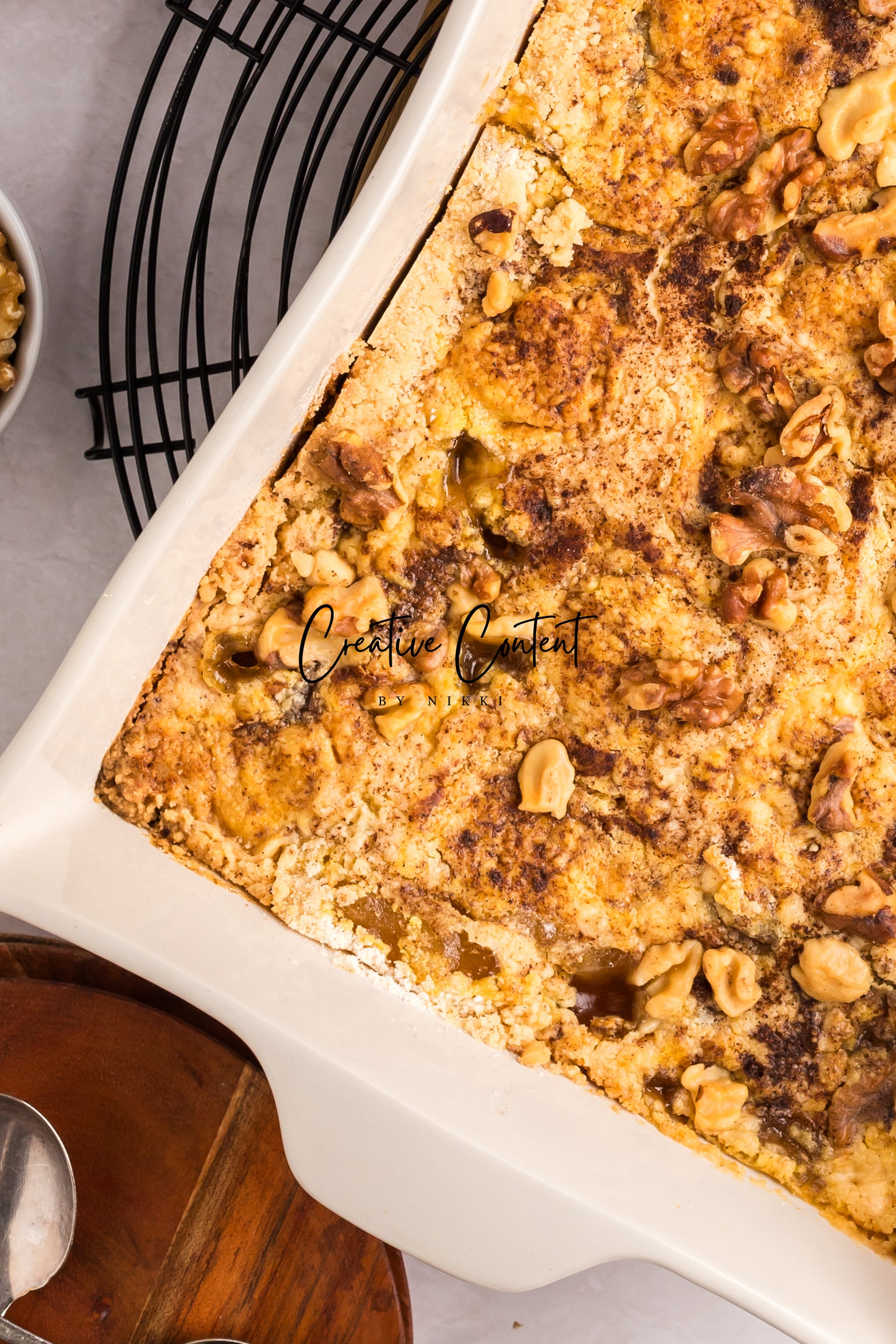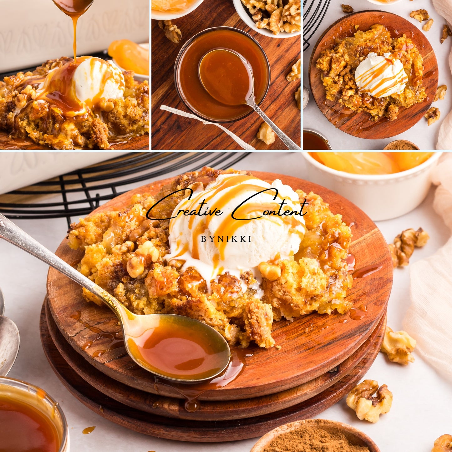 - Featured Ingredients; apple pie filling, spice mix, yellow cake mix, unsalted butter, walnuts, ice cream, granulated sugar, heavy cream, and coarse kosher salt.