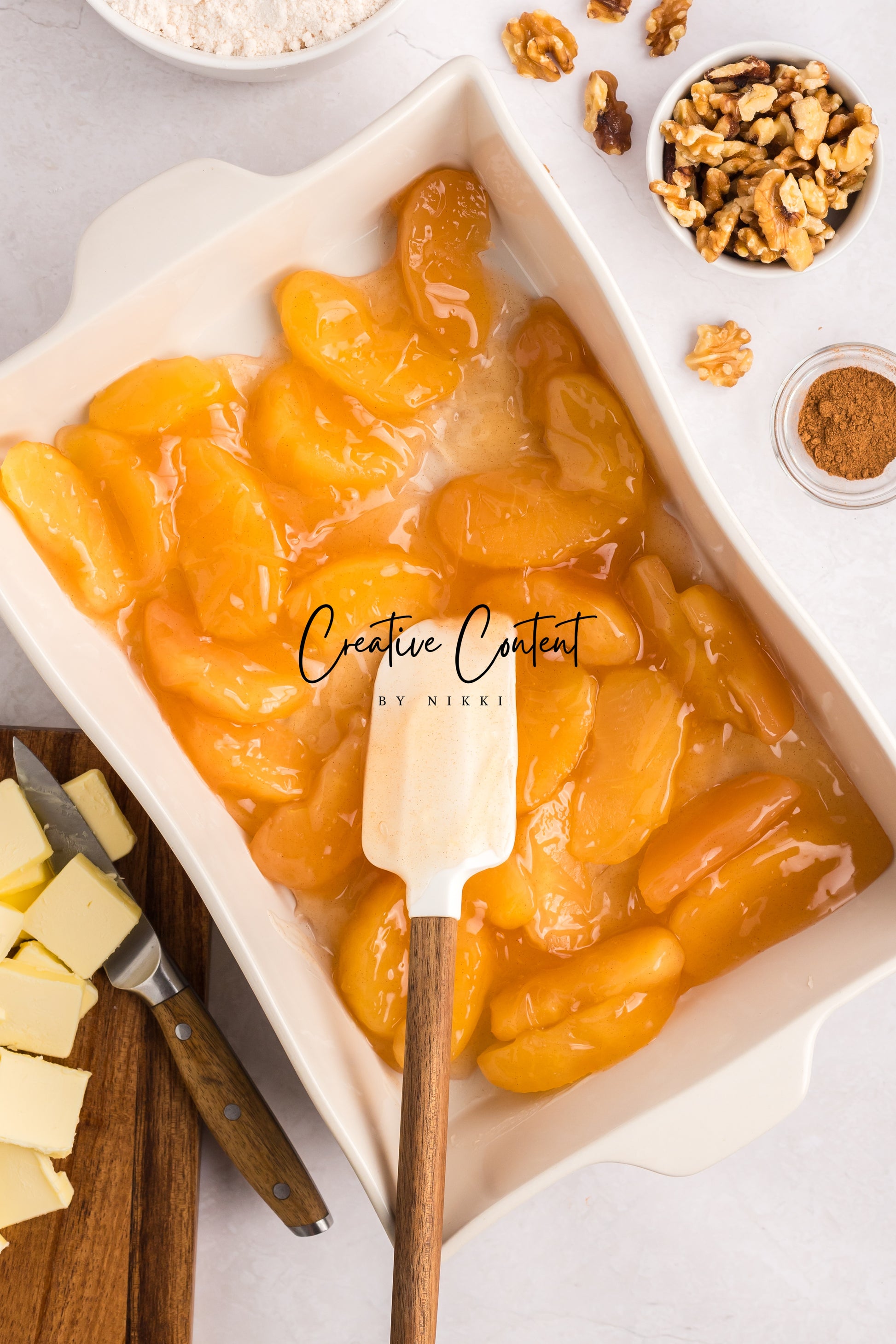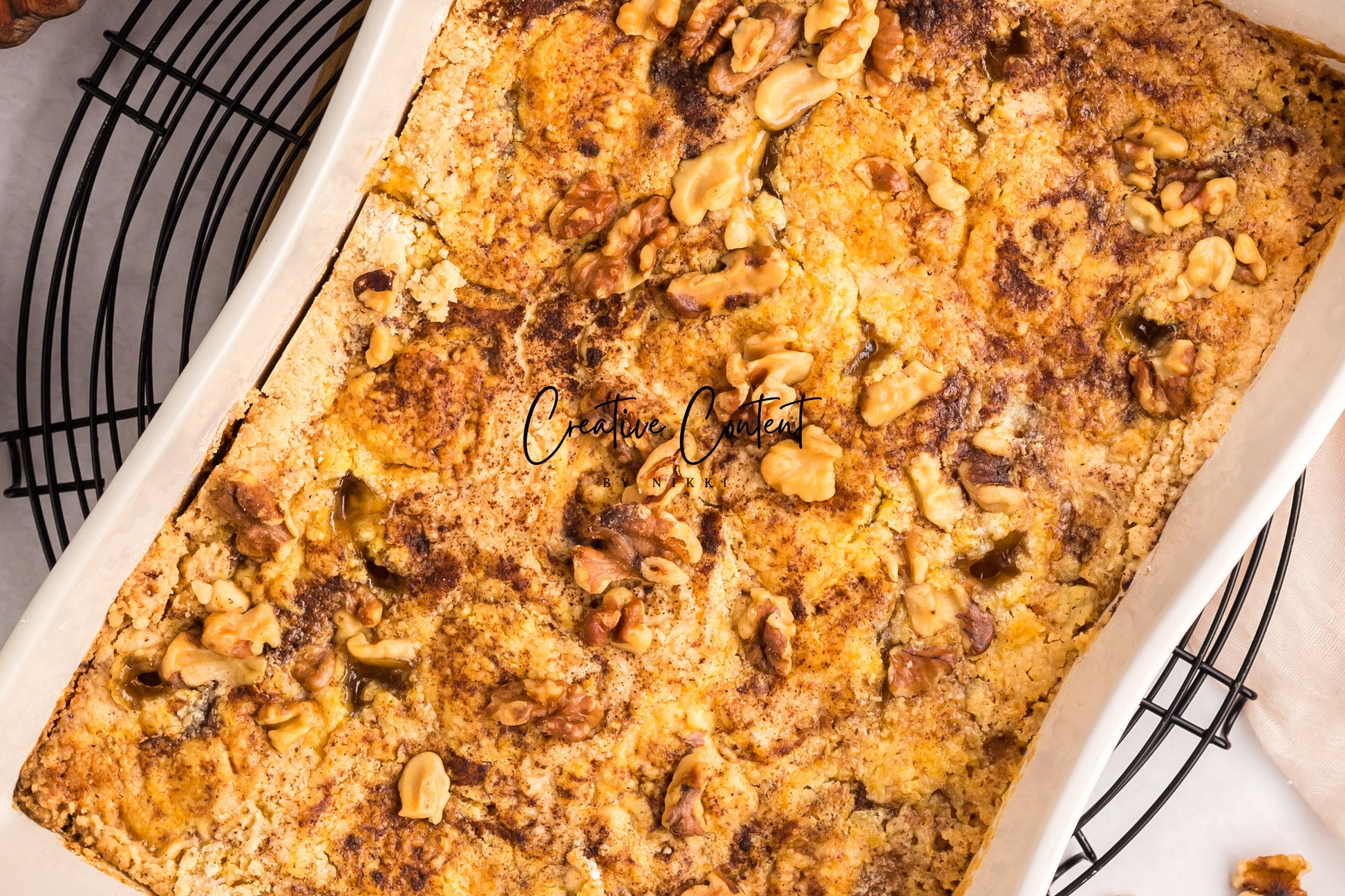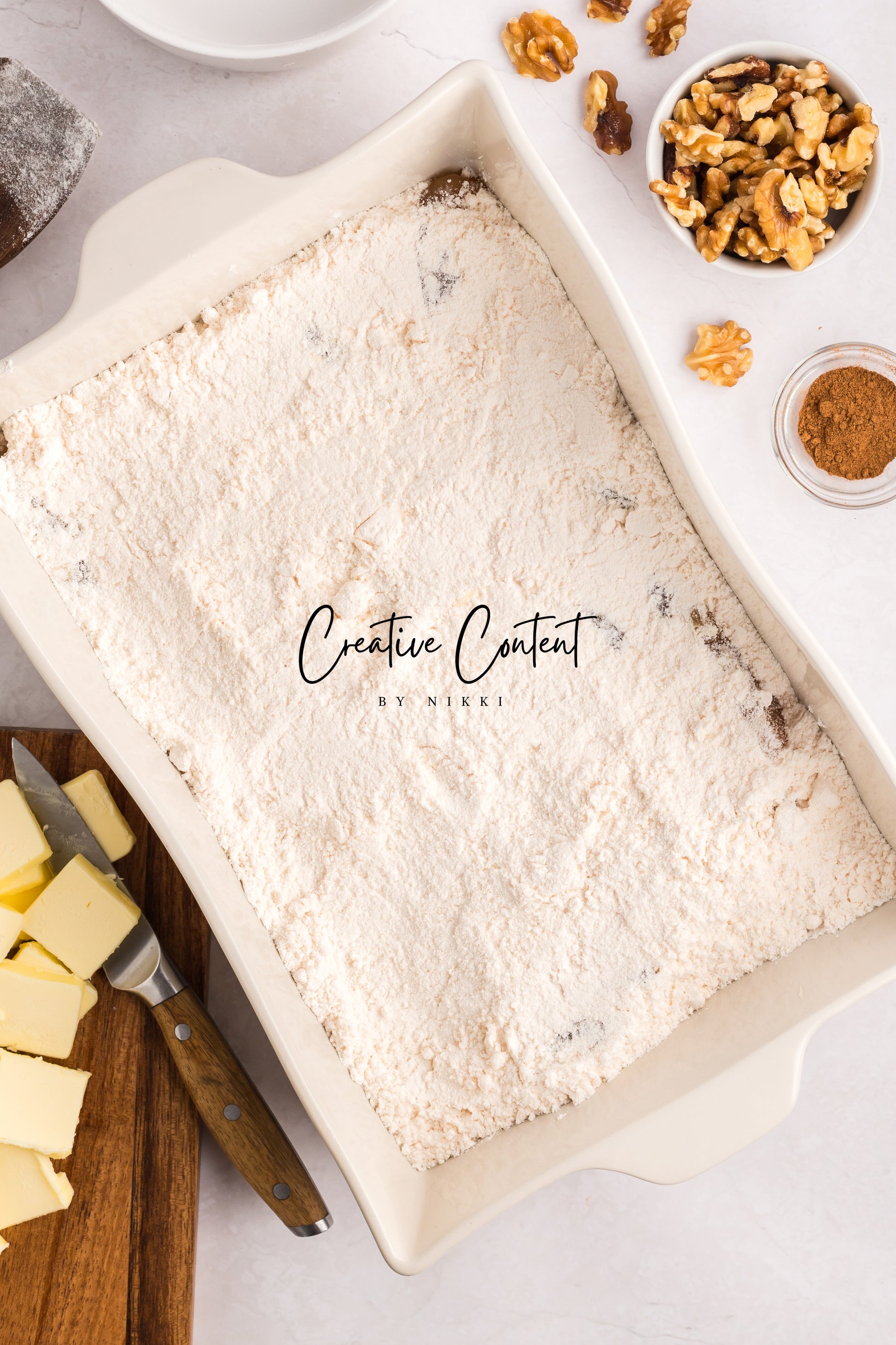 - Featured Ingredients; apple pie filling, spice mix, yellow cake mix, unsalted butter, walnuts, ice cream, granulated sugar, heavy cream, and coarse kosher salt.