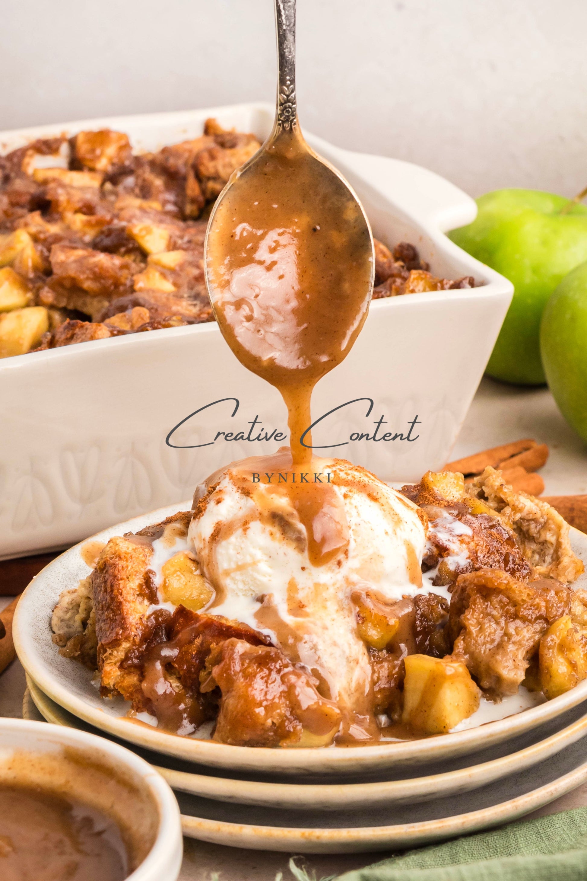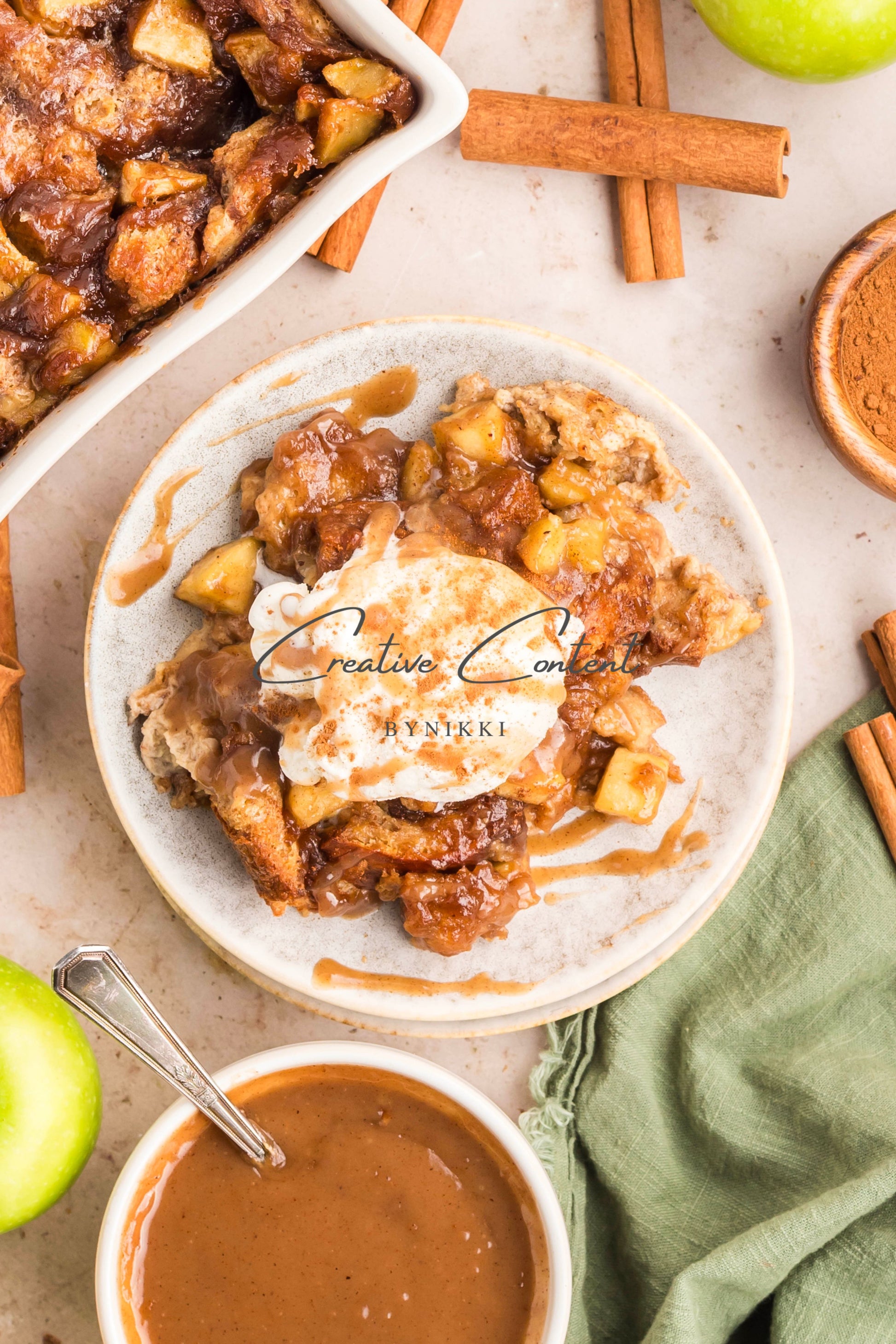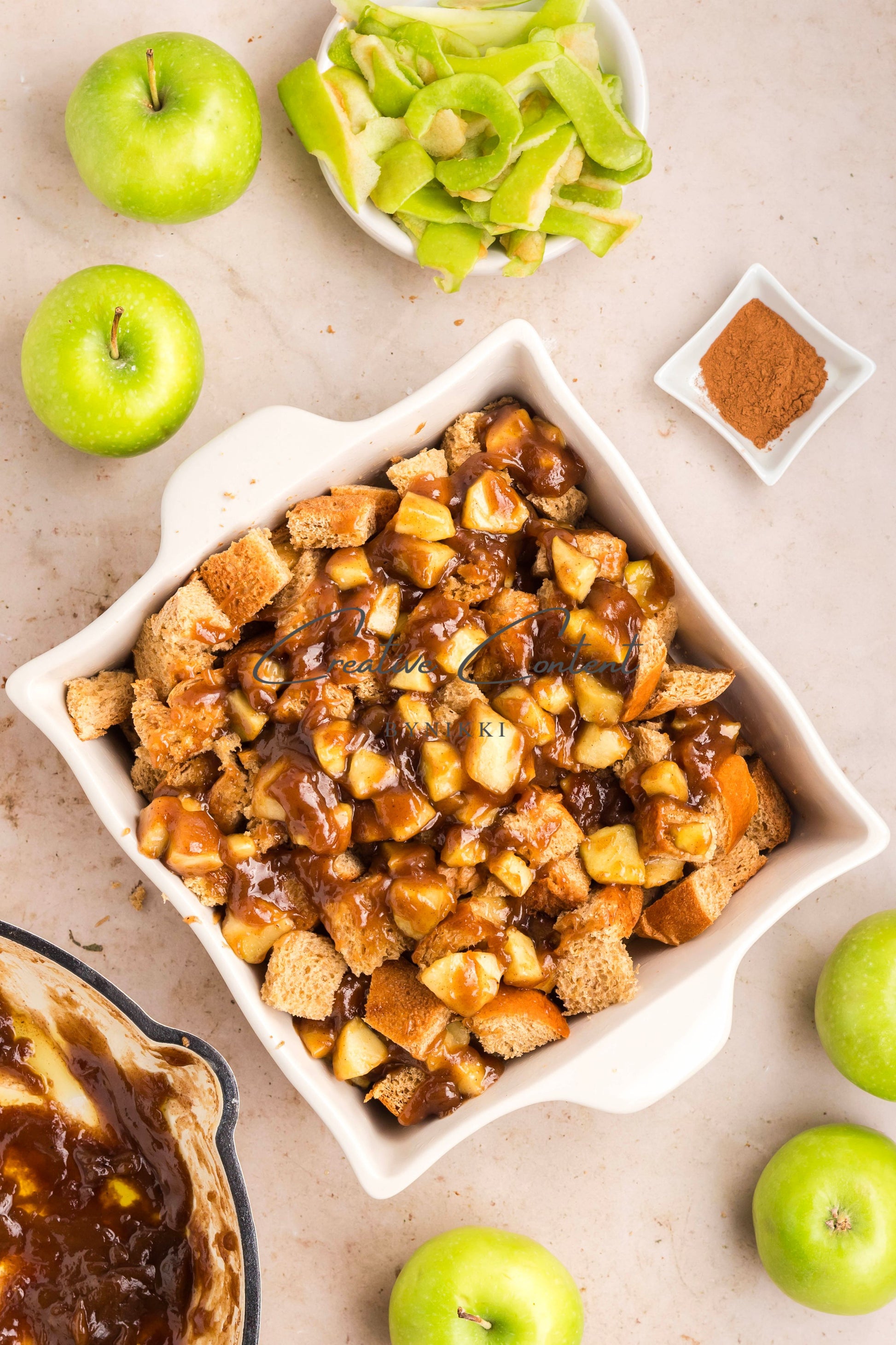 - Ingredients: cinnamon brioche bread, Granny Smith apples, unsalted butter, all-purpose flour, light brown sugar, water, apple pie spice, milk, heavy cream, granulated sugar, vanilla extract, cinnamon, eggs