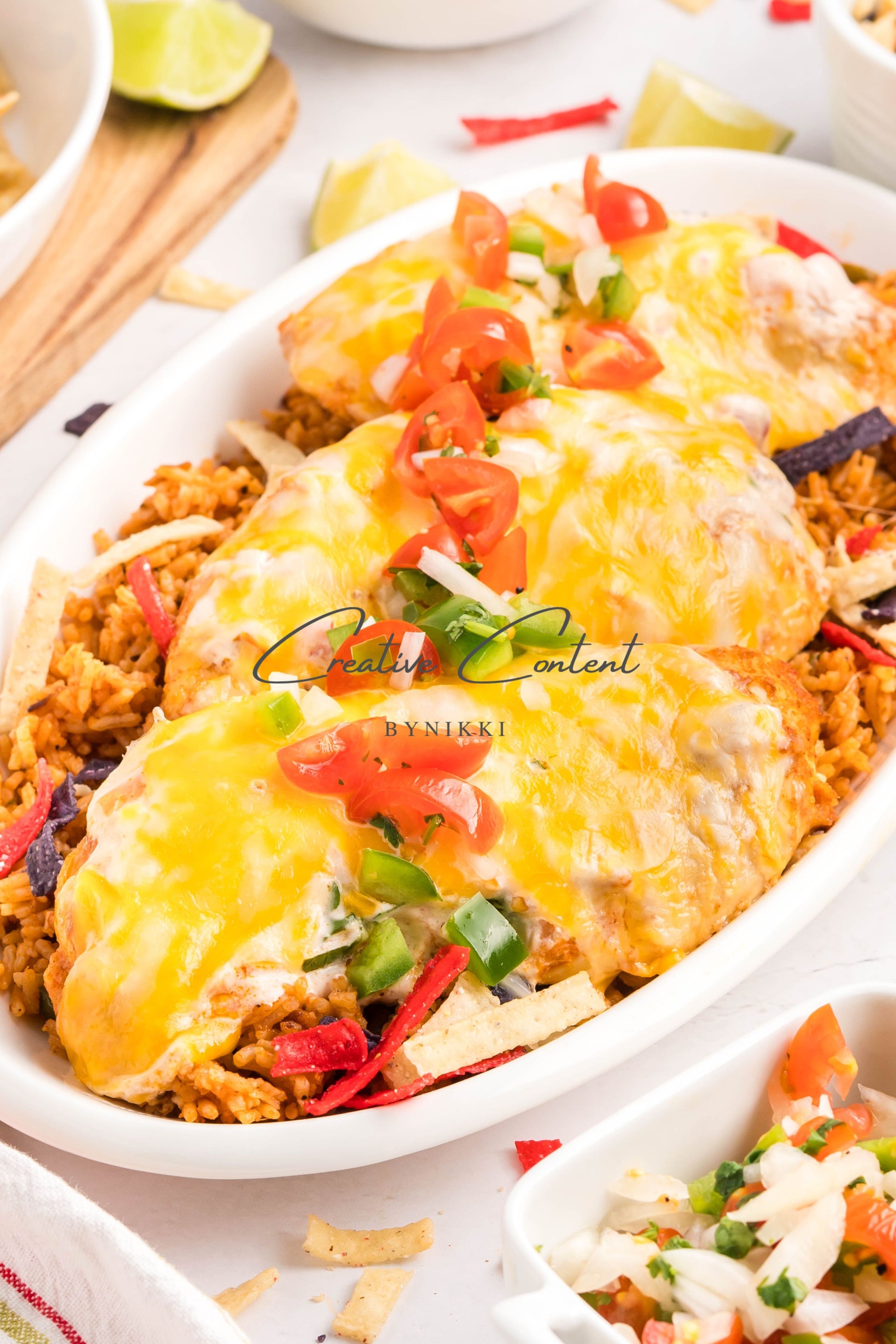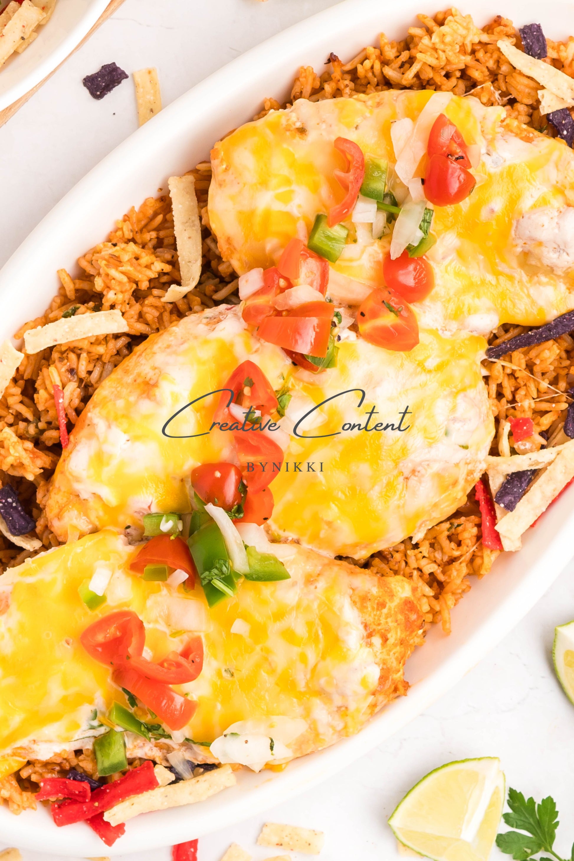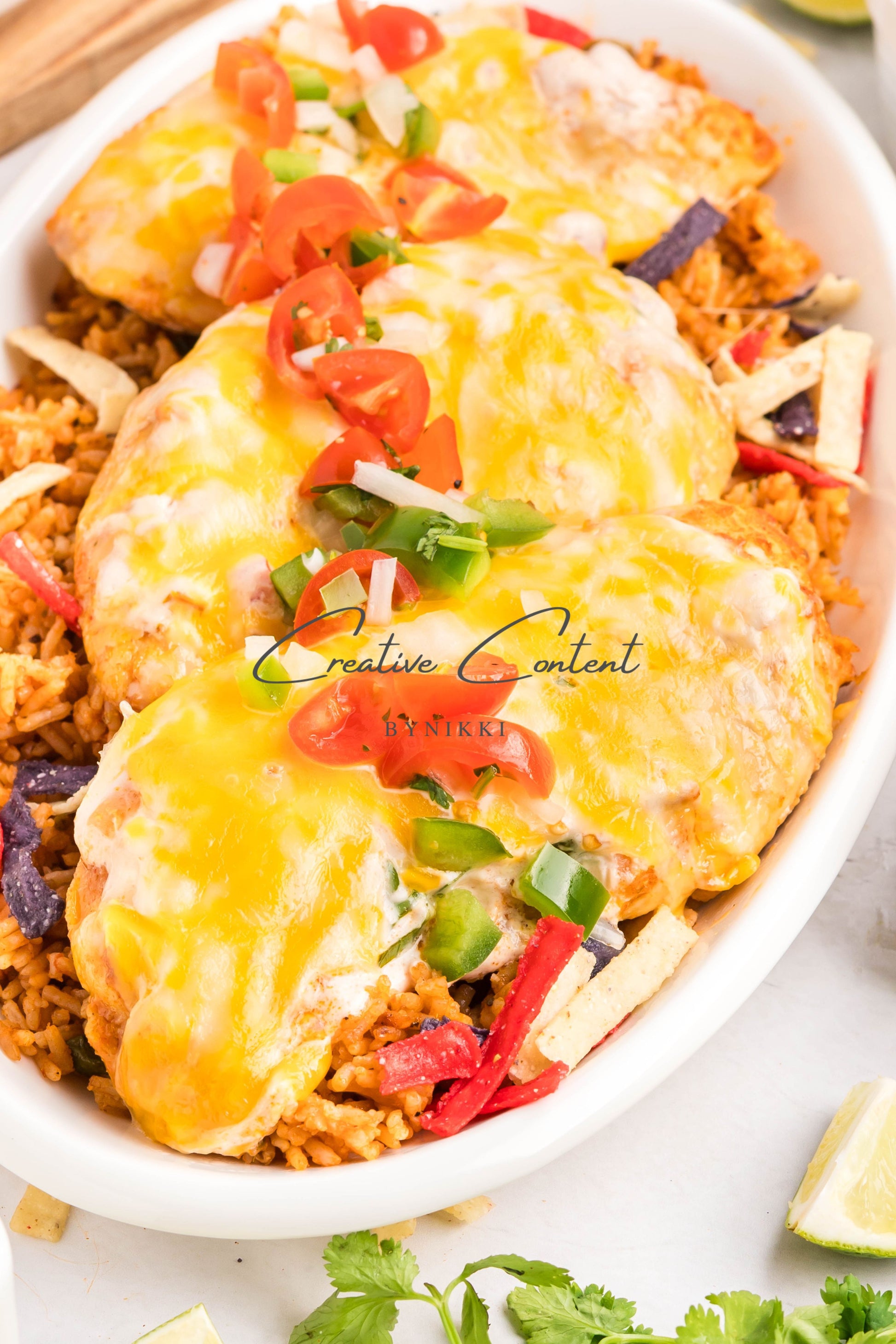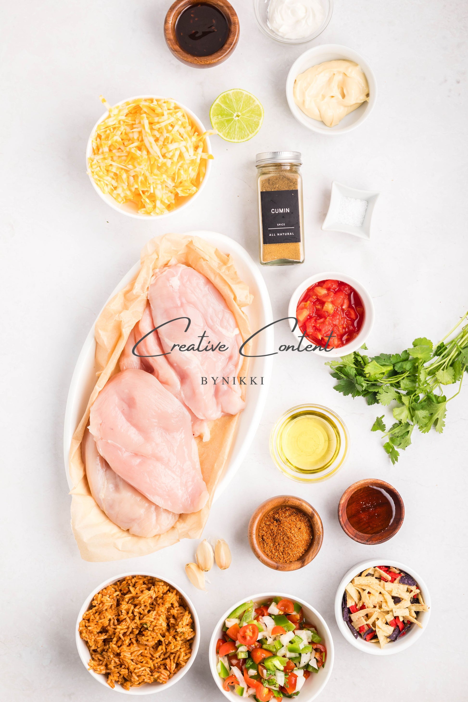 - Ingredients: Chicken breasts, halved, avocado oil, lime juice, garlic, teriyaki sauce, honey, taco seasoning, kosher salt, mayonnaise, salsa, sour cream, cilantro, lime juice, cumin, kosher salt, Colby Jack cheese