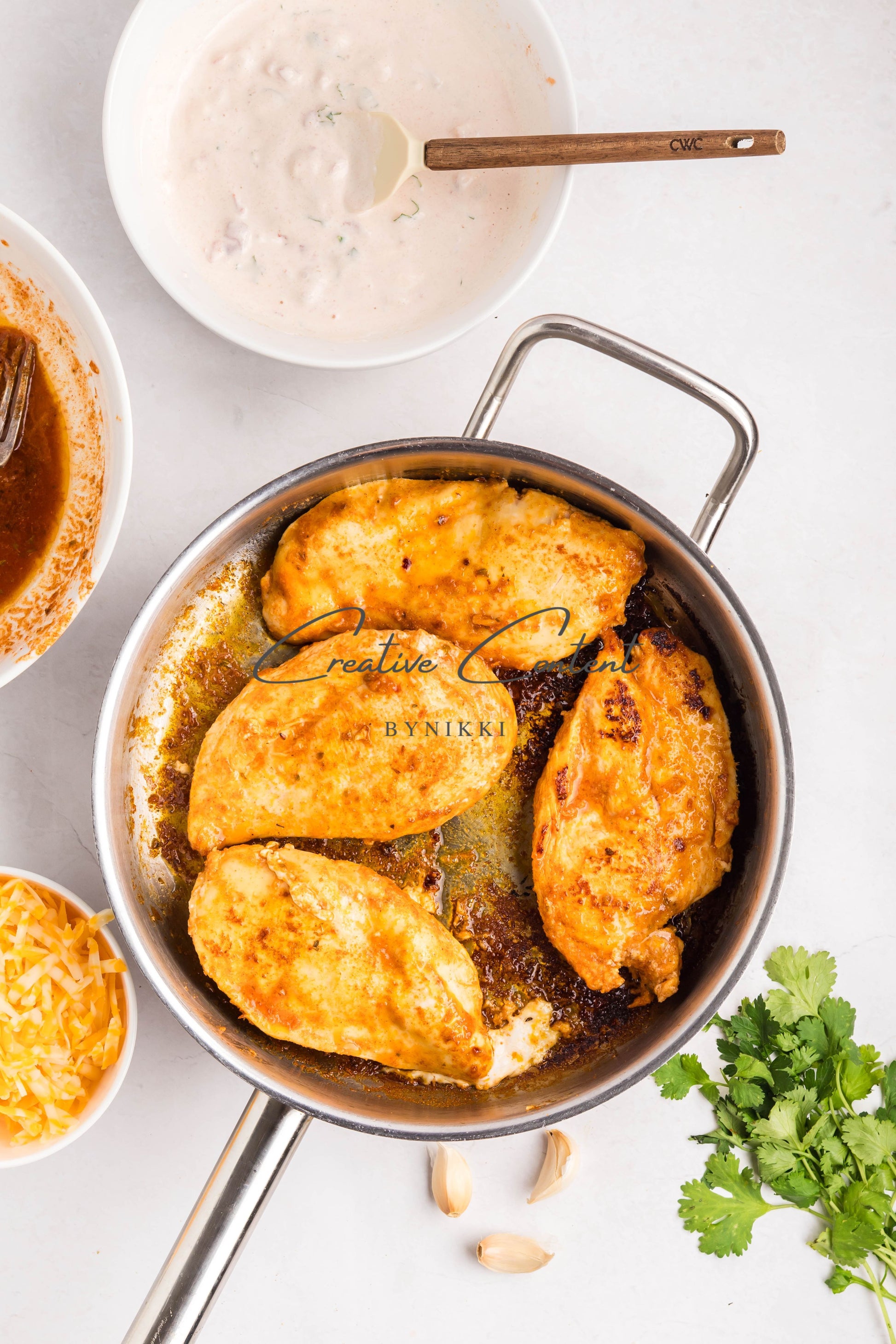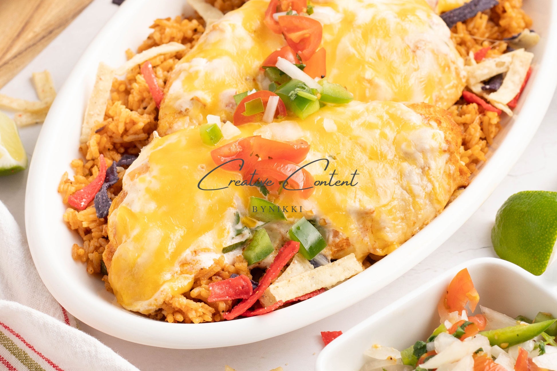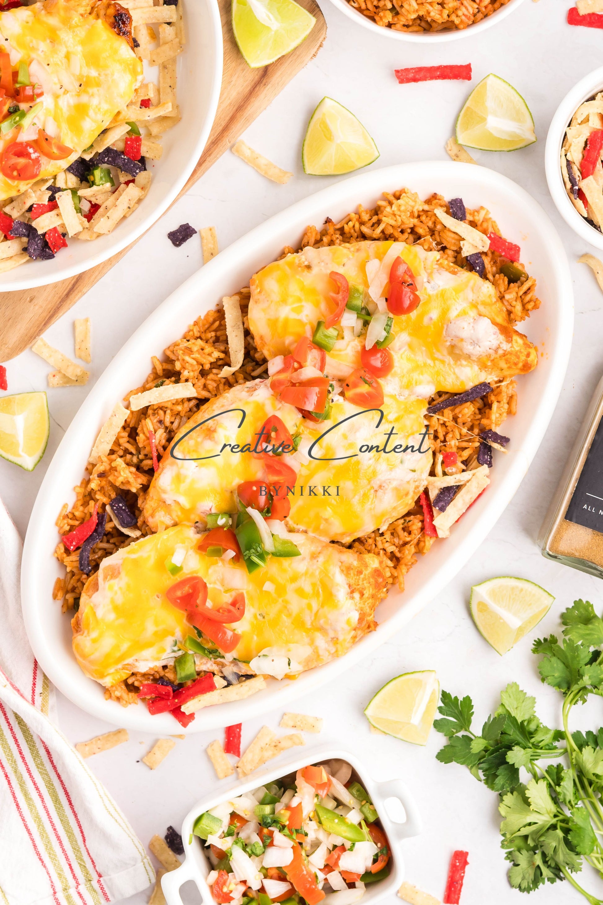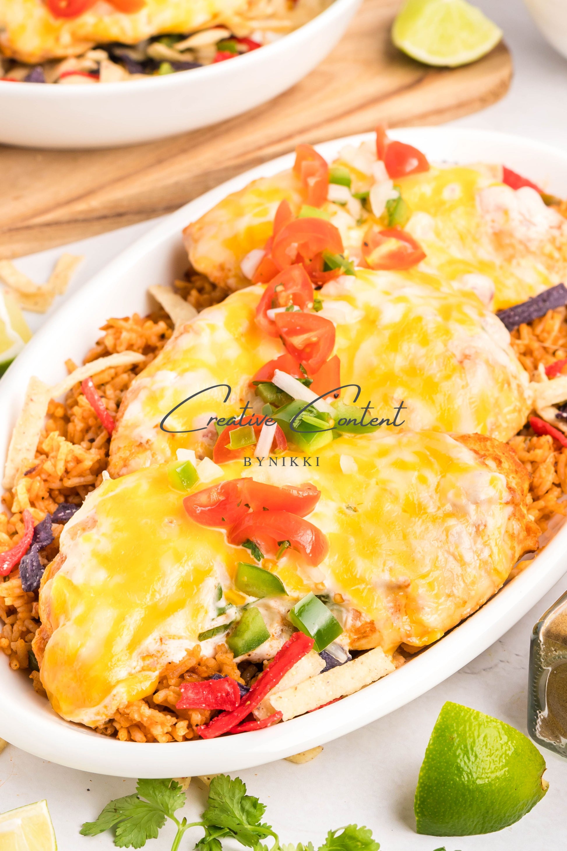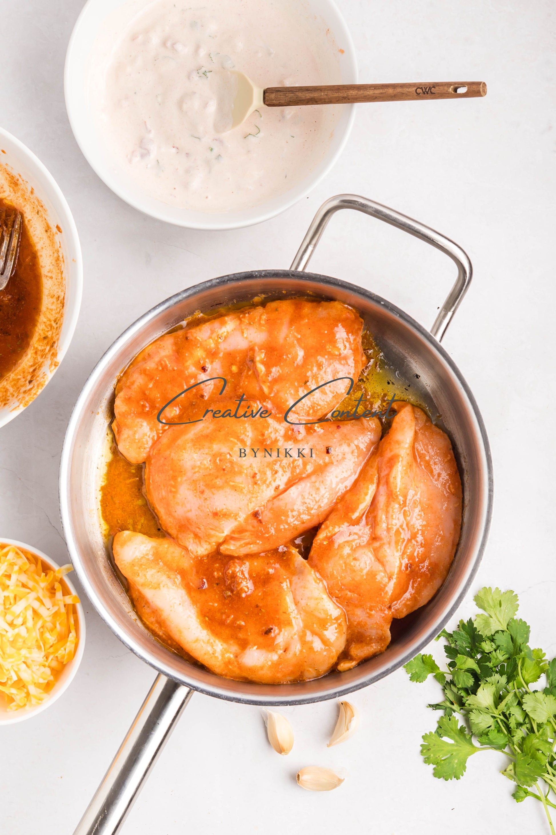 - Ingredients: Chicken breasts, halved, avocado oil, lime juice, garlic, teriyaki sauce, honey, taco seasoning, kosher salt, mayonnaise, salsa, sour cream, cilantro, lime juice, cumin, kosher salt, Colby Jack cheese
