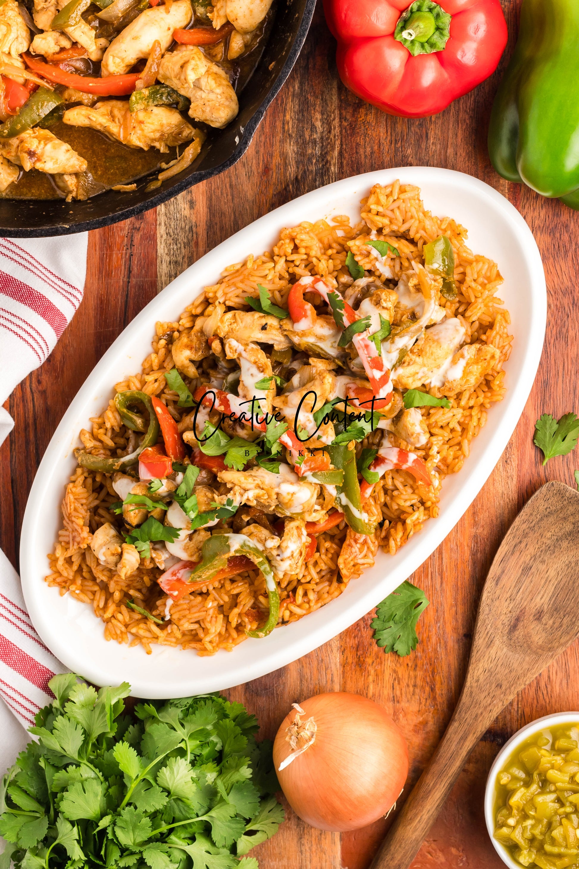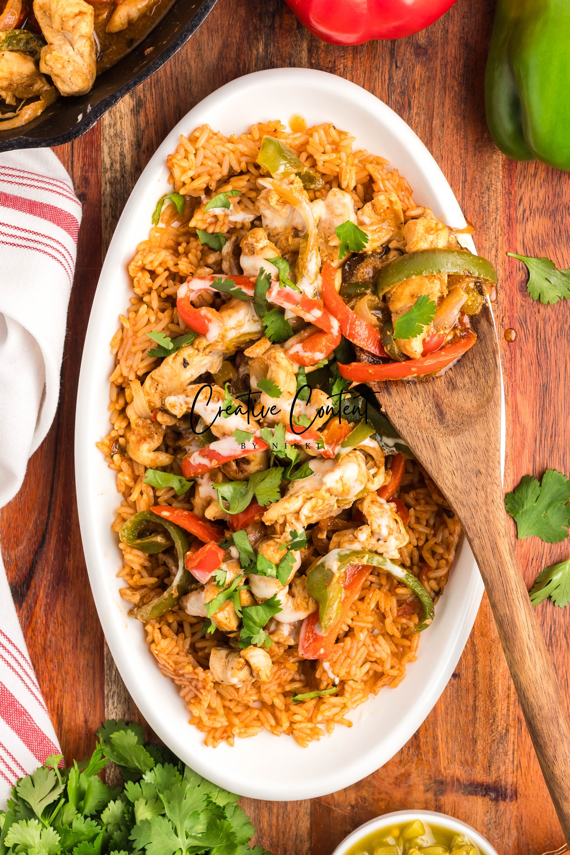 - Ingredients: red bell peppers, green bell peppers, yellow onion, avocado oil, chicken, chipotle sauce, fajita seasoning, Spanish rice, queso cheese sauce, cilantro.