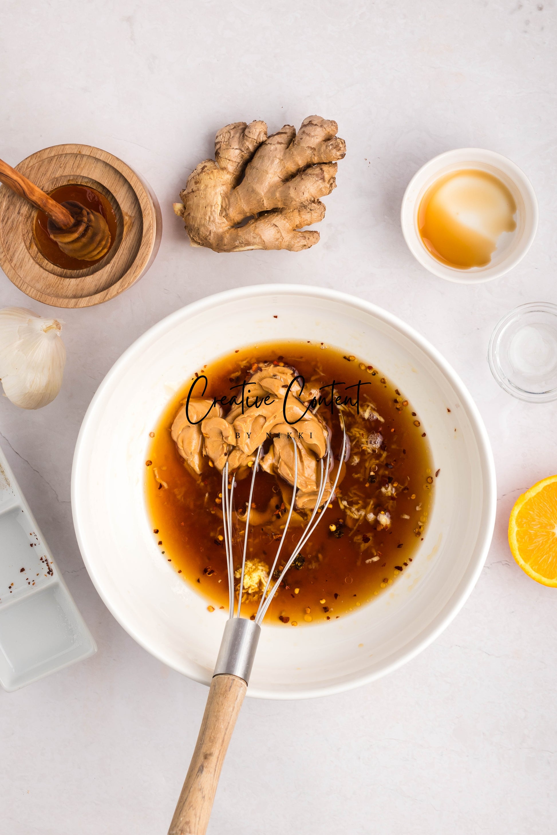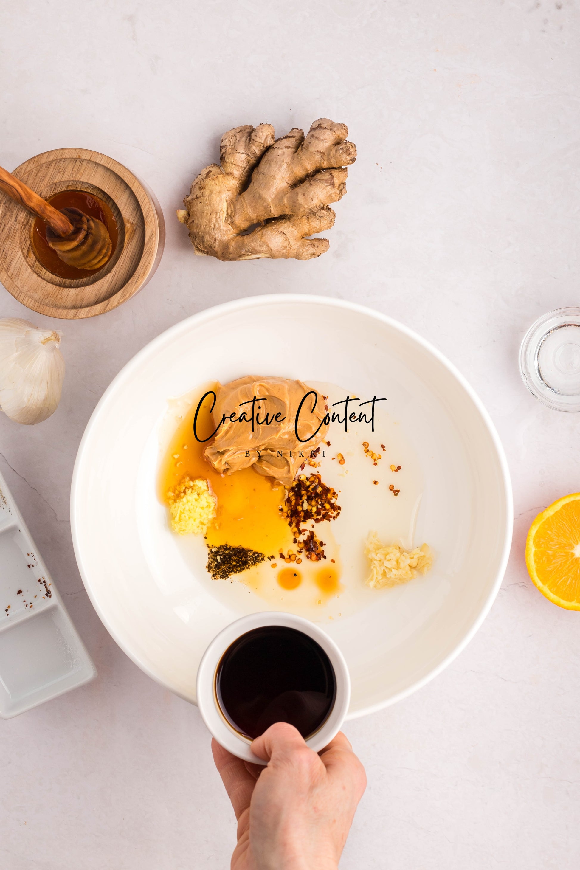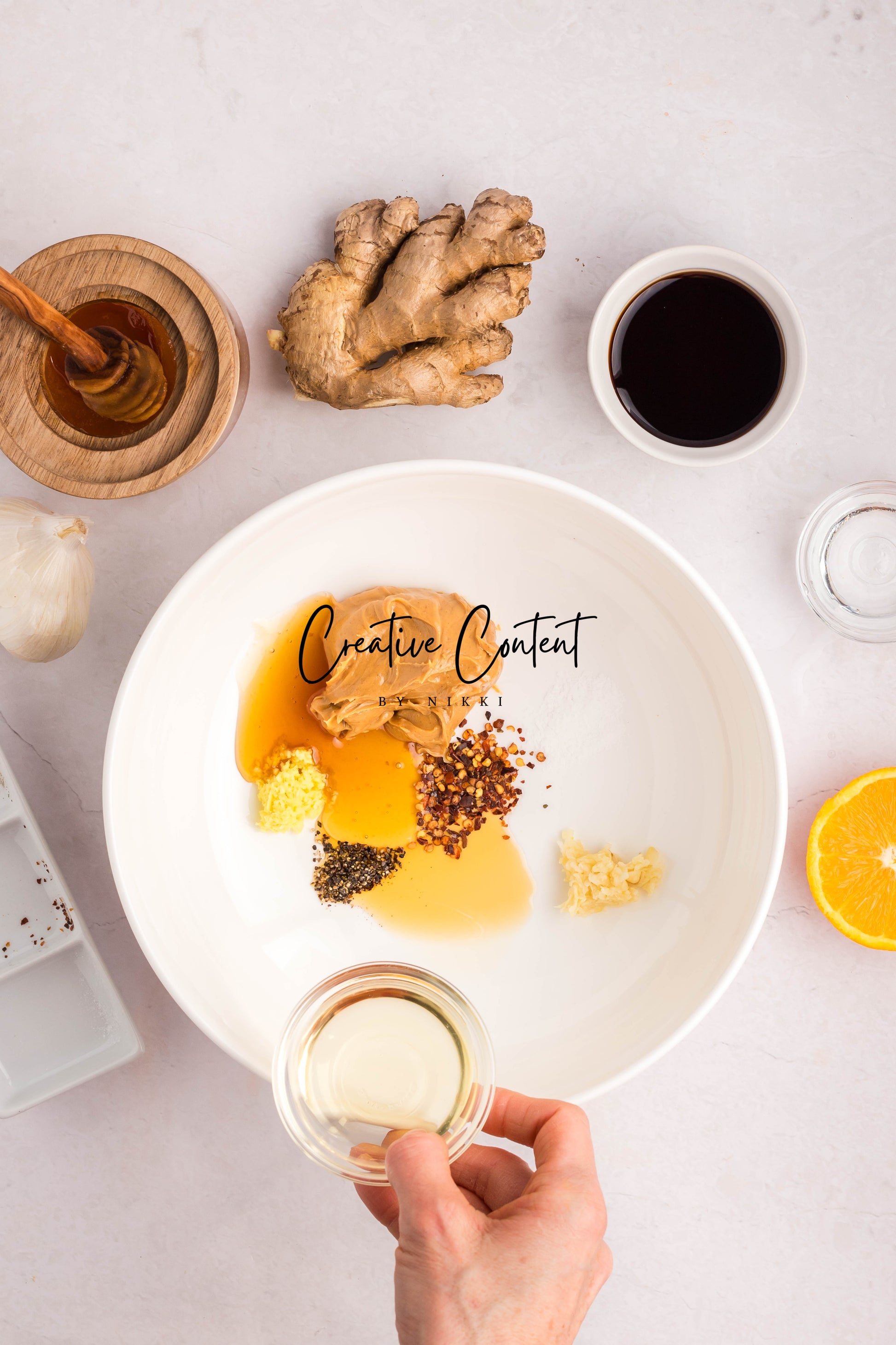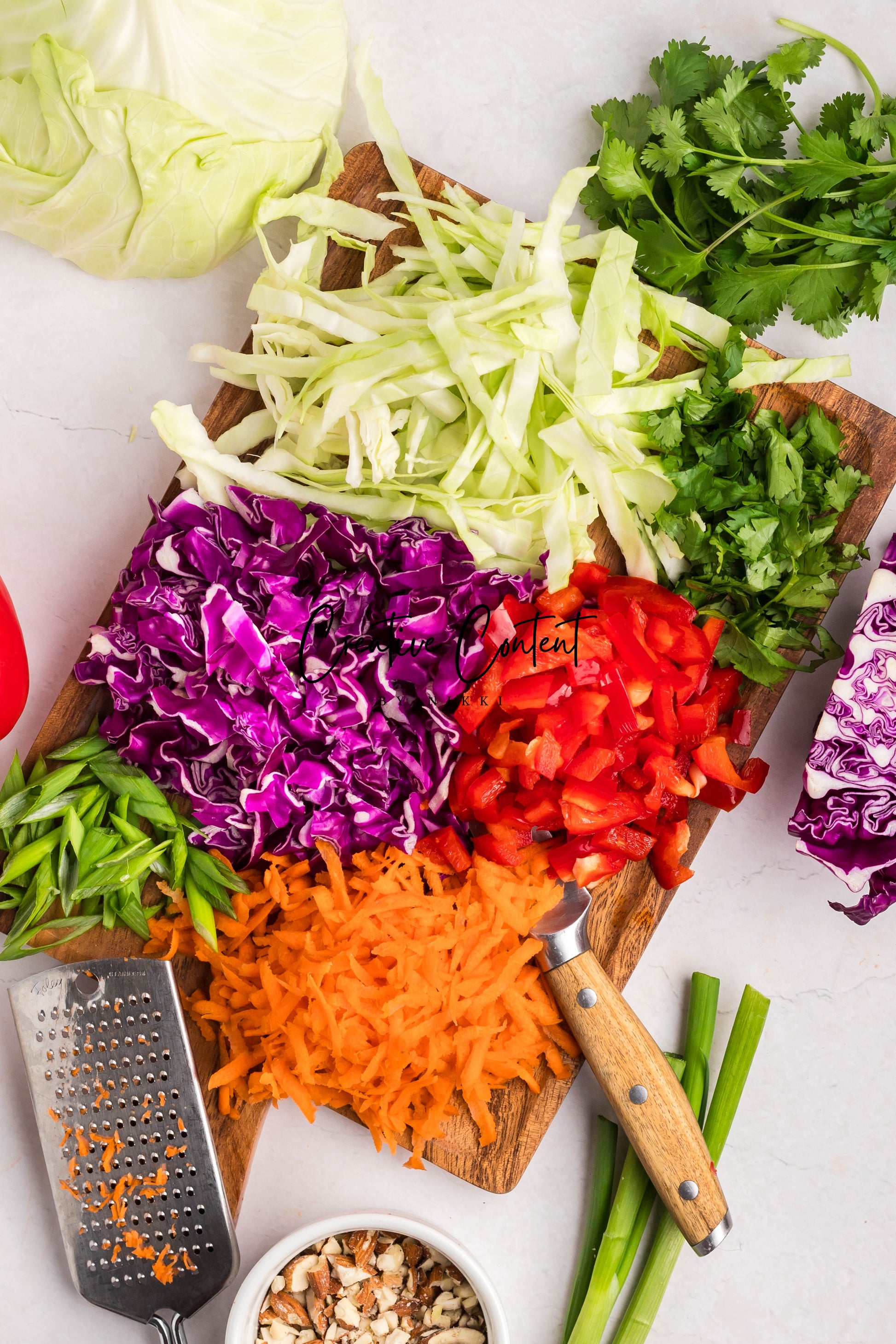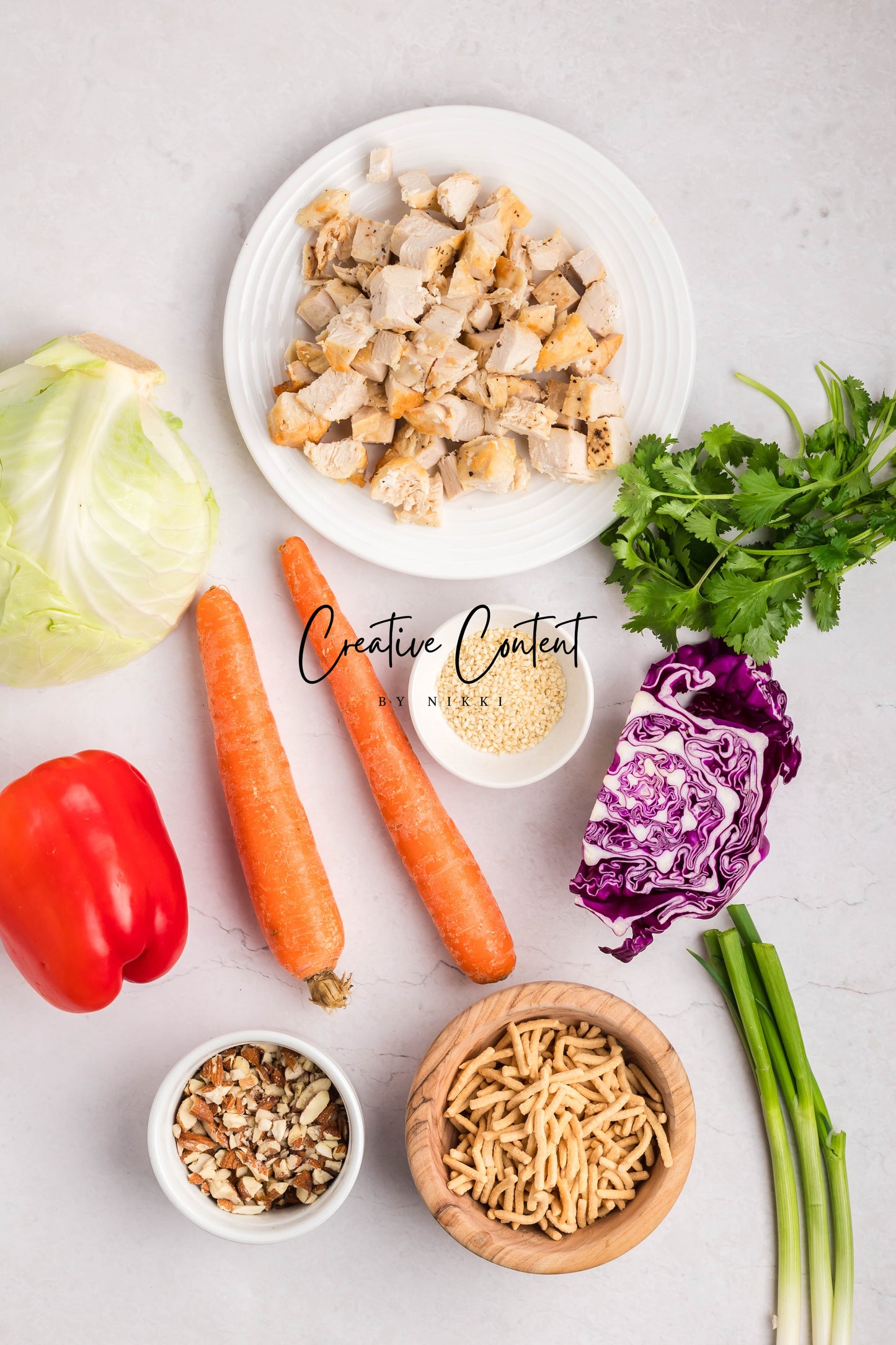 - Ingredients: Peanut butter, rice vinegar, soy sauce, lemon juice, water, honey, cabbage, chicken, red cabbage, carrots, red pepper, chow mein noodles, green onions, slivered almonds, cilantro, sesame seeds, ginger, sesame oil, sriracha, garlic, red chili flakes, salt, black pepper