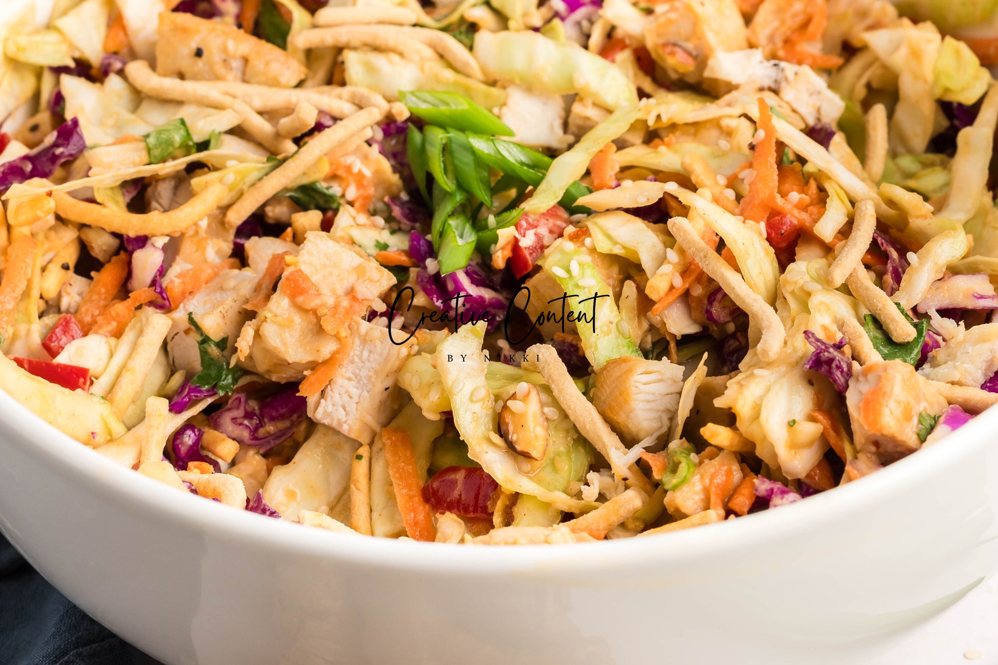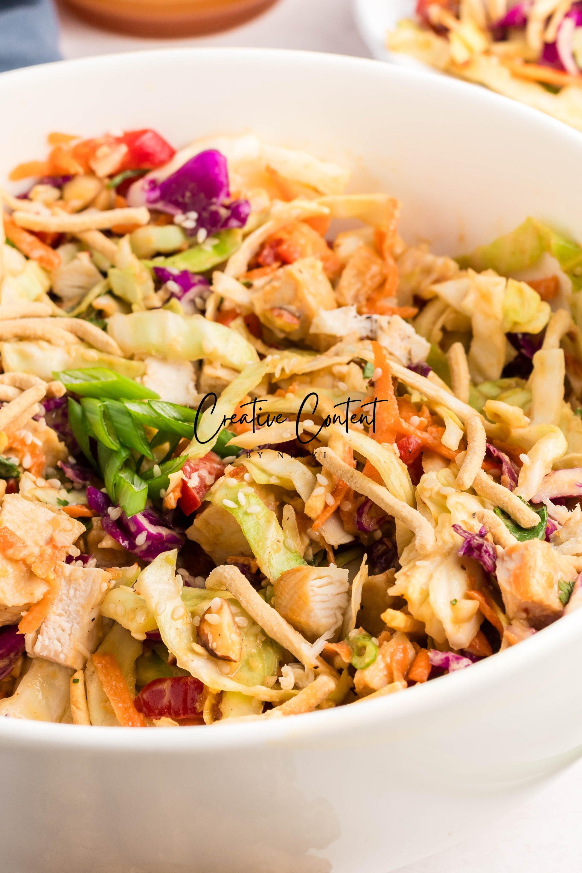 This Asian Chicken Chopped Salad is packed with bold flavors and fresh ingredients. The combination of tender chicken, crisp vegetables, and a tangy dressing creates a balanced and satisfying dish. A mix of textures from crunchy almonds and chow mein adds depth to each bite.
