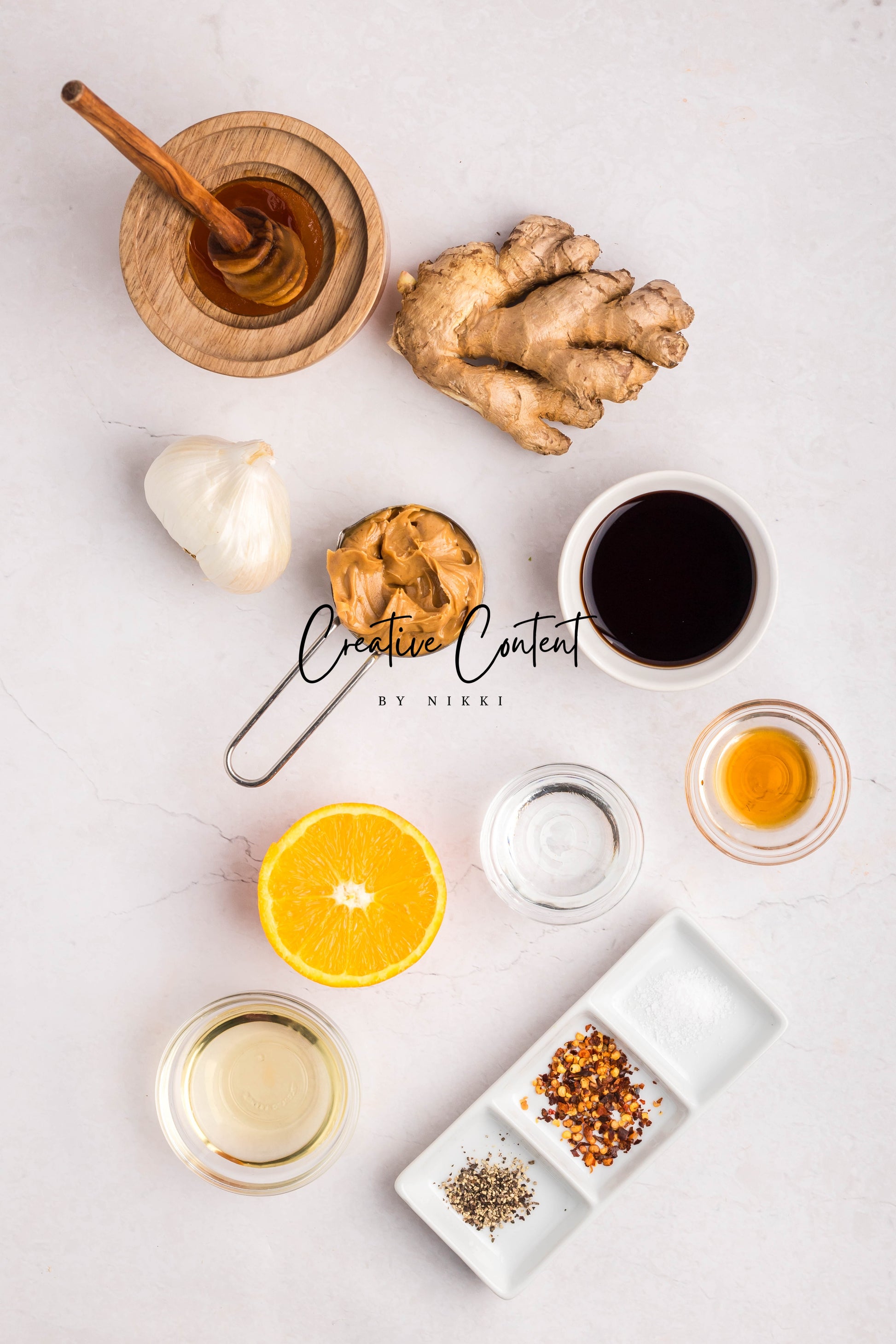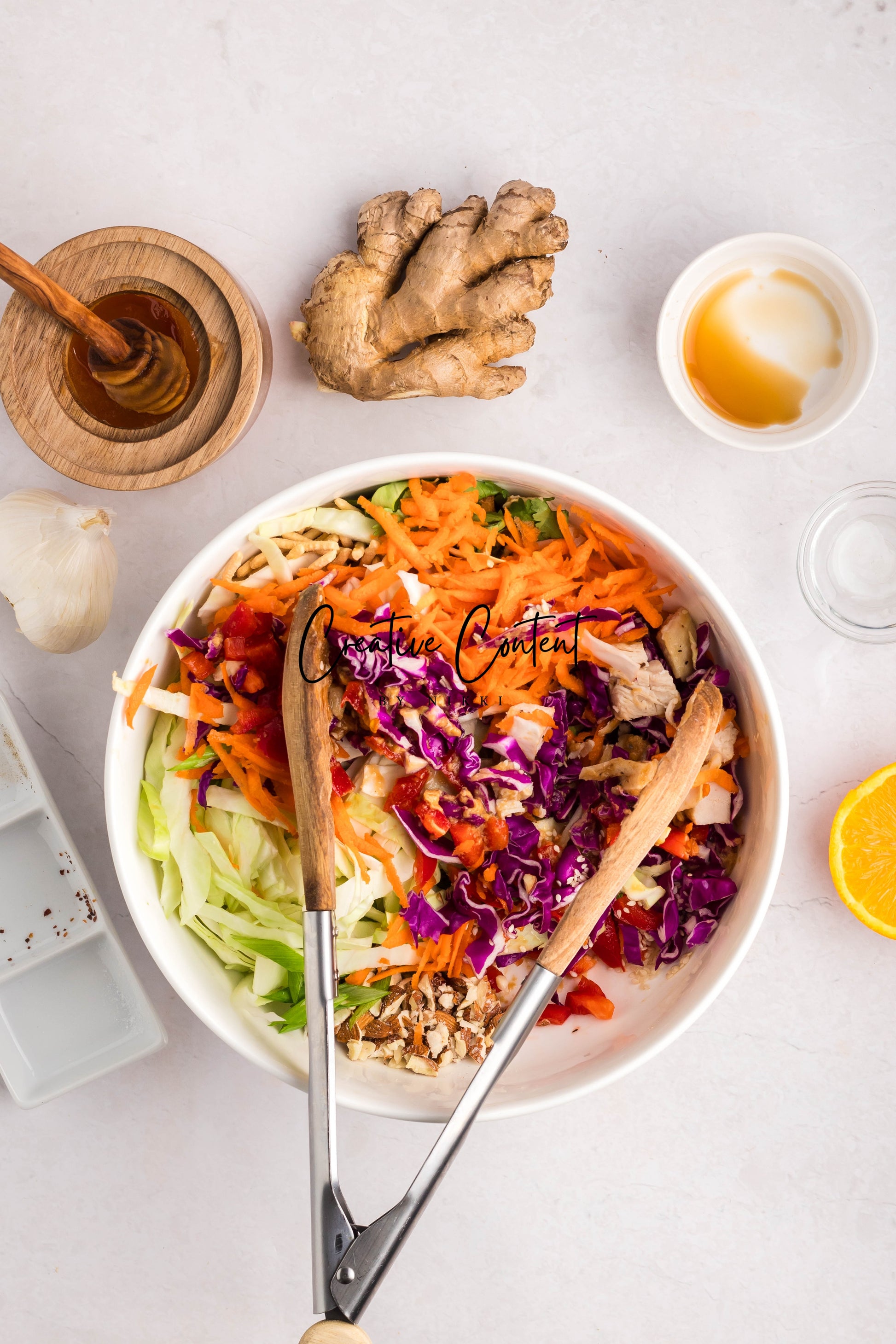 - Ingredients: Peanut butter, rice vinegar, soy sauce, lemon juice, water, honey, cabbage, chicken, red cabbage, carrots, red pepper, chow mein noodles, green onions, slivered almonds, cilantro, sesame seeds, ginger, sesame oil, sriracha, garlic, red chili flakes, salt, black pepper