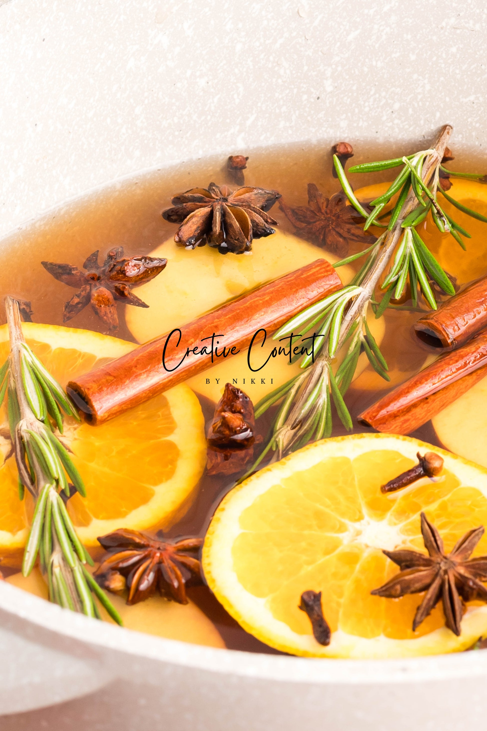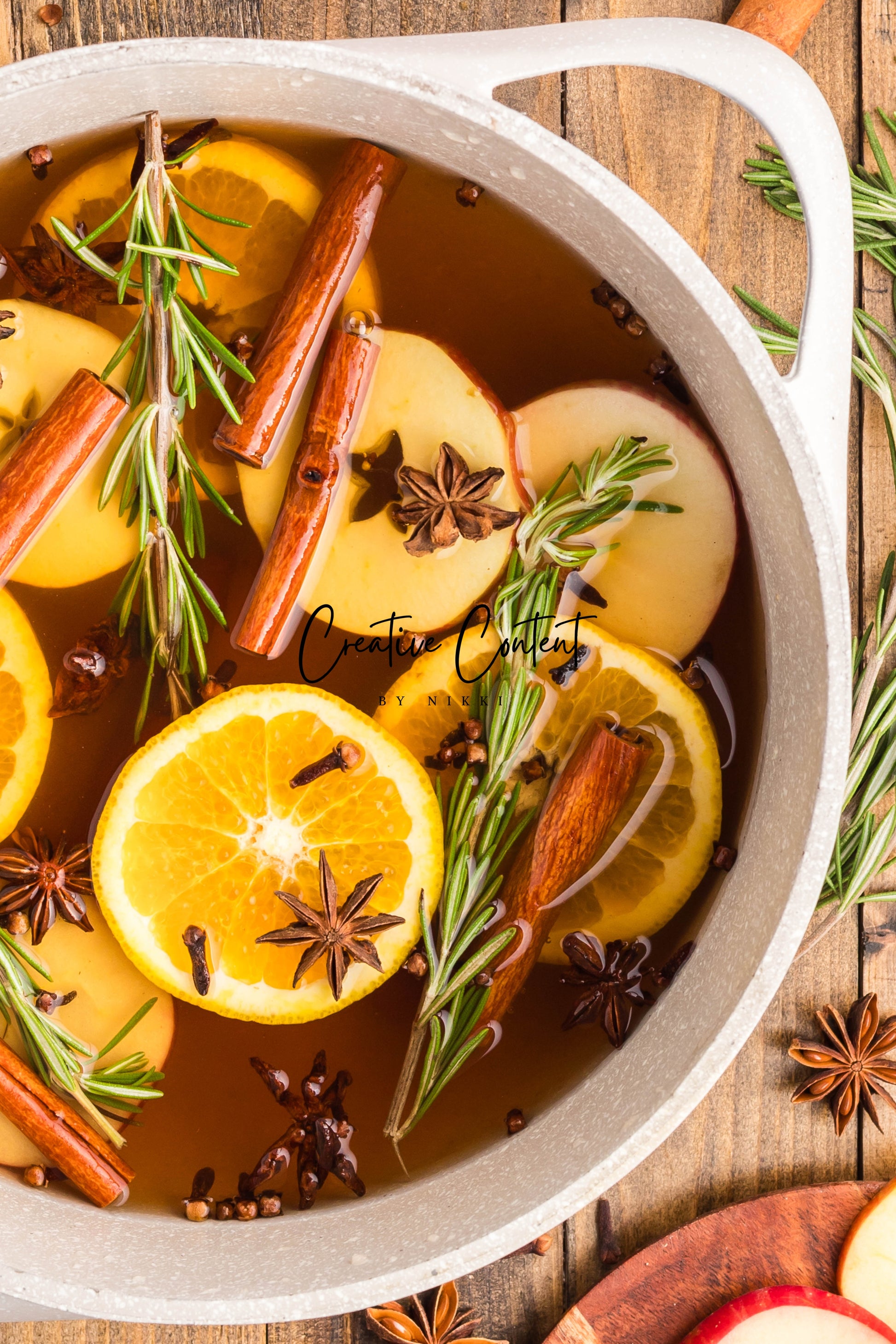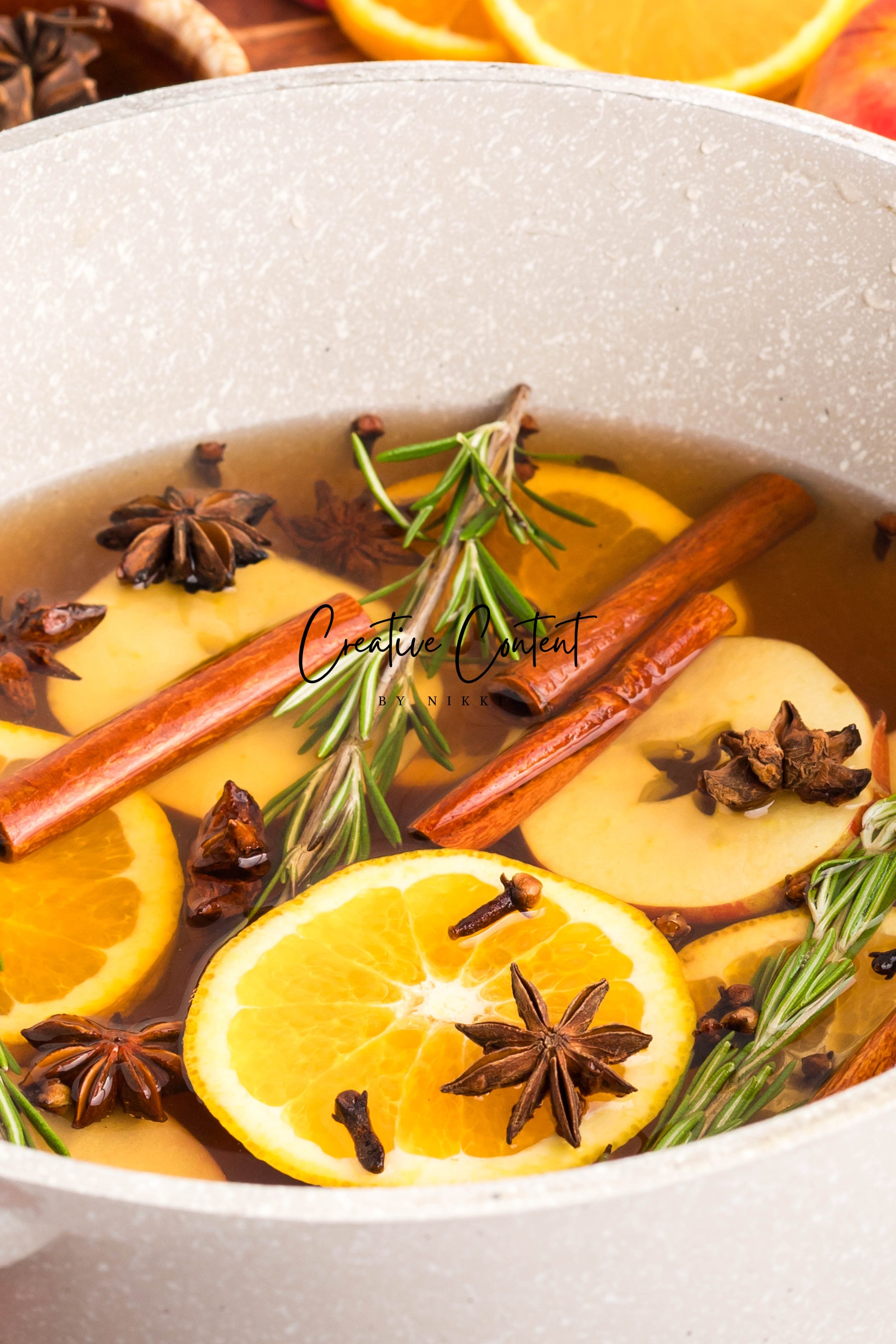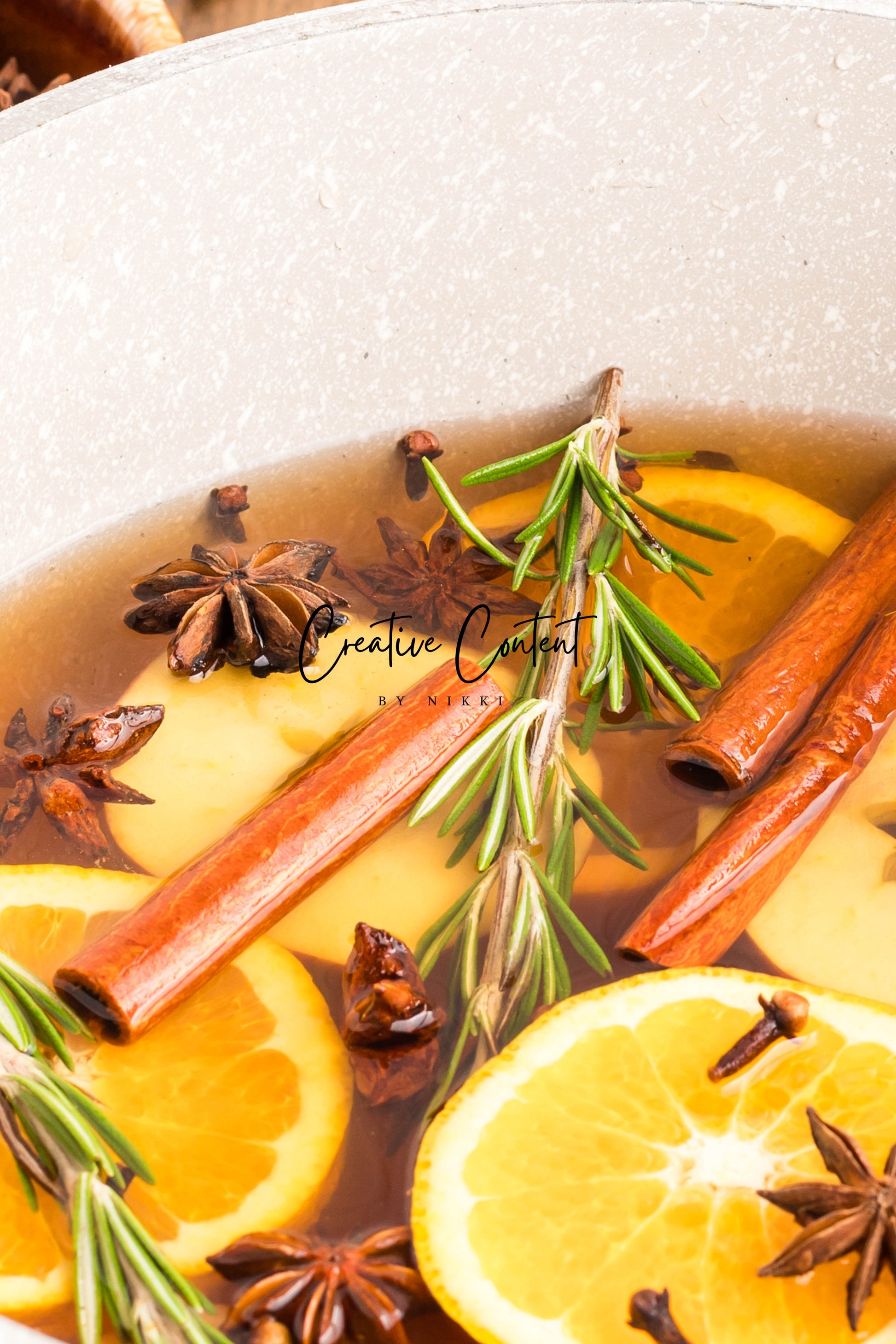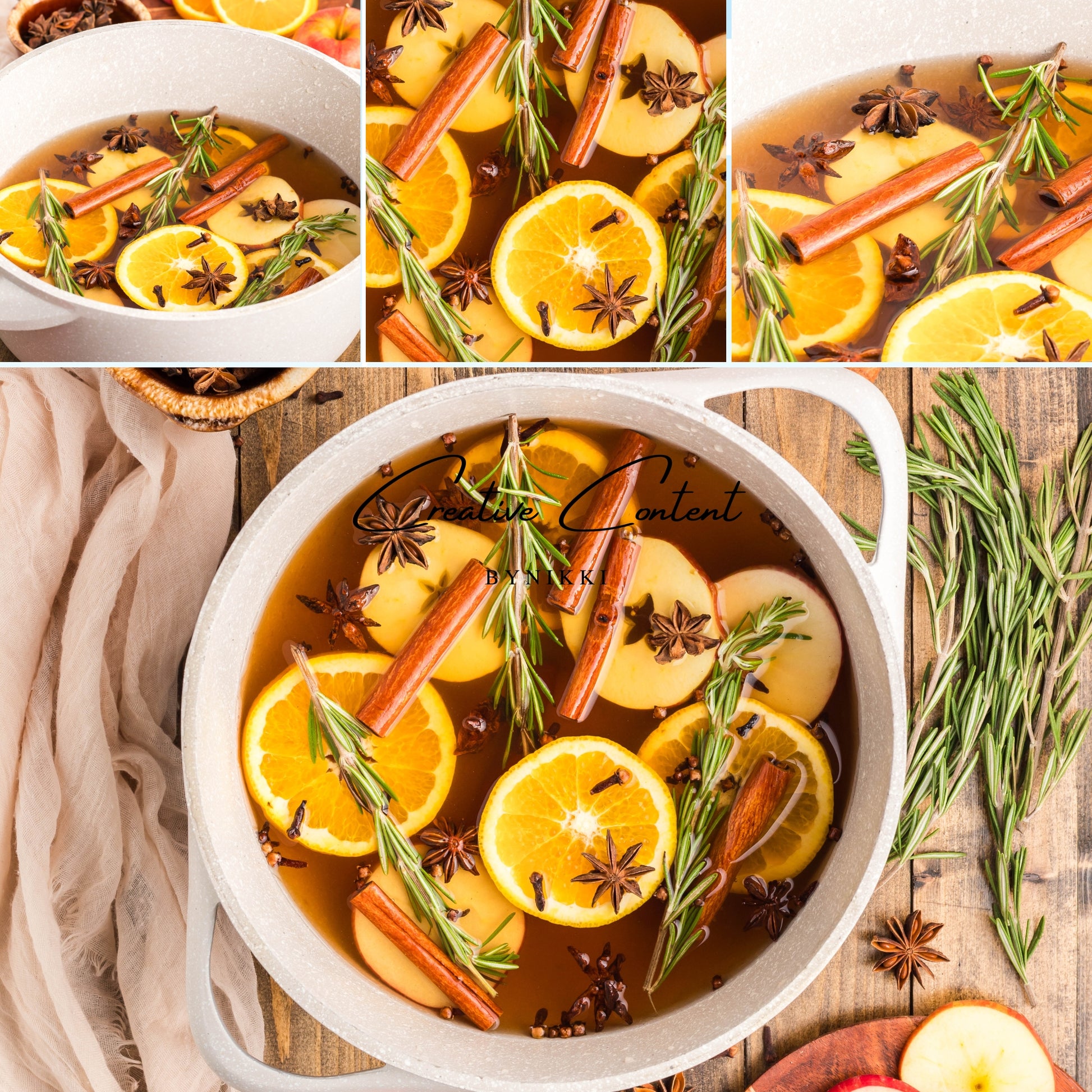 - Featured Ingredients: Water, orange, cinnamon sticks, star anise, cloves, vanilla extract, and rosemary sprigs.