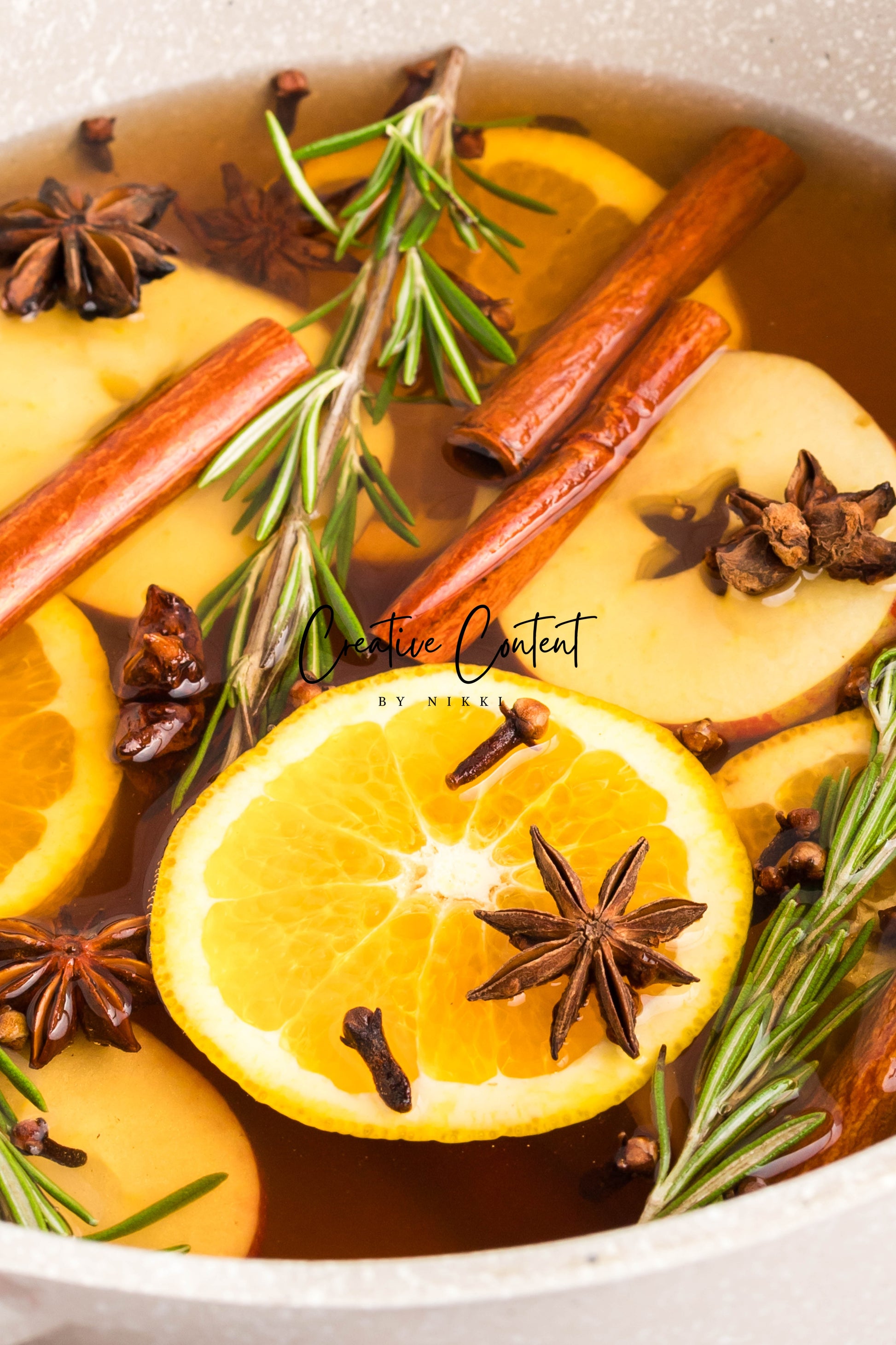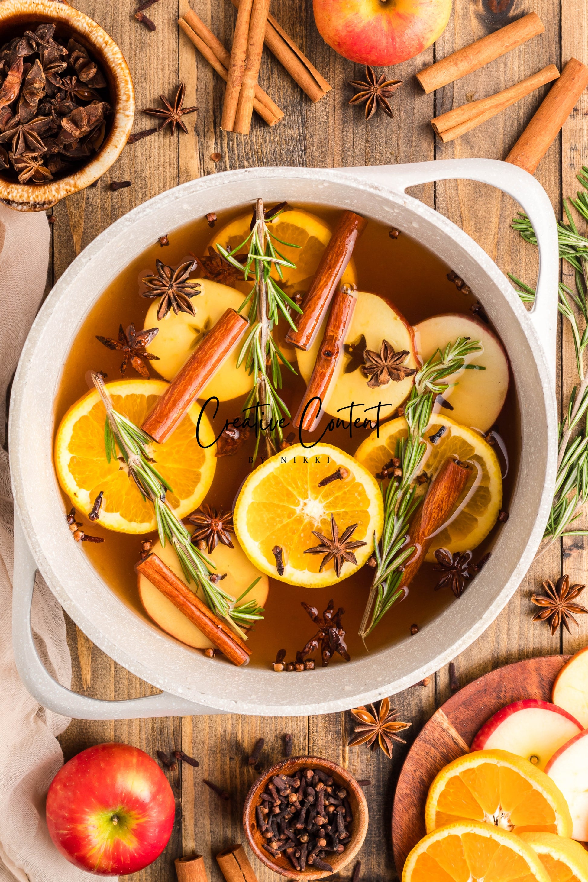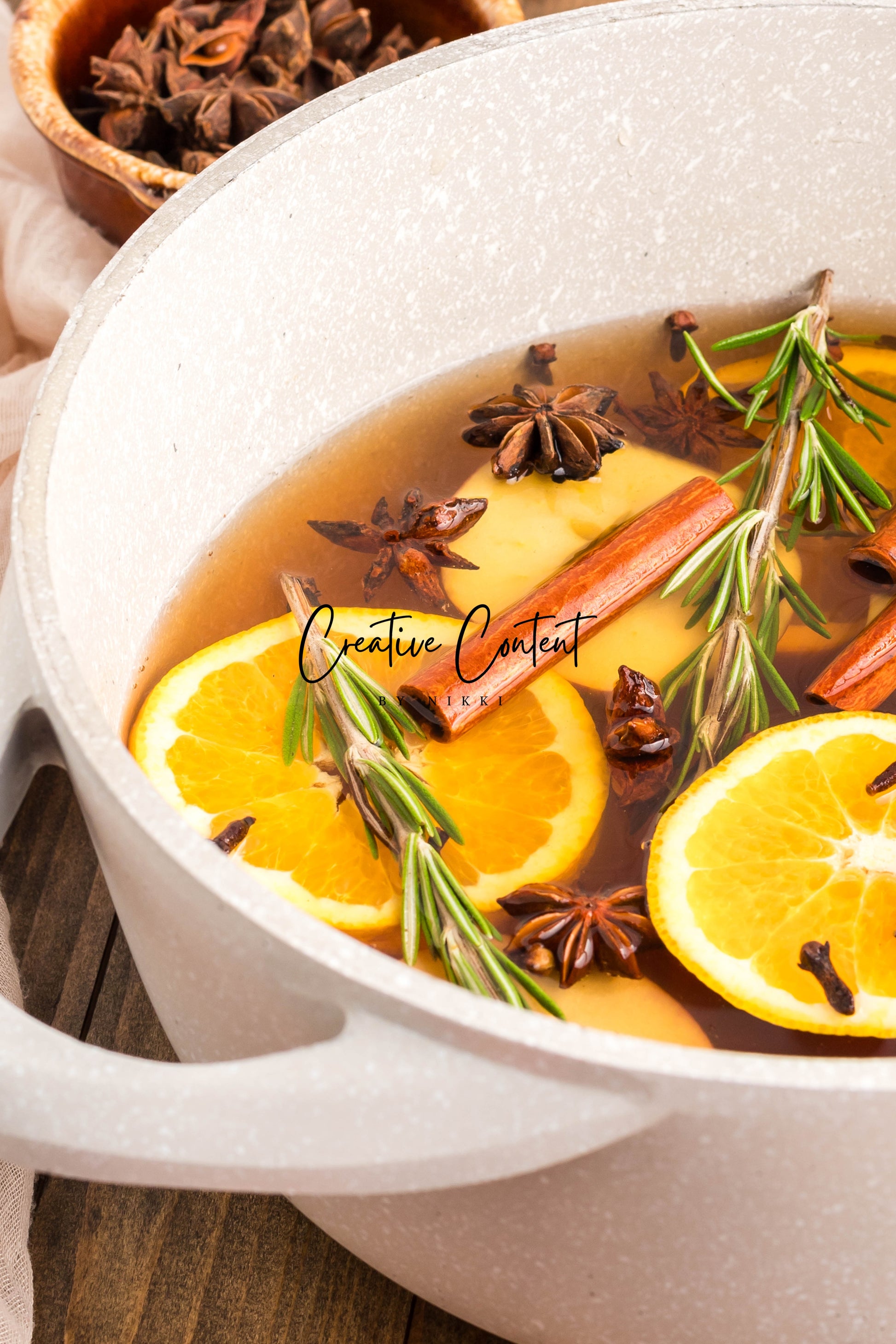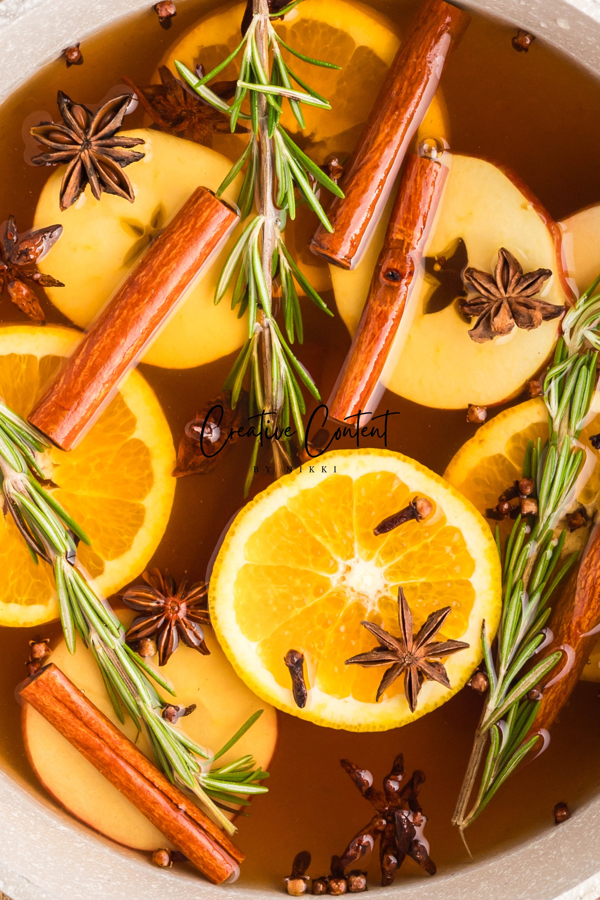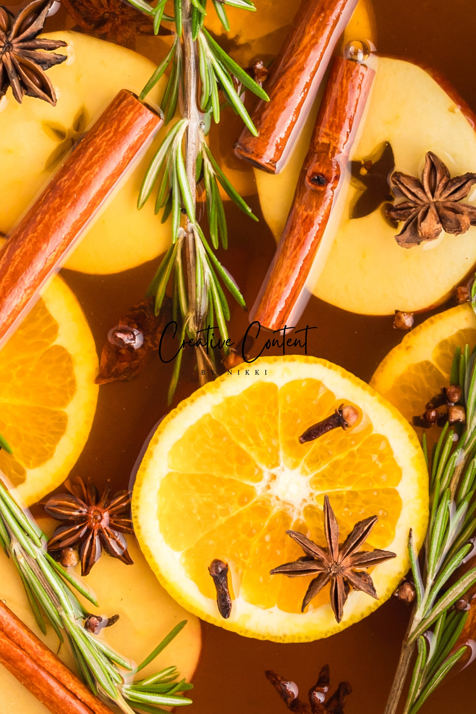 - Featured Ingredients: Water, orange, cinnamon sticks, star anise, cloves, vanilla extract, and rosemary sprigs.