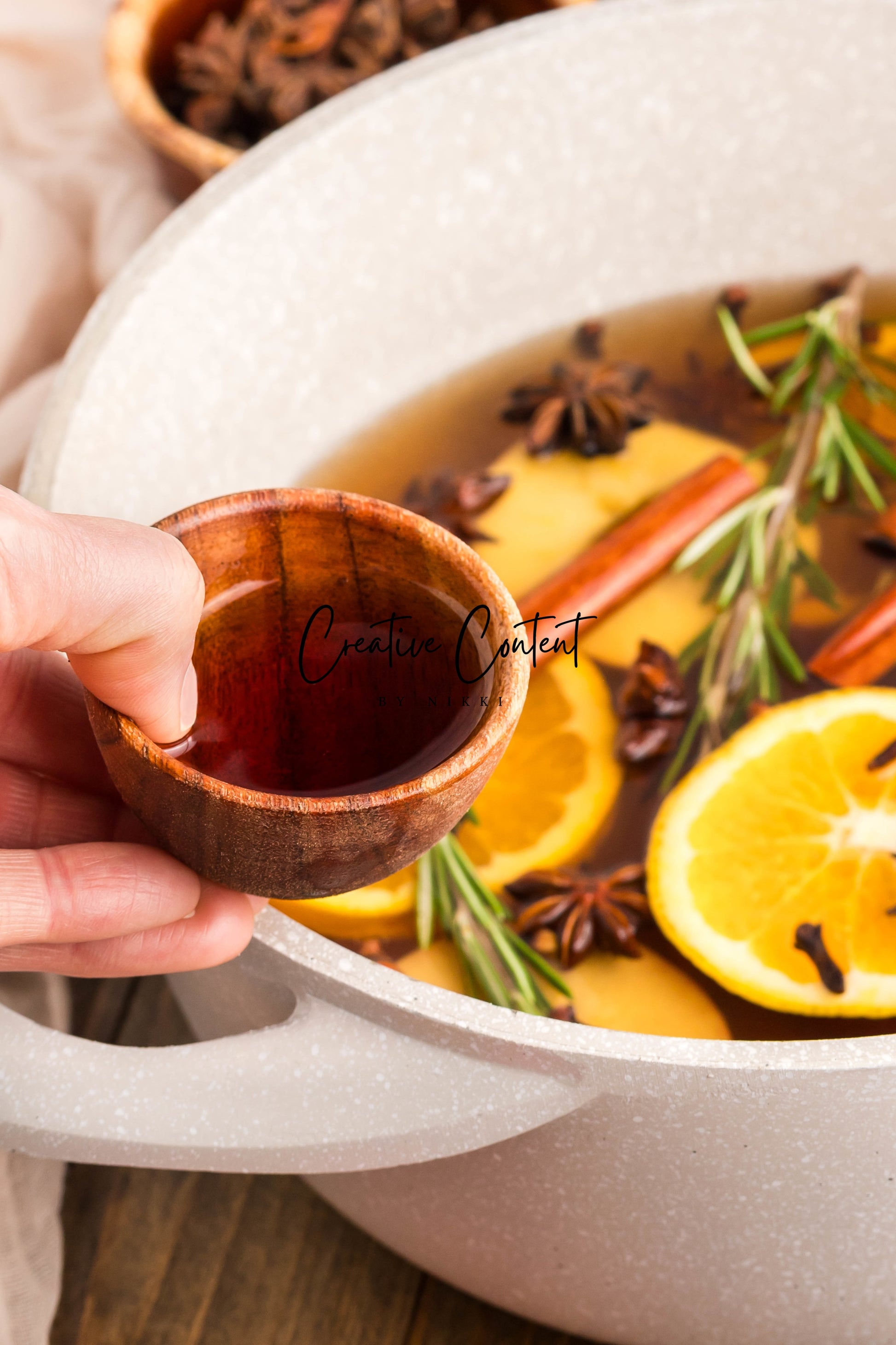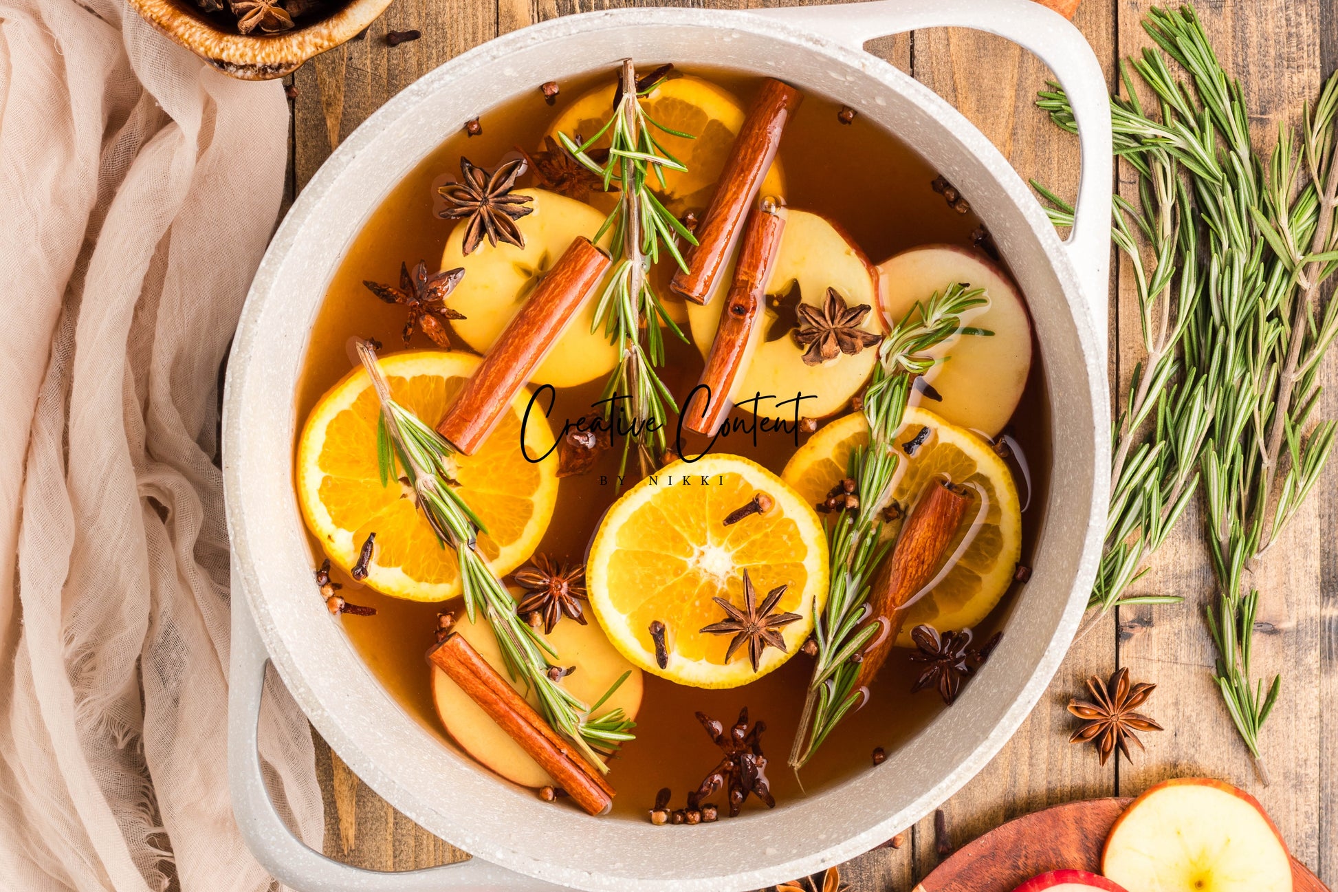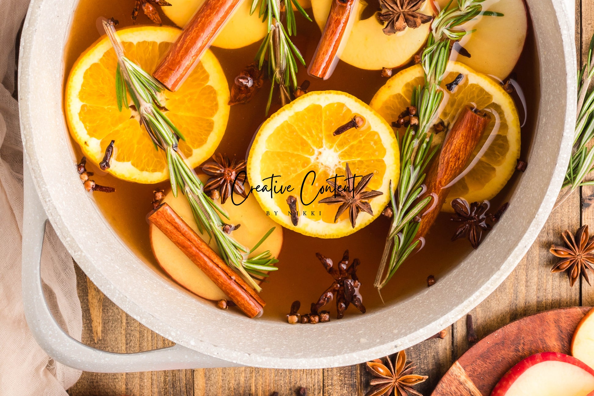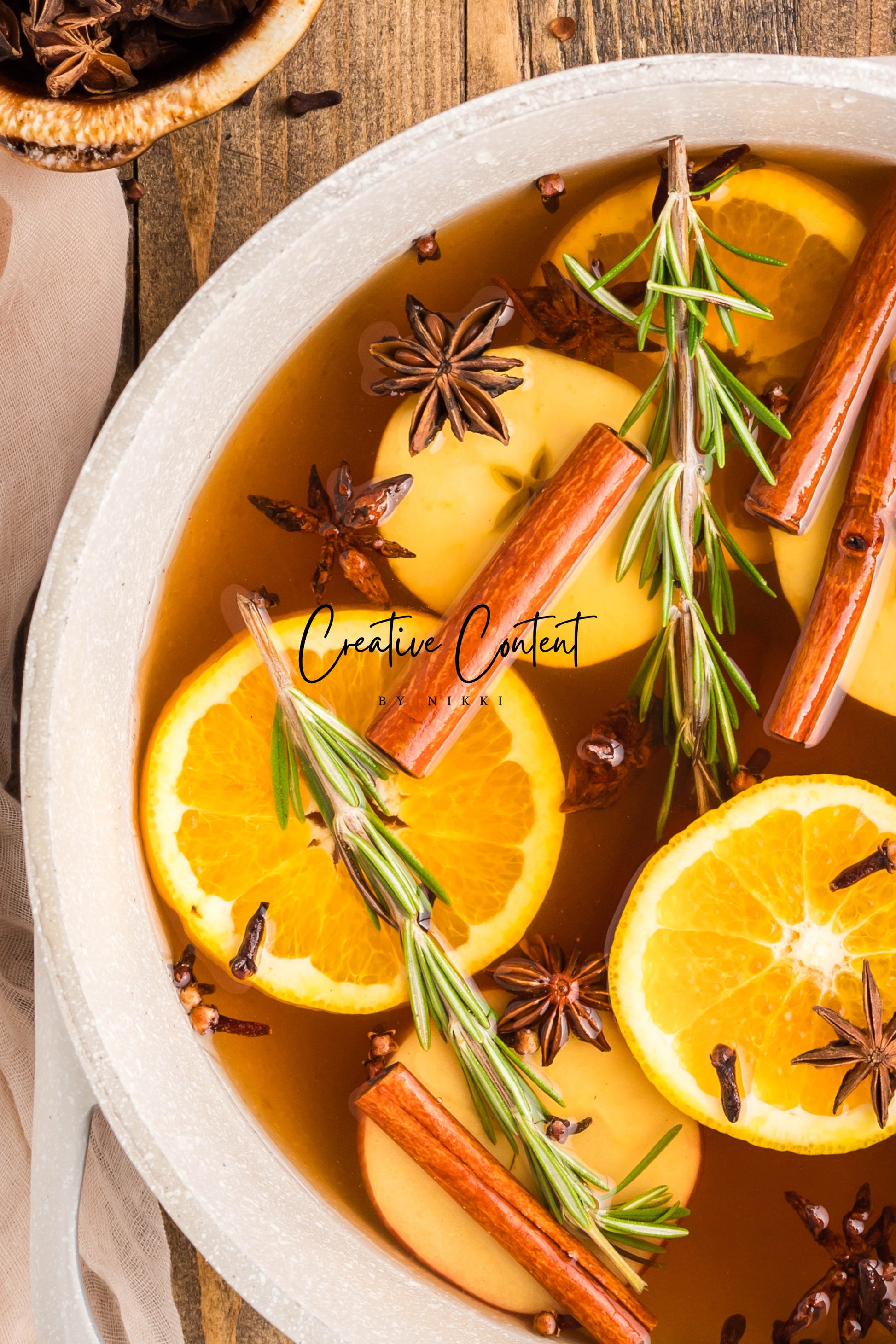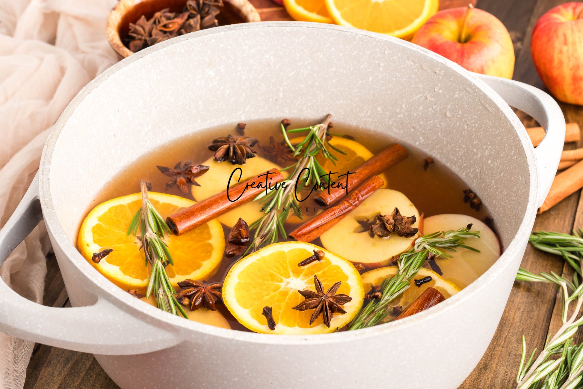 - Featured Ingredients: Water, orange, cinnamon sticks, star anise, cloves, vanilla extract, and rosemary sprigs.