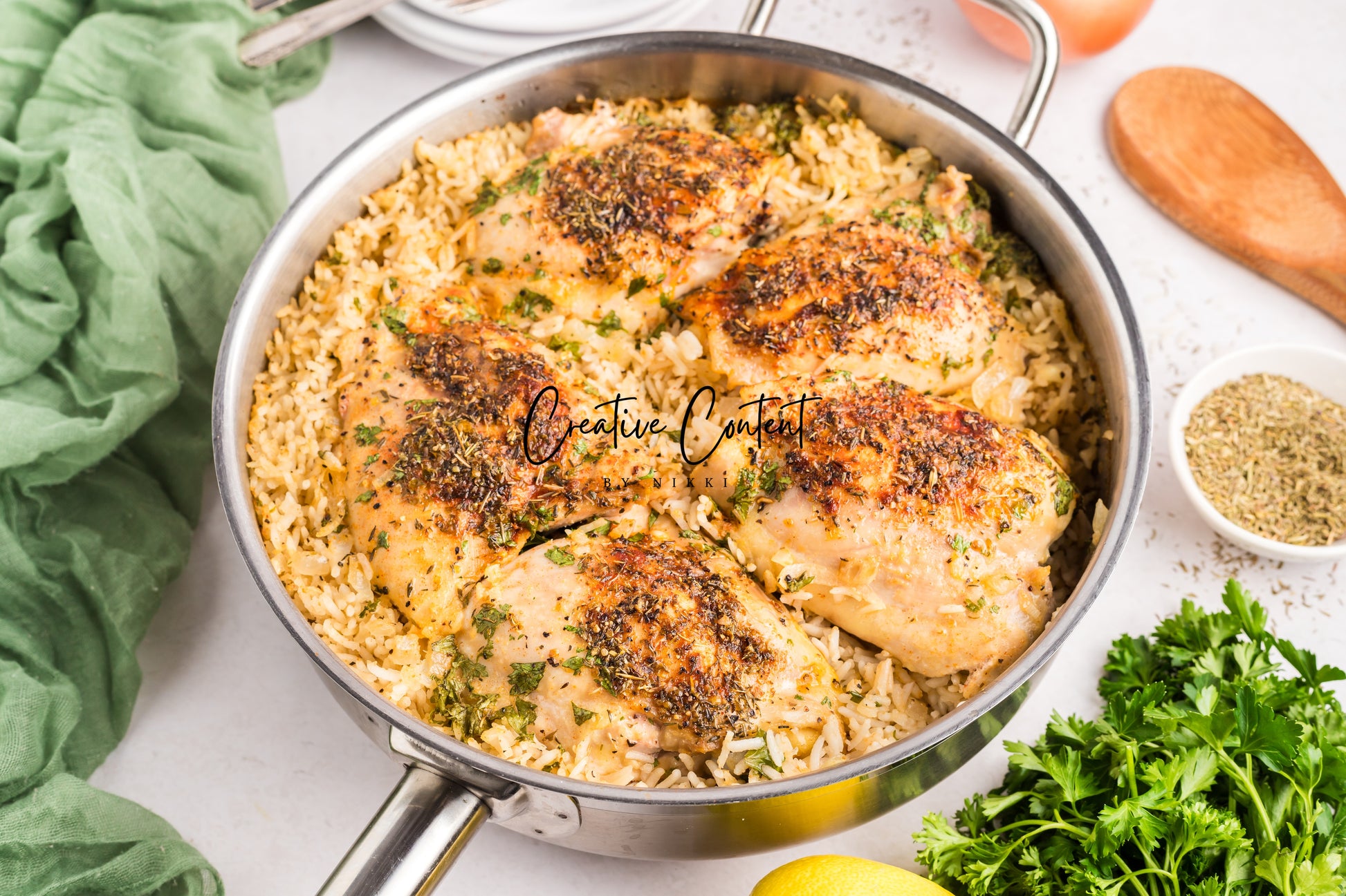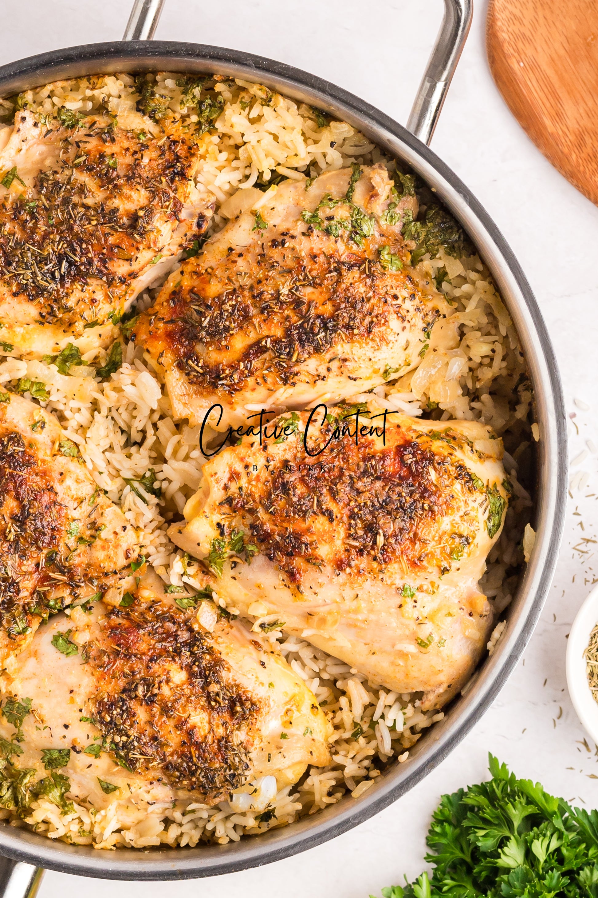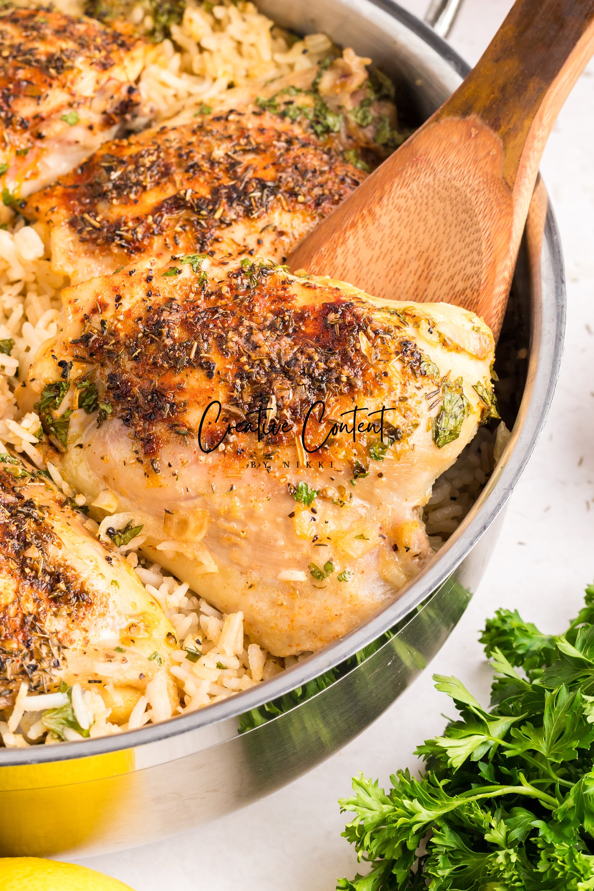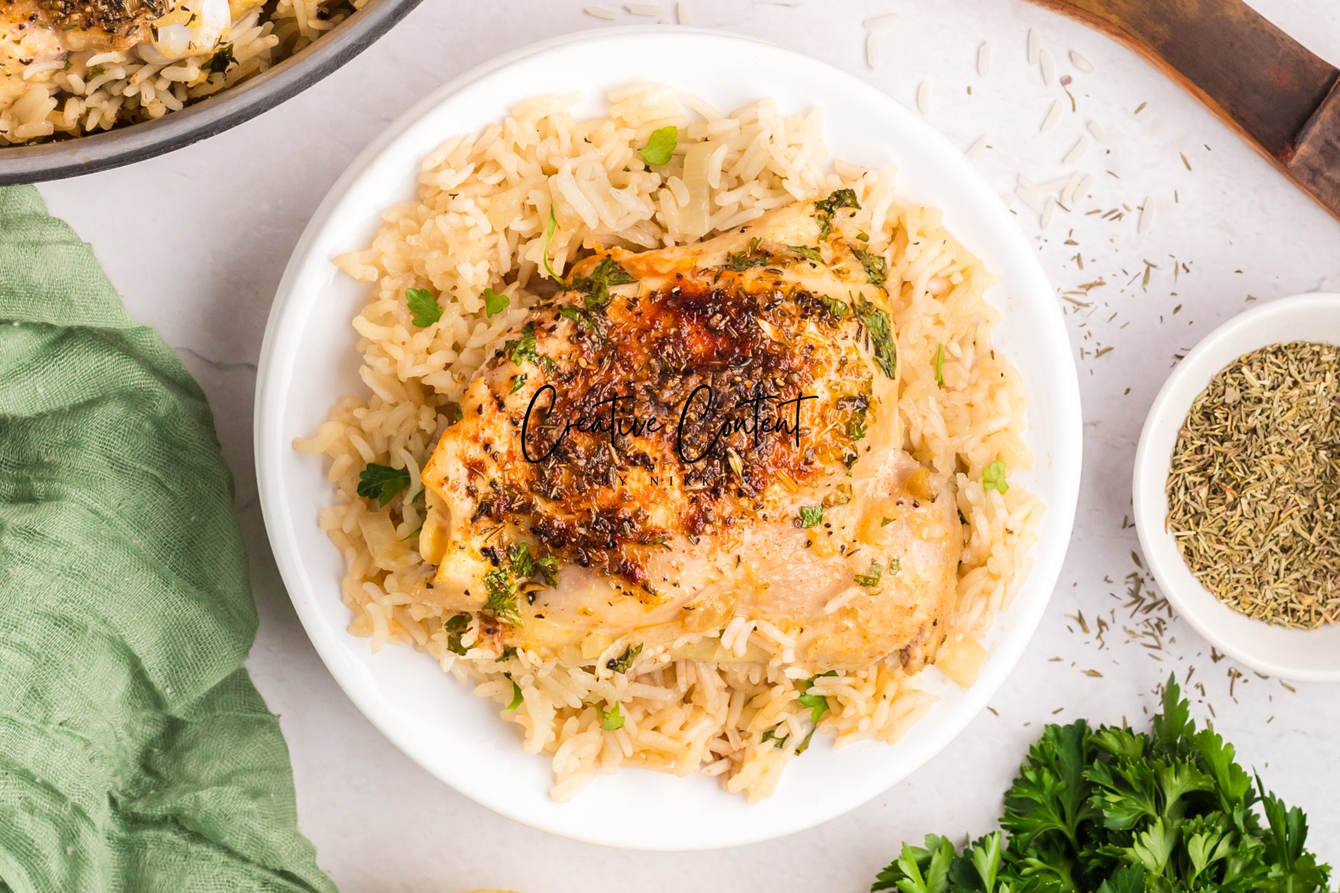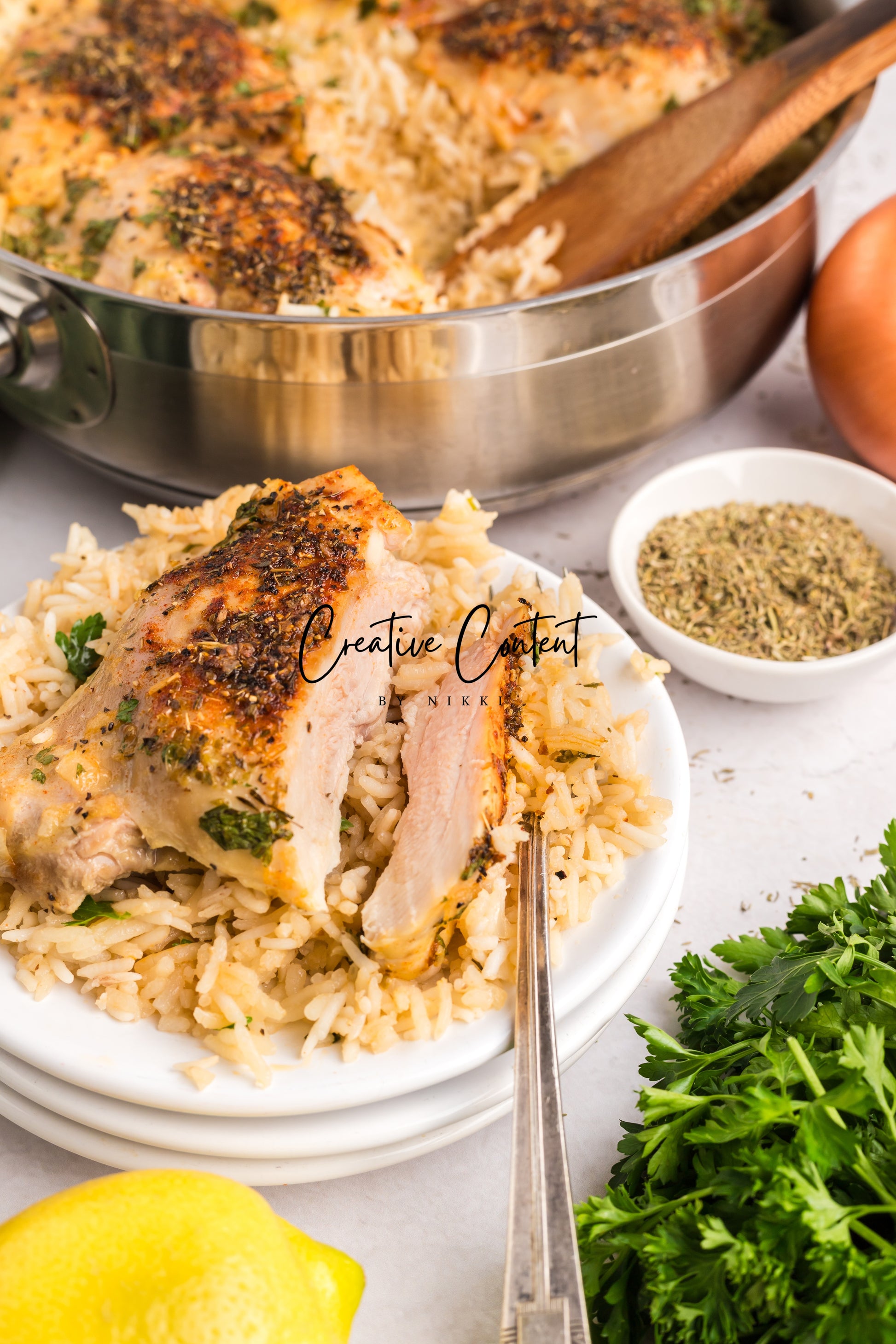 - Featured Ingredients; onion, garlic cloves, butter, white rice, low sodium chicken stock, parsley, lemon juice, garlic powder, onion powder, coarse kosher salt, black pepper, bone-in chicken thighs, avocado oil, paprika, dried thyme, and oregano.