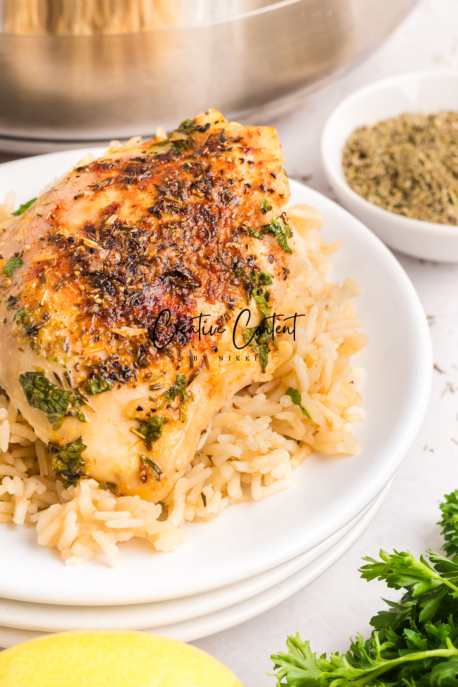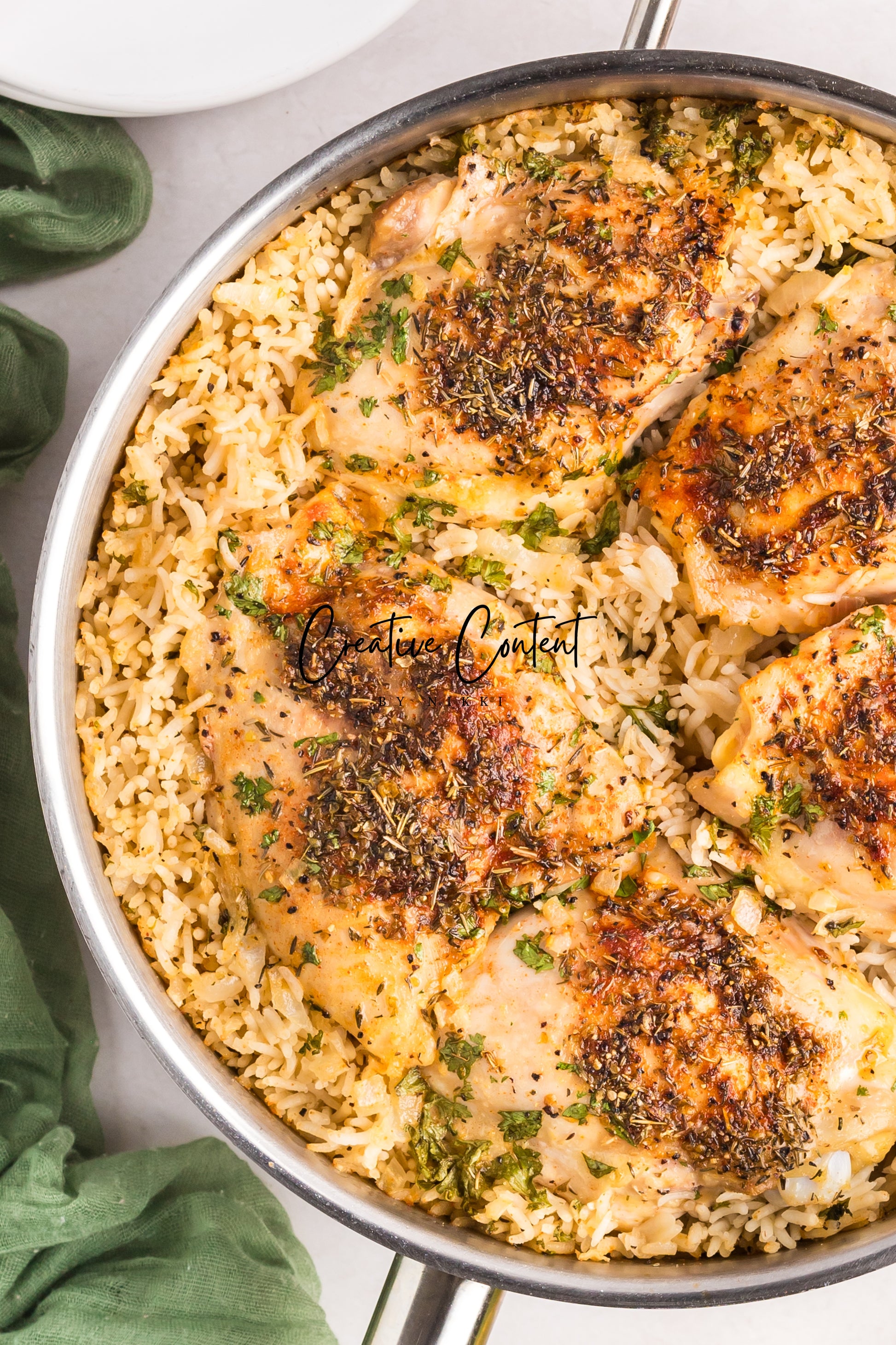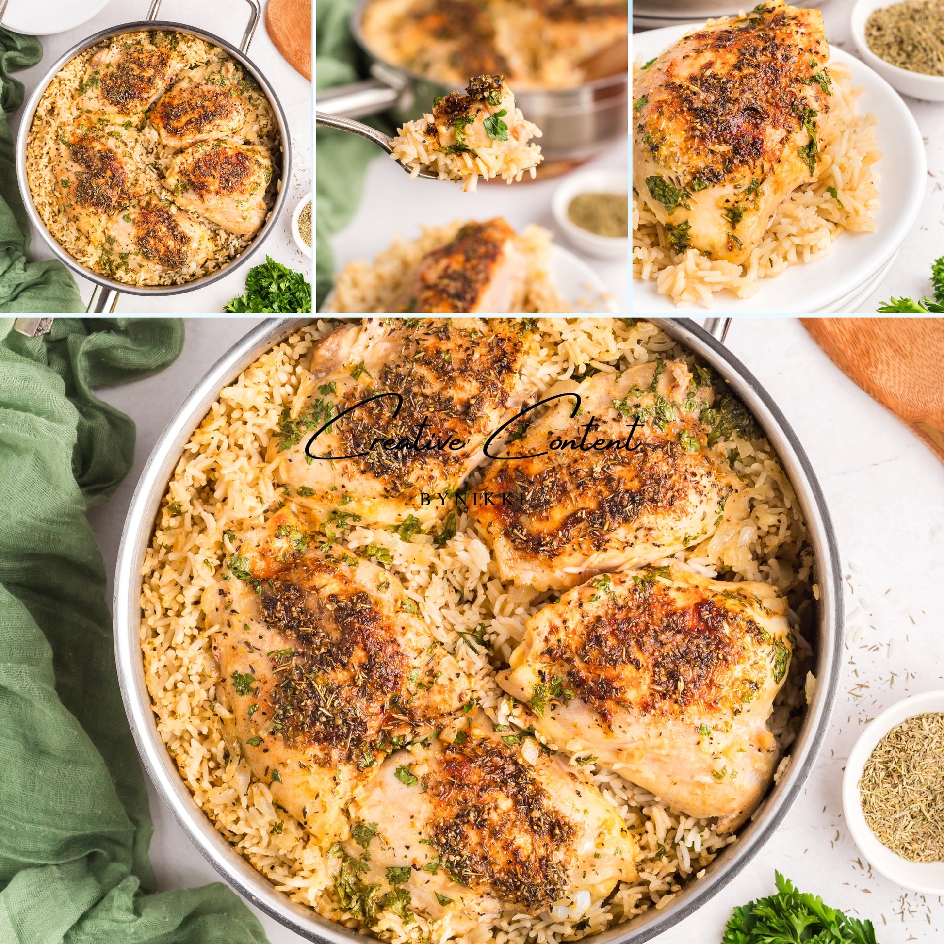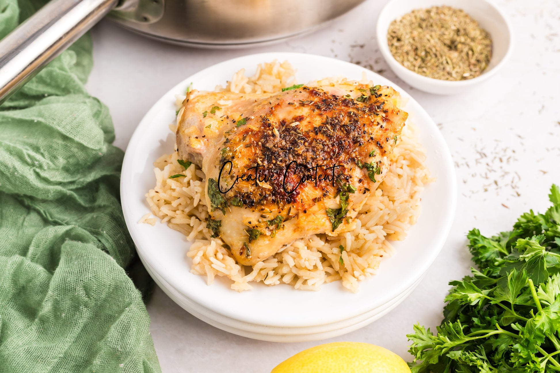 - Featured Ingredients; onion, garlic cloves, butter, white rice, low sodium chicken stock, parsley, lemon juice, garlic powder, onion powder, coarse kosher salt, black pepper, bone-in chicken thighs, avocado oil, paprika, dried thyme, and oregano.