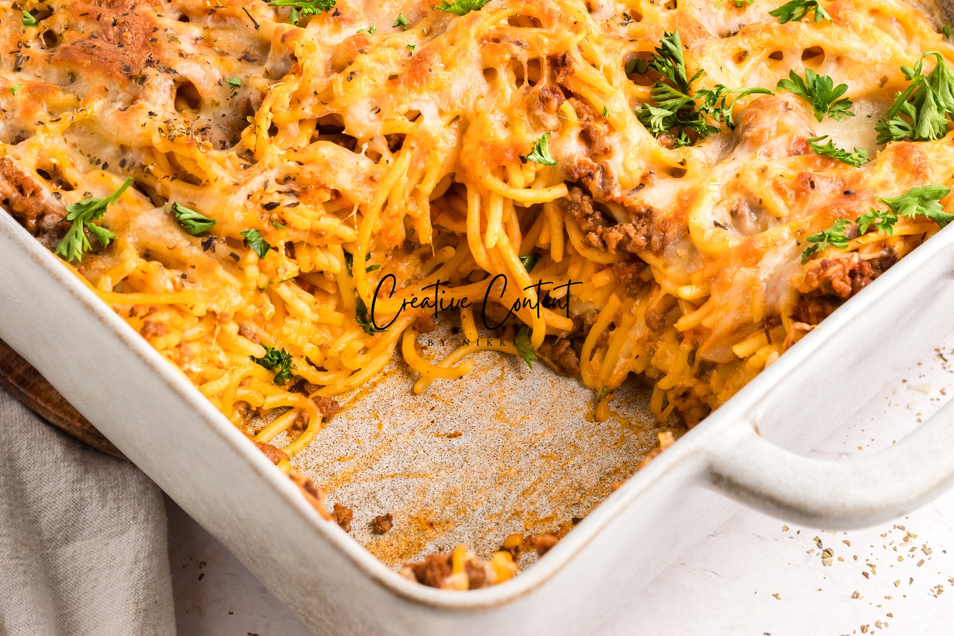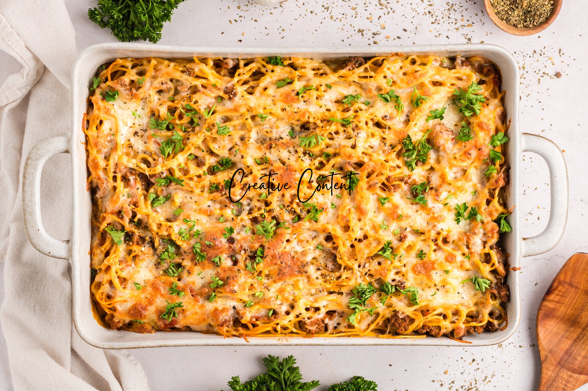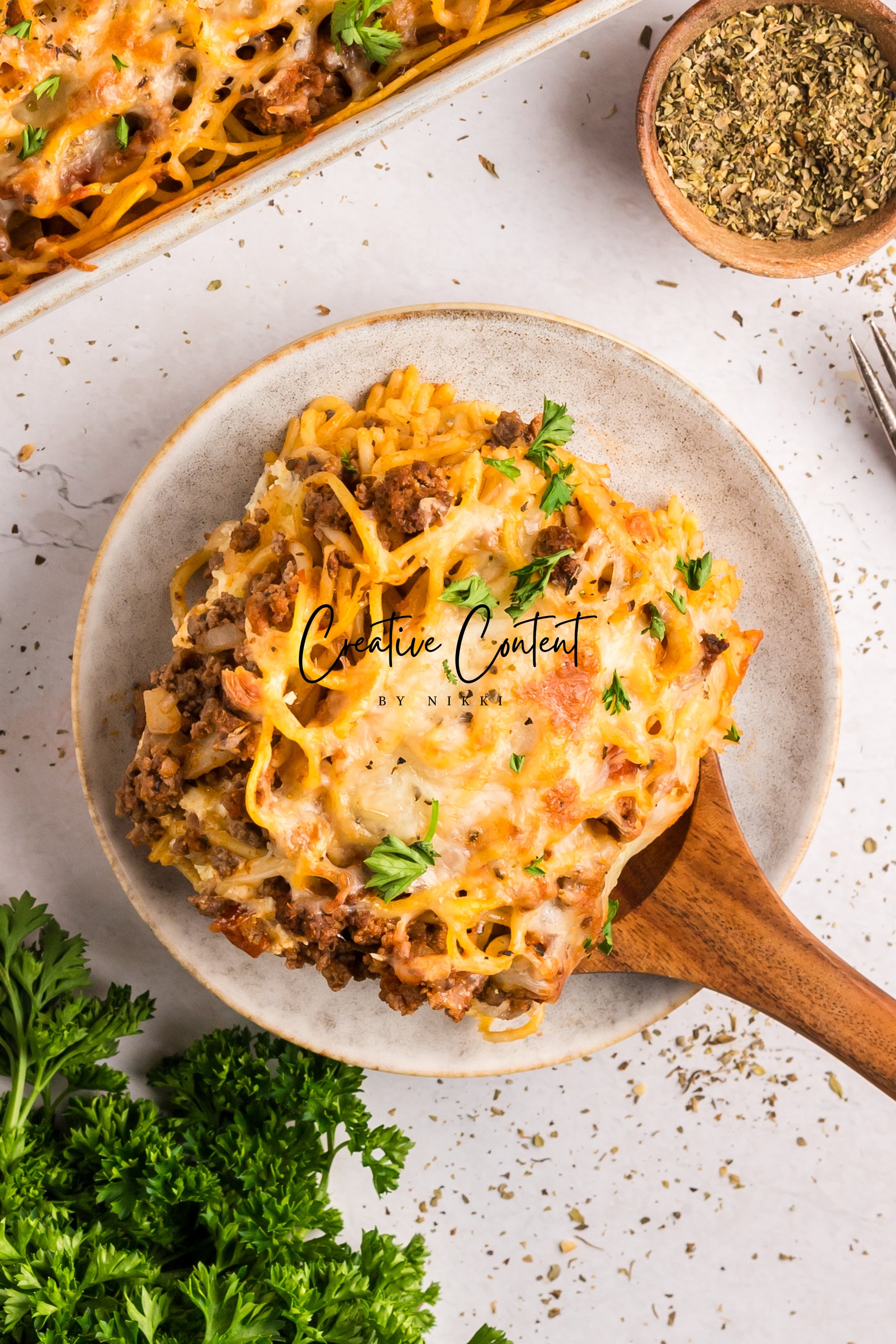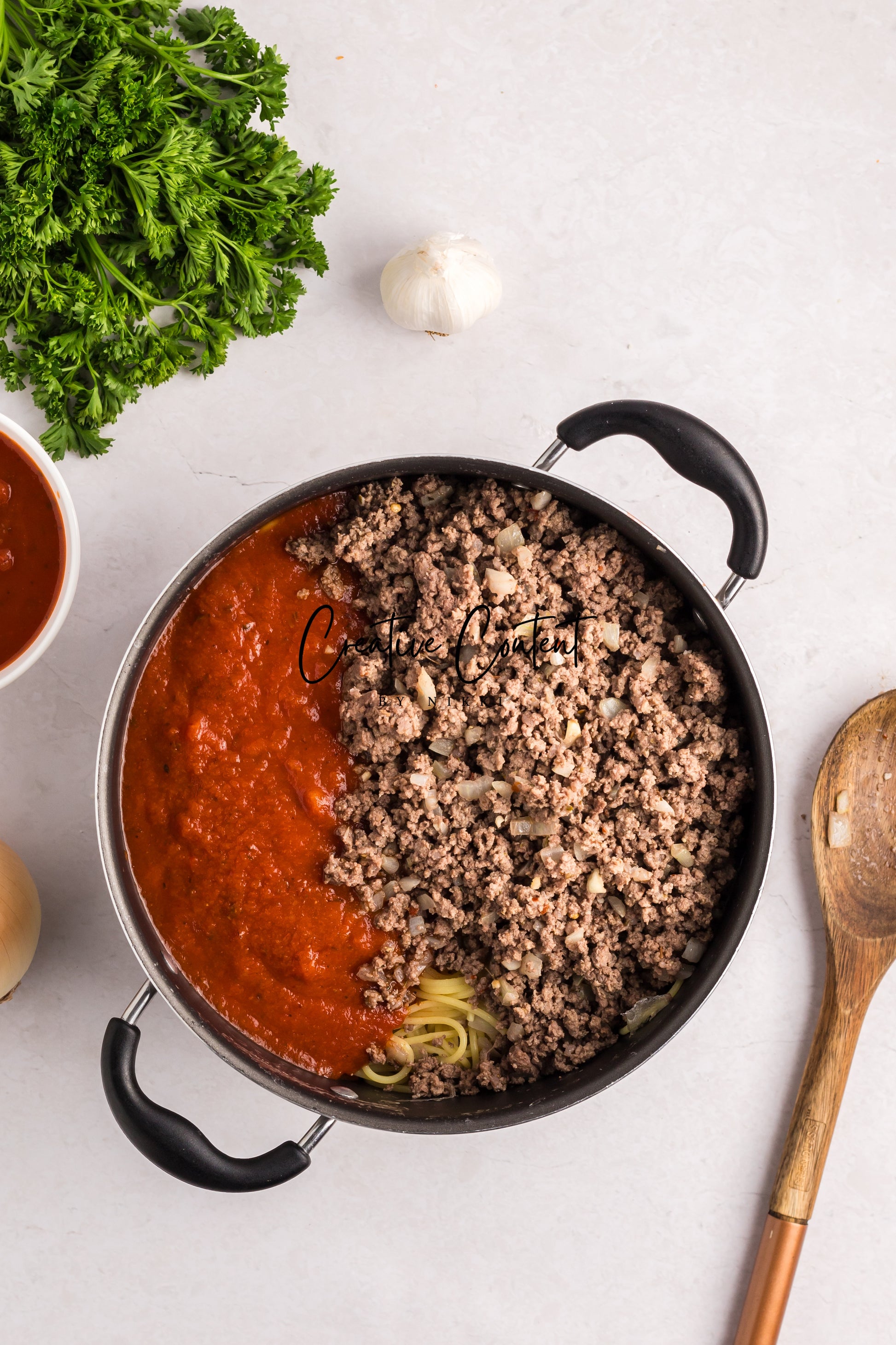 - Featured Ingredients; ricotta cheese, mozzarella cheese, parmesan cheese, egg, ground beef, yellow onion, garlic cloves, garlic powder, onion powder, Italian seasoning, oregano flakes, red pepper flakes, coarse kosher salt, black pepper, spaghetti, spaghetti sauce, cheddar cheese, and parsley.