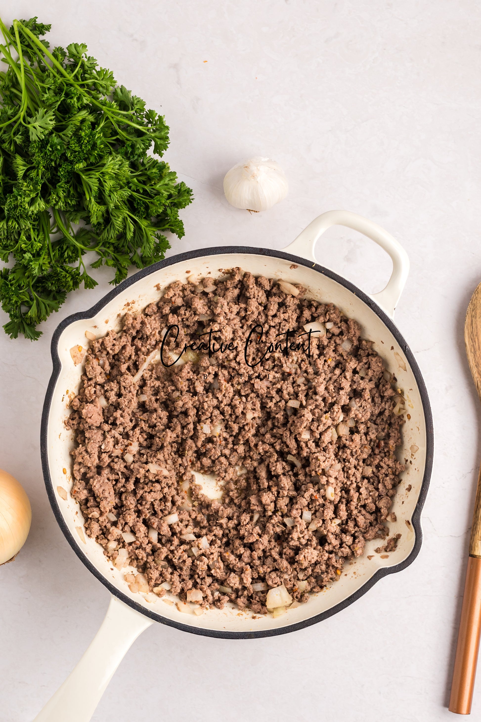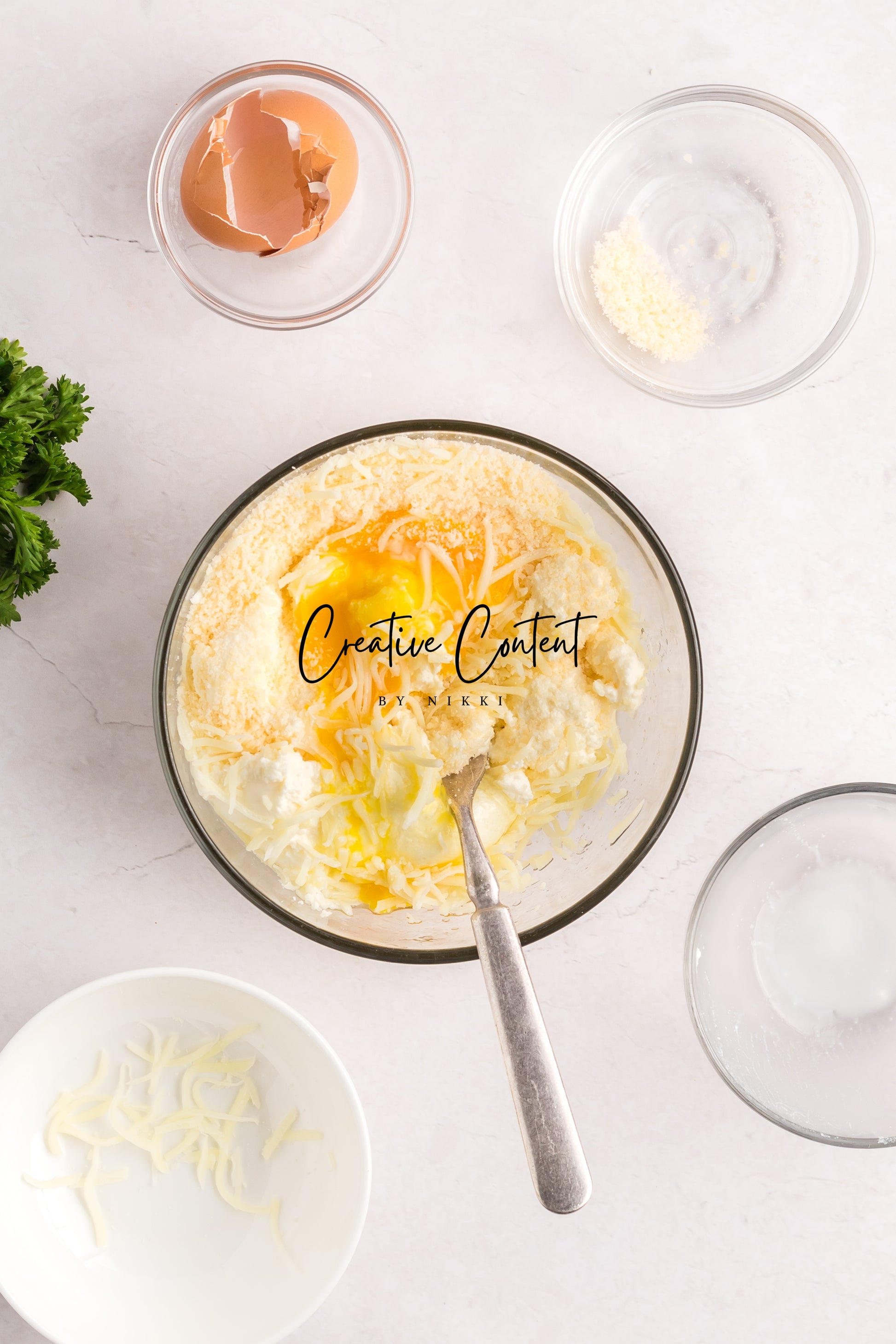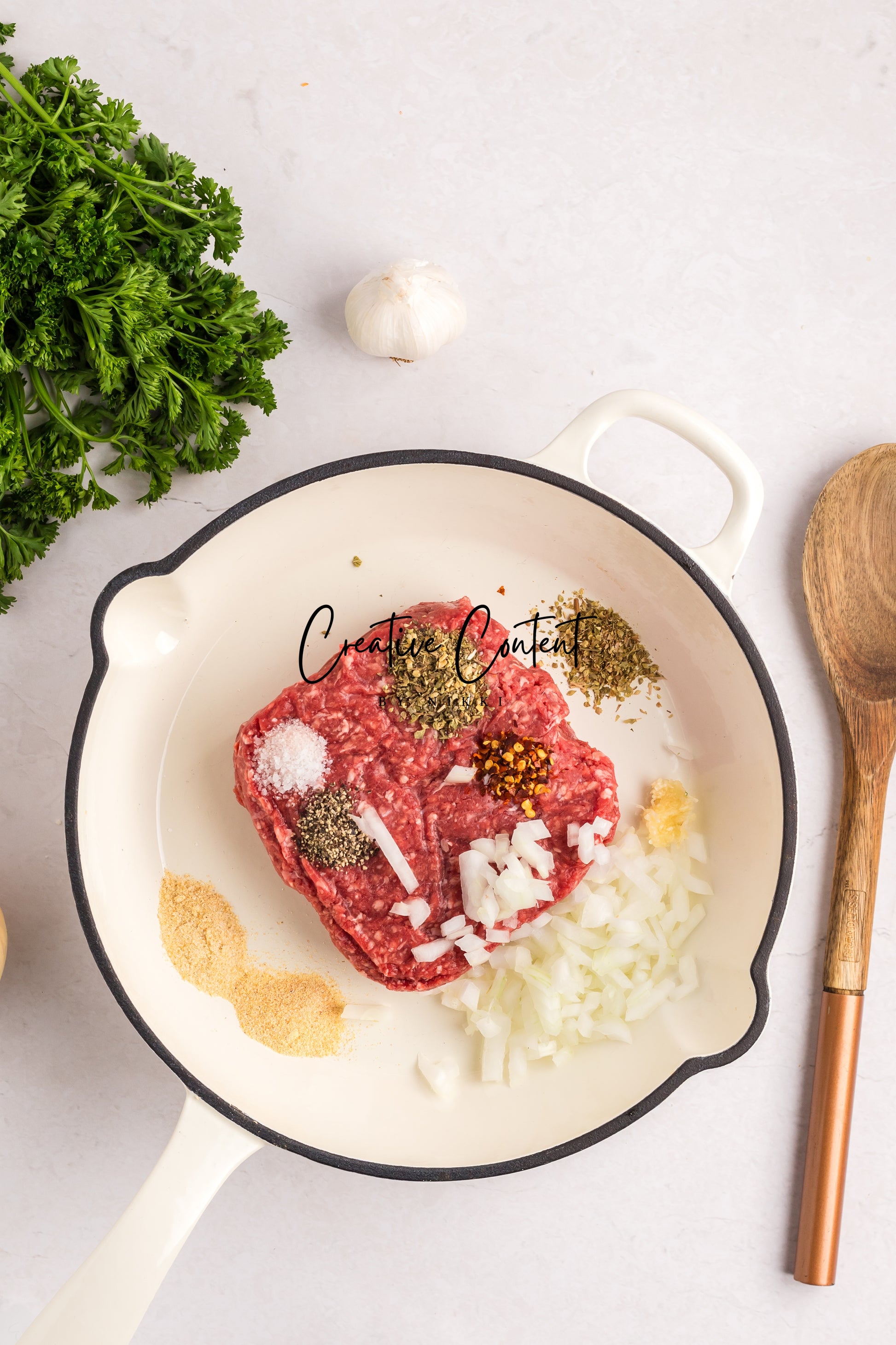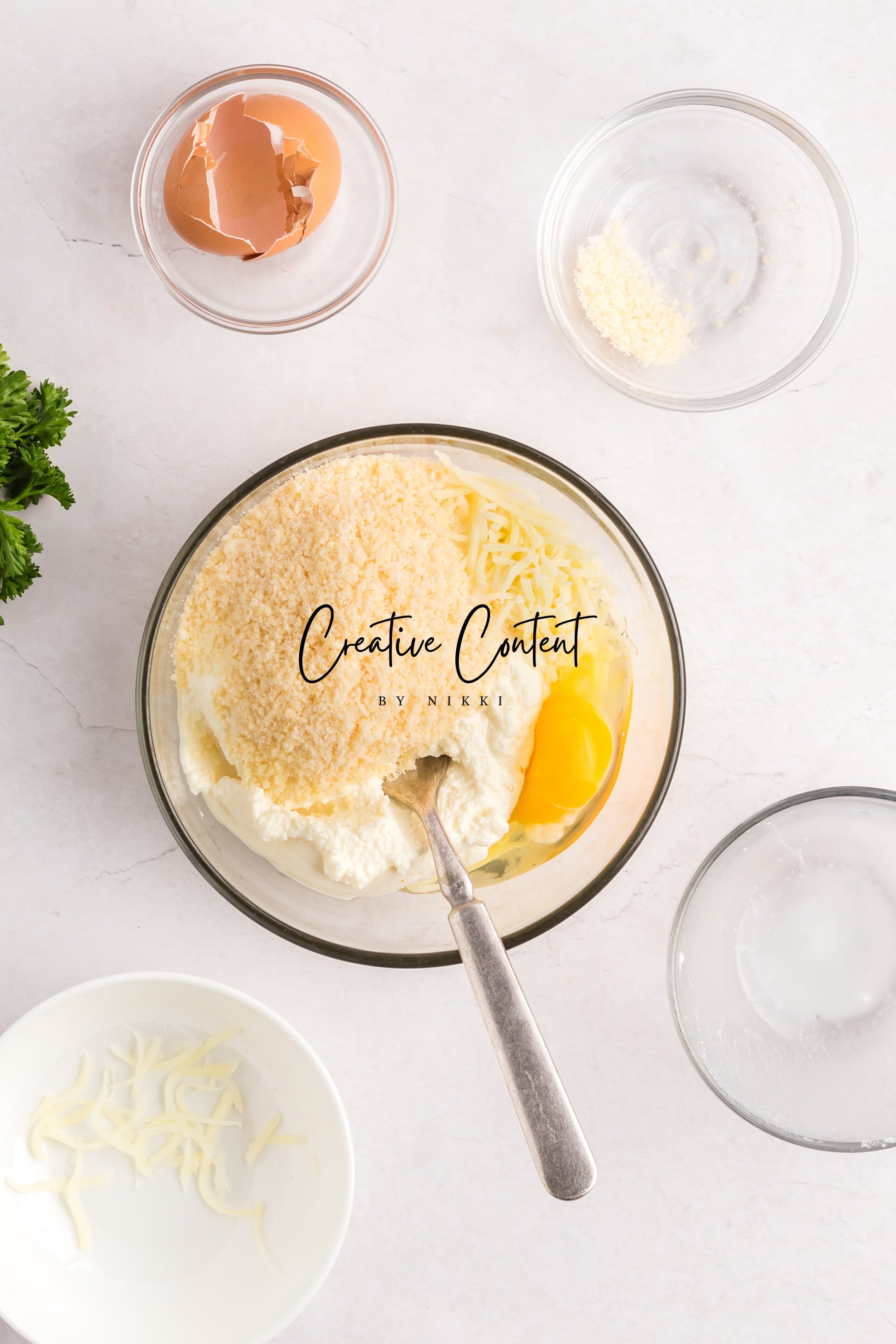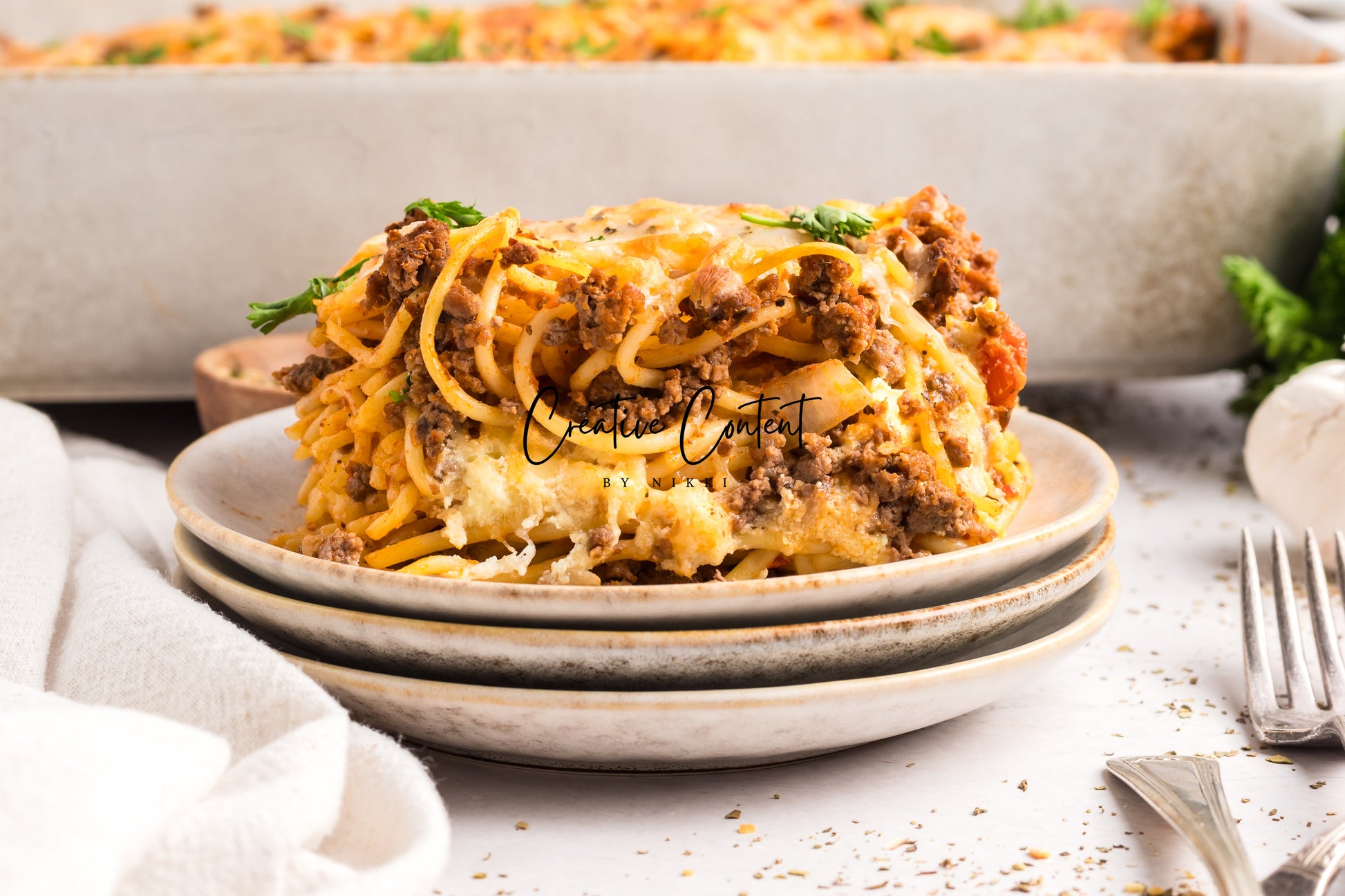 - Featured Ingredients; ricotta cheese, mozzarella cheese, parmesan cheese, egg, ground beef, yellow onion, garlic cloves, garlic powder, onion powder, Italian seasoning, oregano flakes, red pepper flakes, coarse kosher salt, black pepper, spaghetti, spaghetti sauce, cheddar cheese, and parsley.