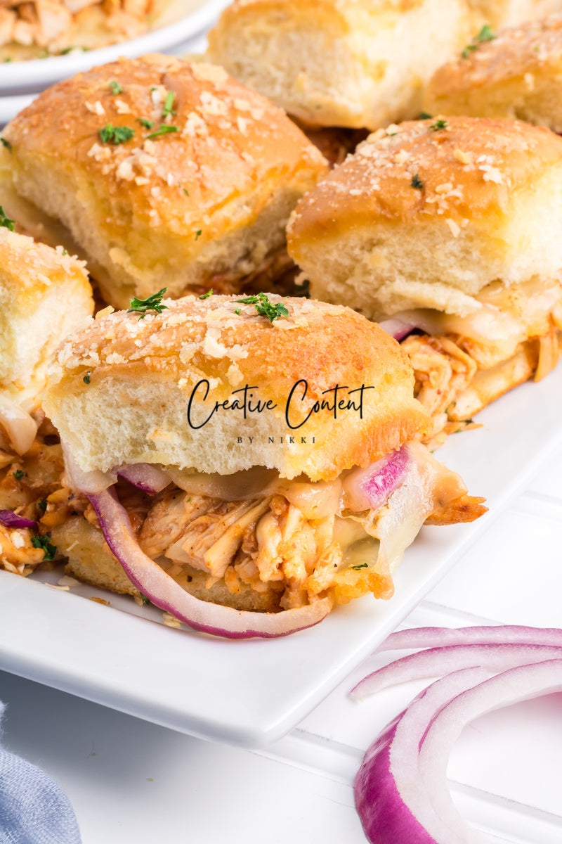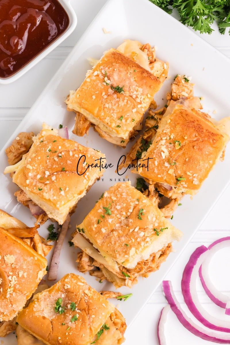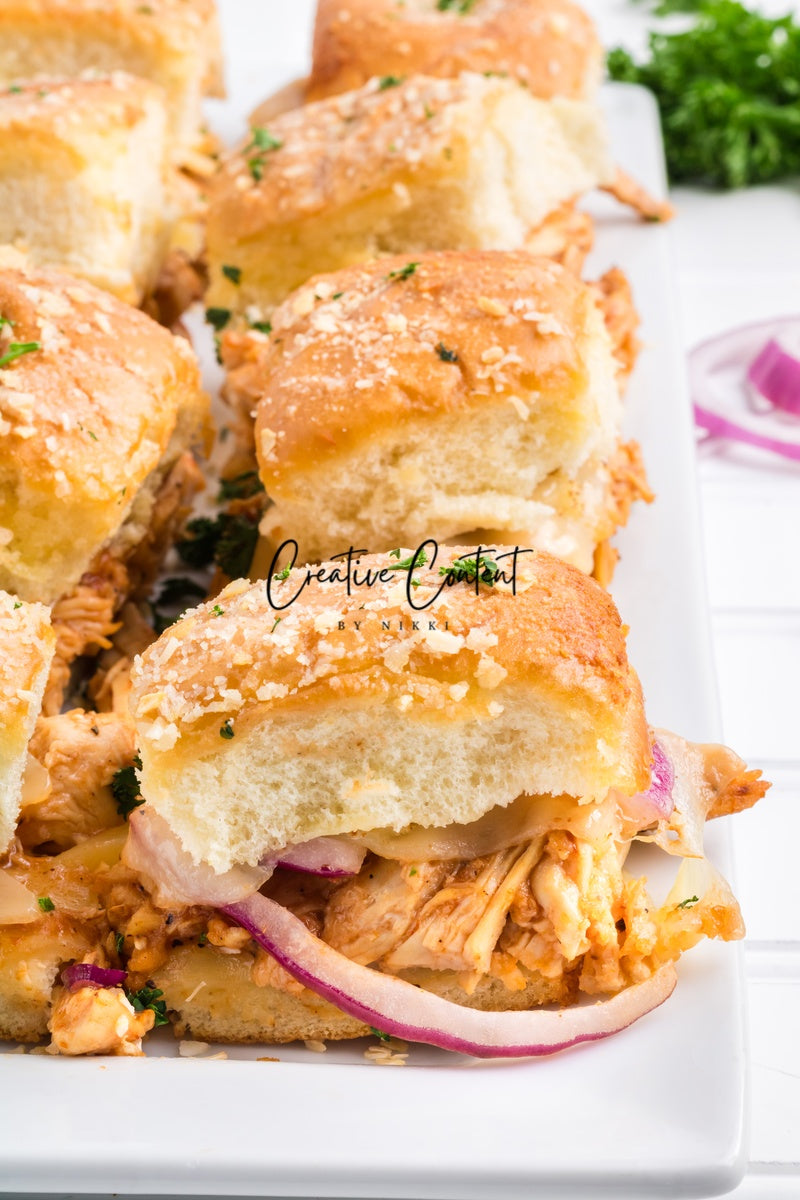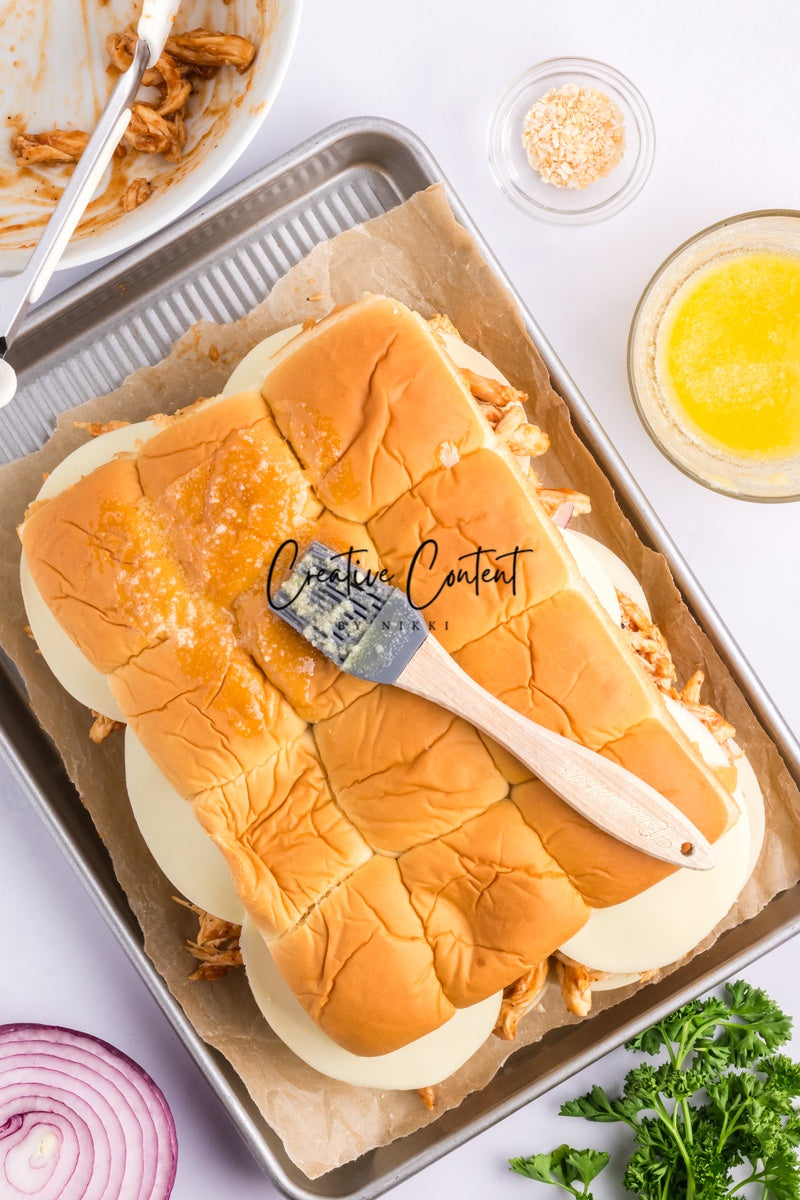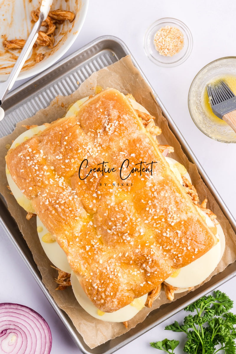 Featured Ingredients; Hawaiian rolls, provolone cheese, shredded chicken, barbecue sauce, red onion, salted butter, parmesan cheese, and garlic powder