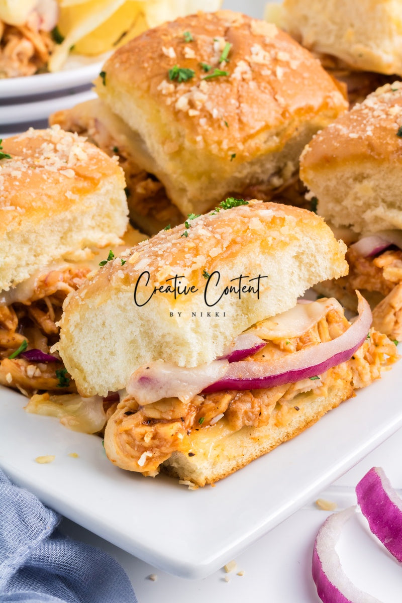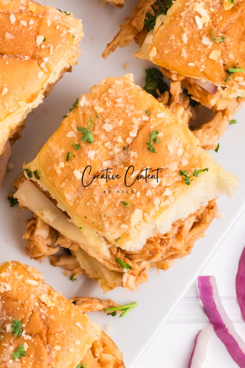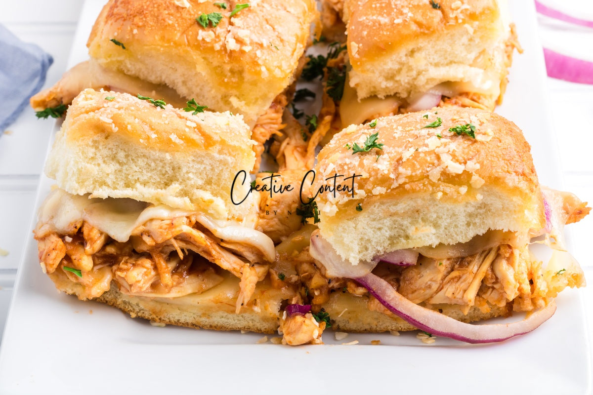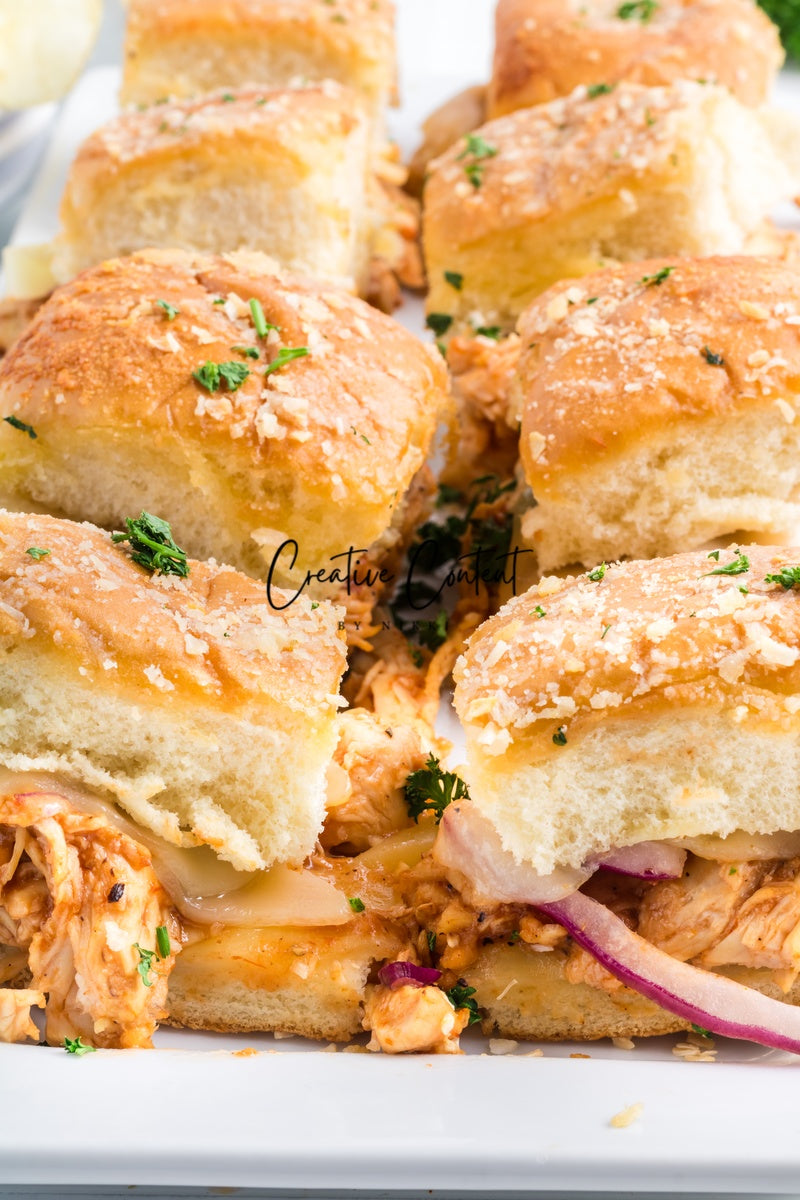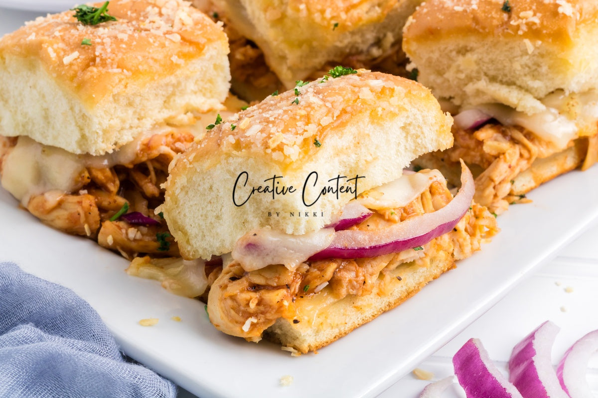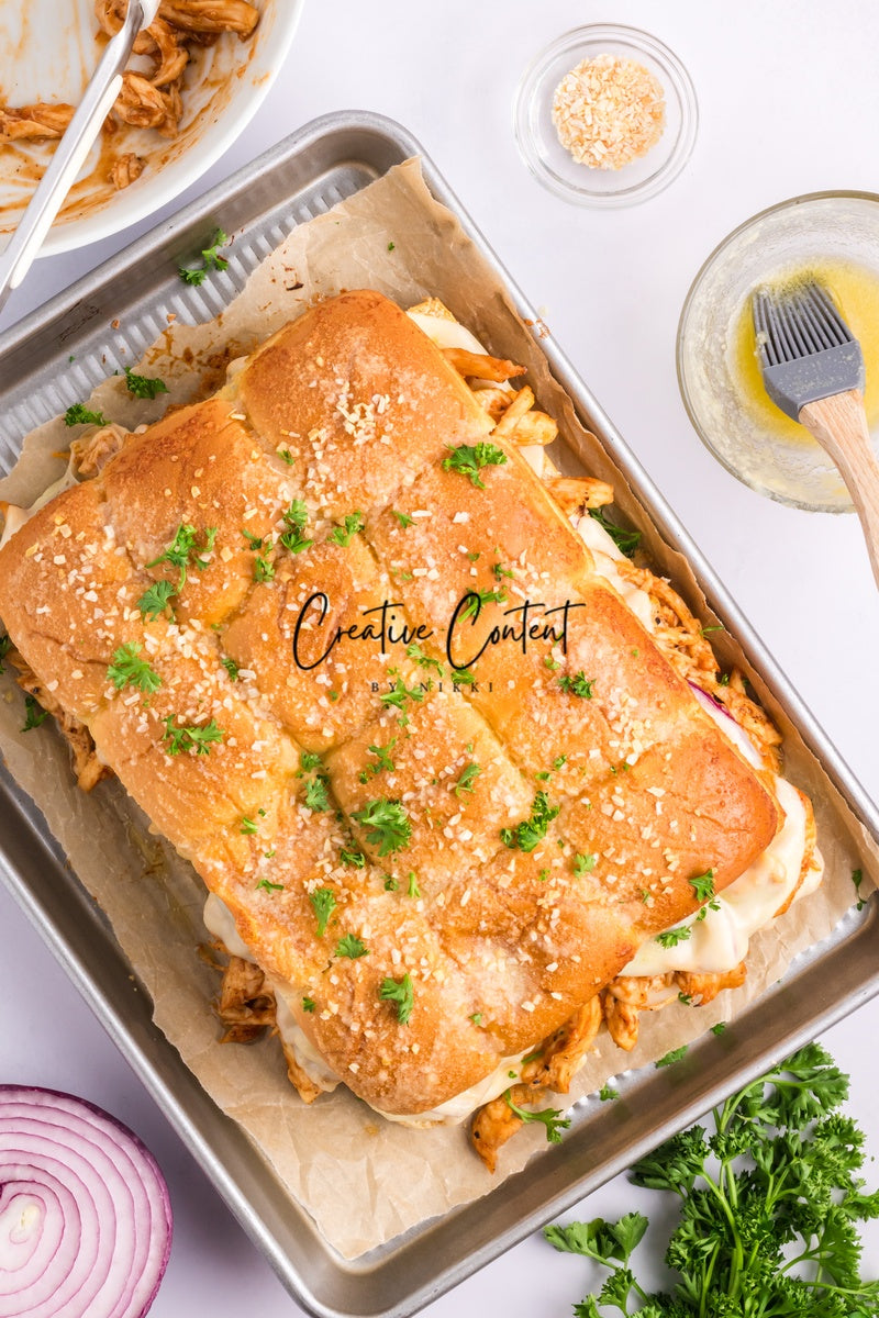 Featured Ingredients; Hawaiian rolls, provolone cheese, shredded chicken, barbecue sauce, red onion, salted butter, parmesan cheese, and garlic powder