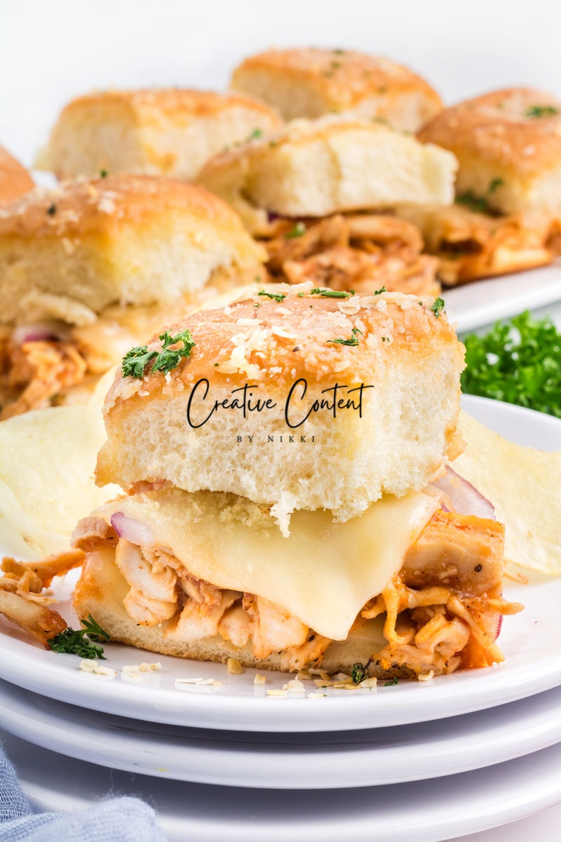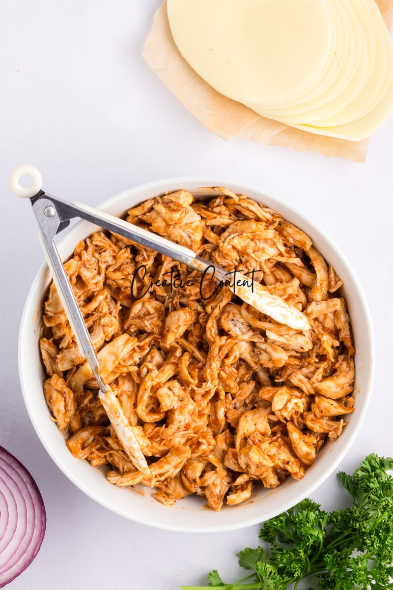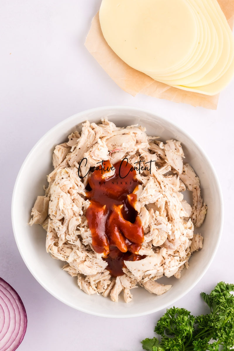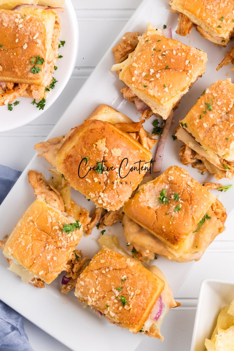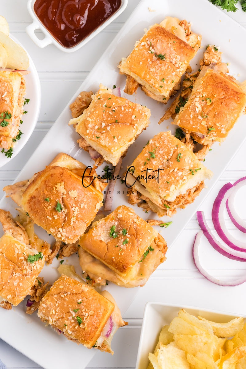 Featured Ingredients; Hawaiian rolls, provolone cheese, shredded chicken, barbecue sauce, red onion, salted butter, parmesan cheese, and garlic powder