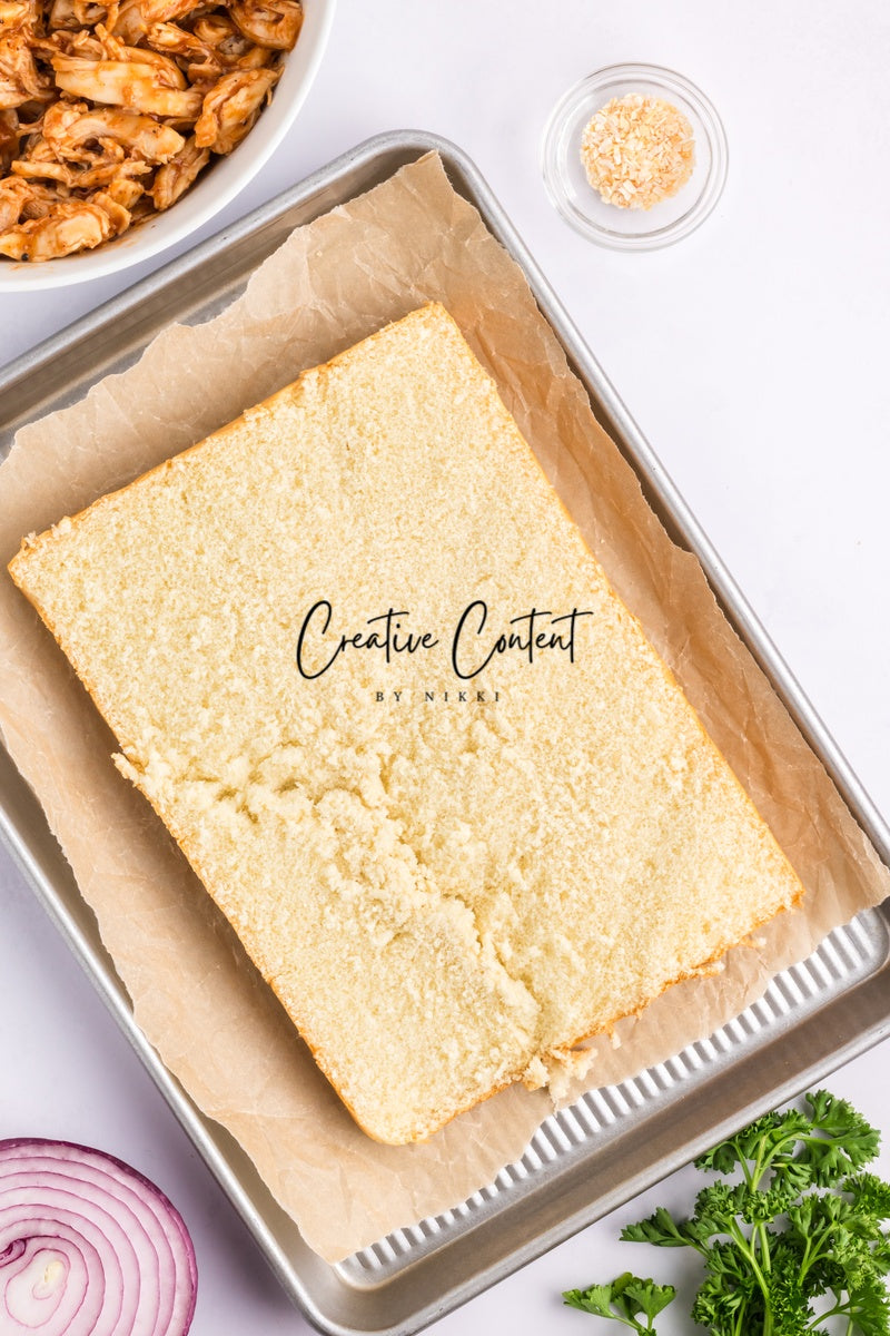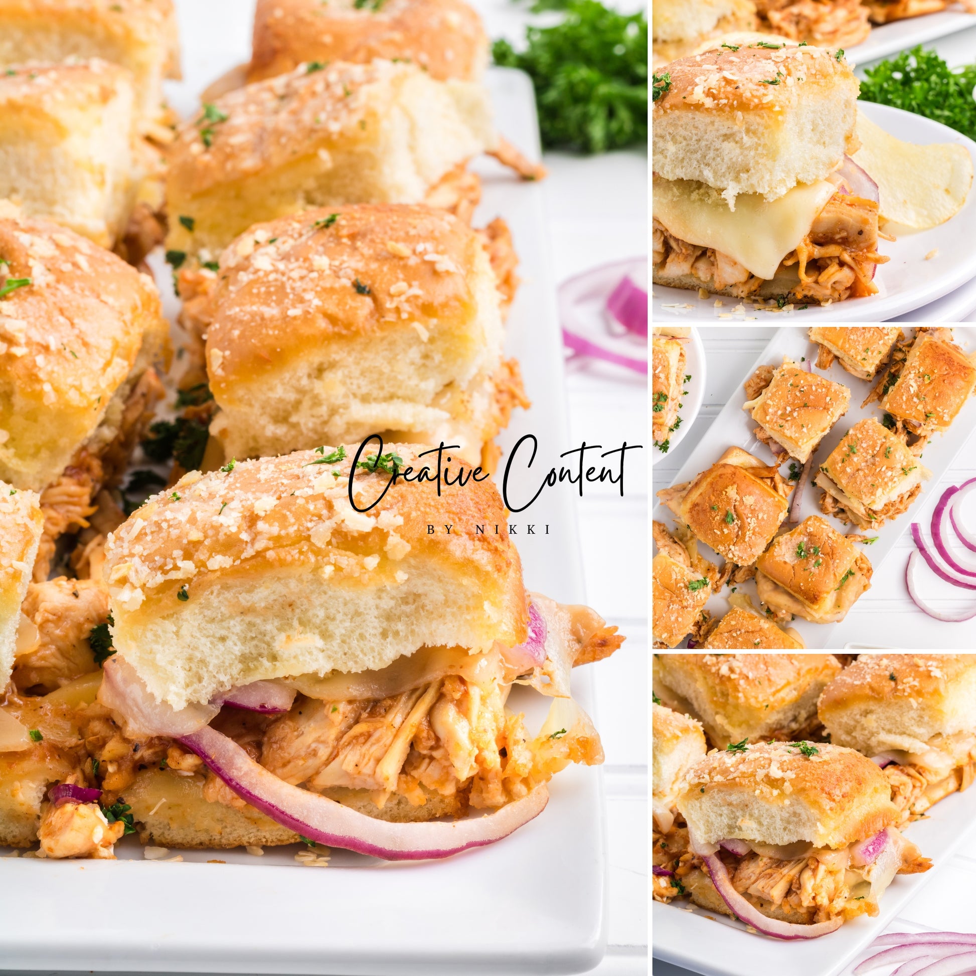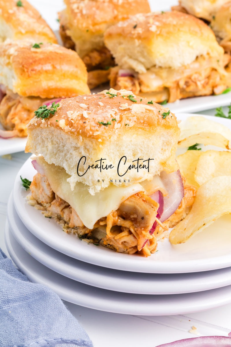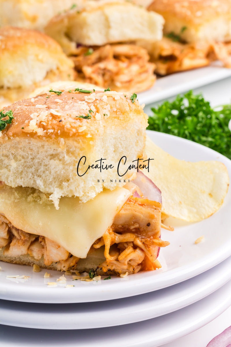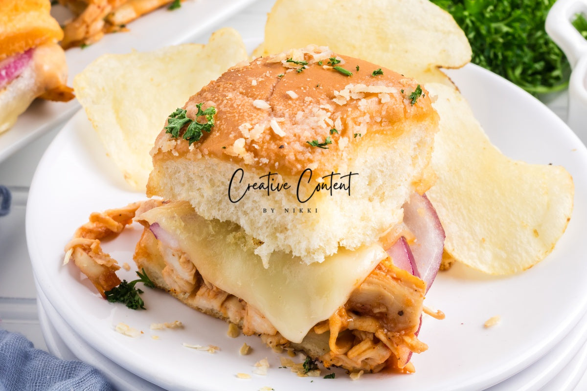 Featured Ingredients; Hawaiian rolls, provolone cheese, shredded chicken, barbecue sauce, red onion, salted butter, parmesan cheese, and garlic powder