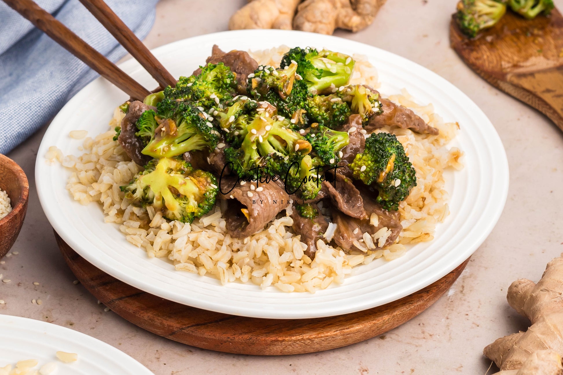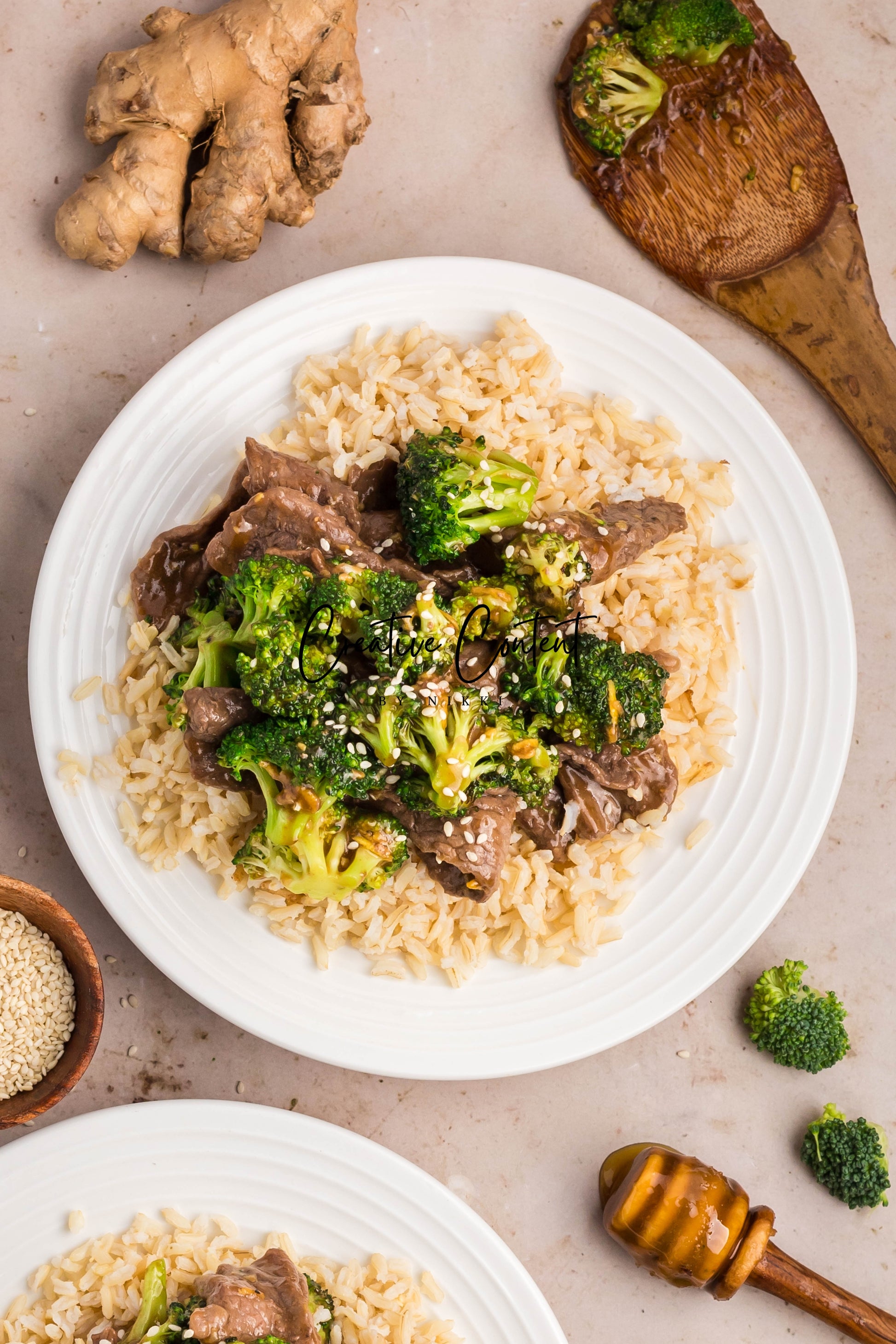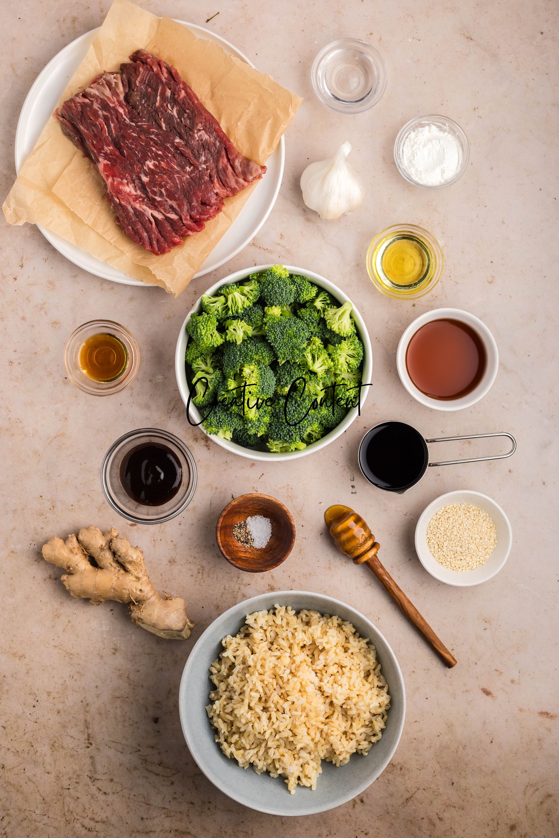 - Ingredients: cornstarch, water, broccoli florets, avocado oil, flank steak or beef bottom round steak, coarse kosher salt, black pepper, ginger, garlic, beef stock, light sodium soy sauce, honey, oyster sauce, sesame oil, sesame seeds, cooked rice