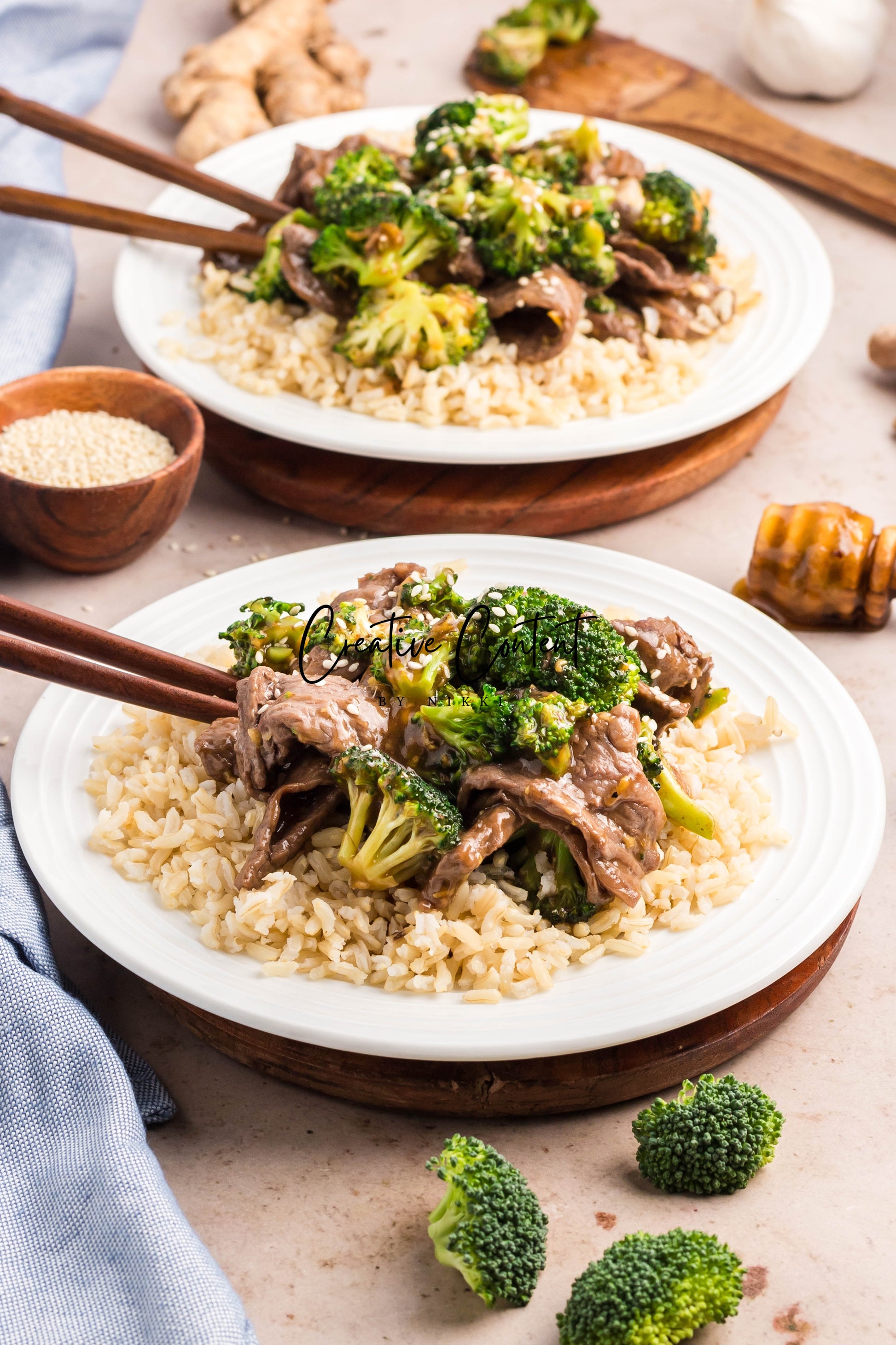 This beef and broccoli dish serves two and can be prepared in just 20 minutes. The flank steak is quickly cooked with garlic and ginger, then paired with tender broccoli. A savory sauce made from beef stock, soy sauce, and honey brings everything together. Serve it over a bed of rice for a satisfying, balanced meal that's perfect for a busy weeknight.