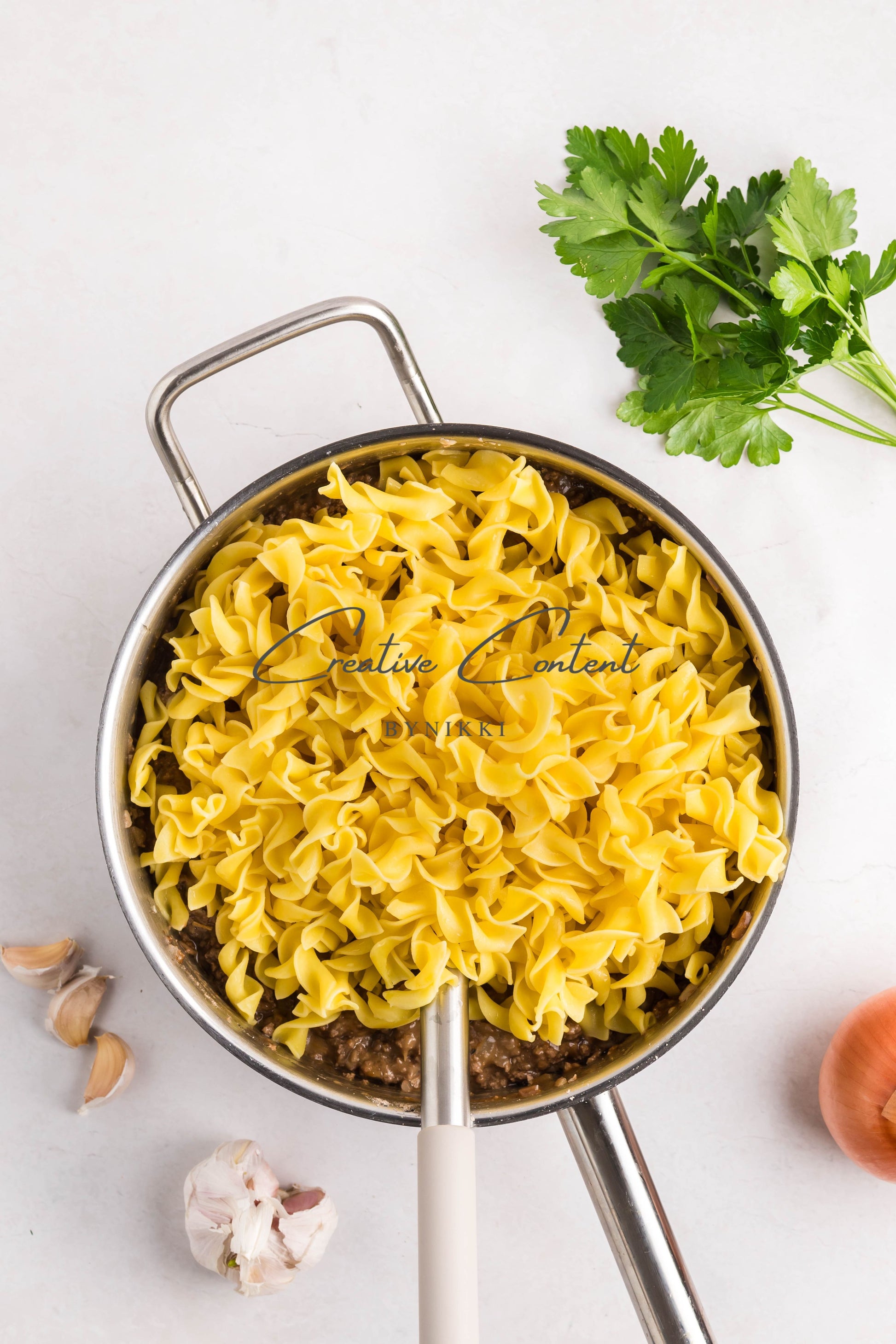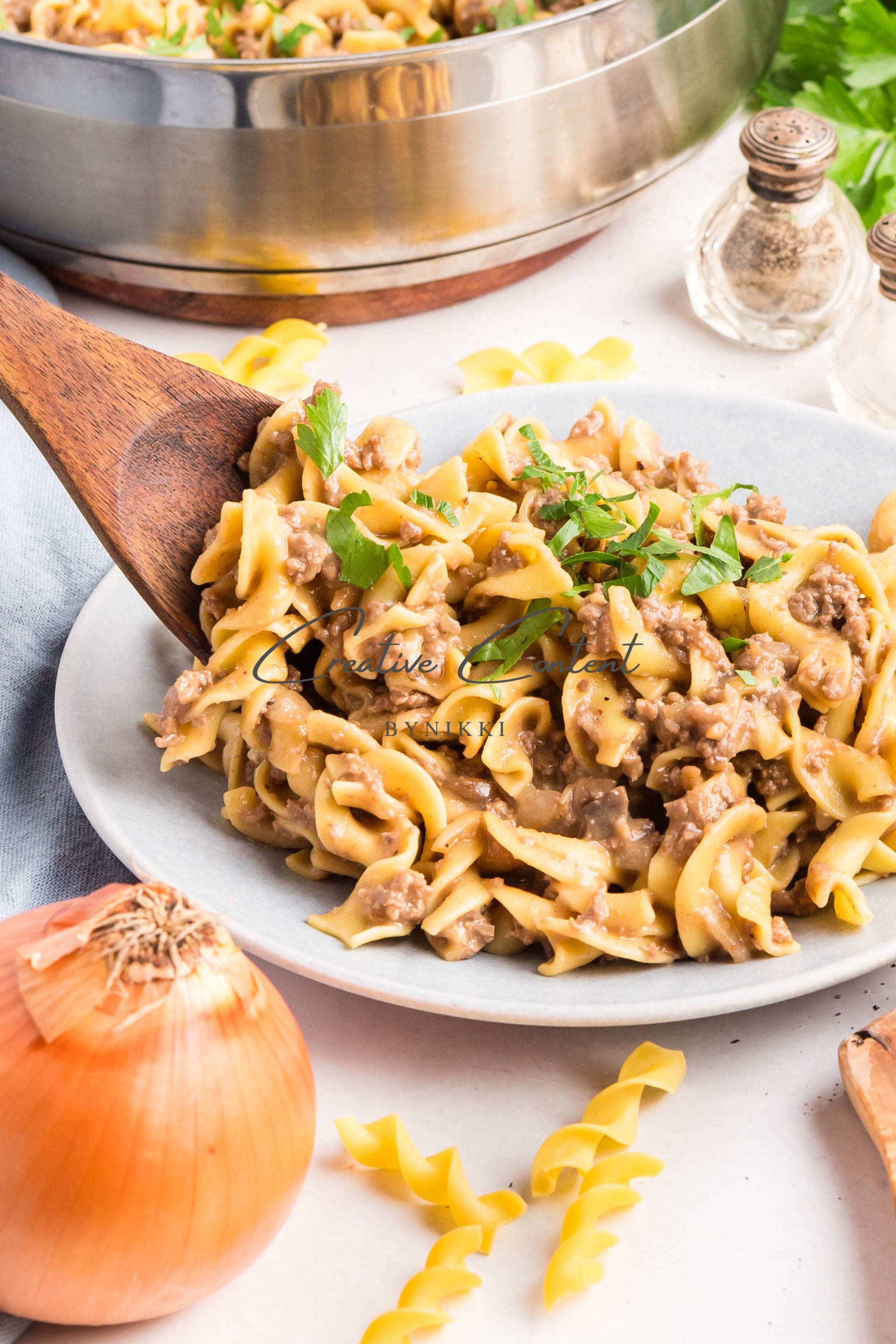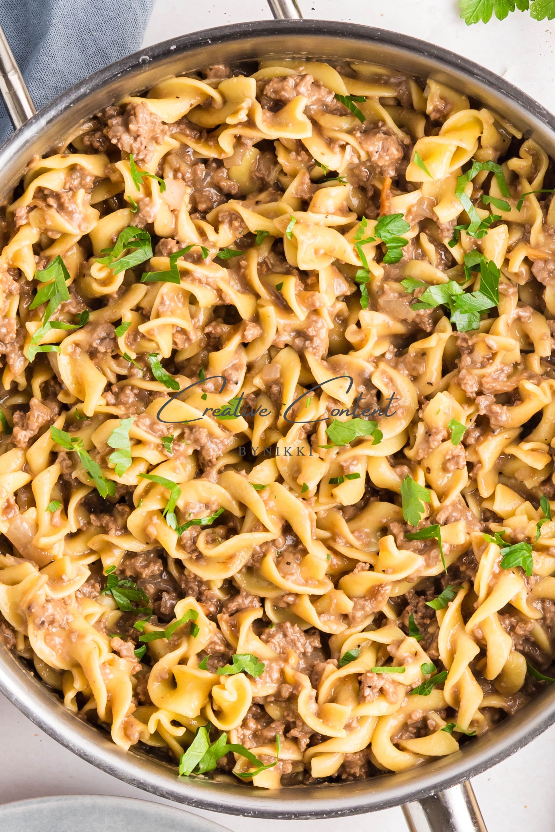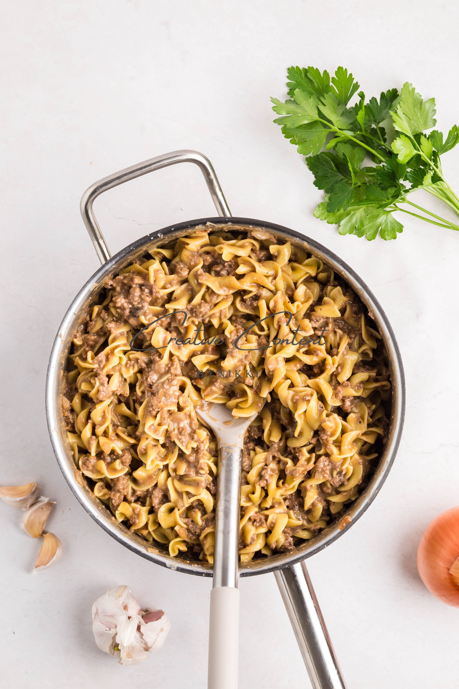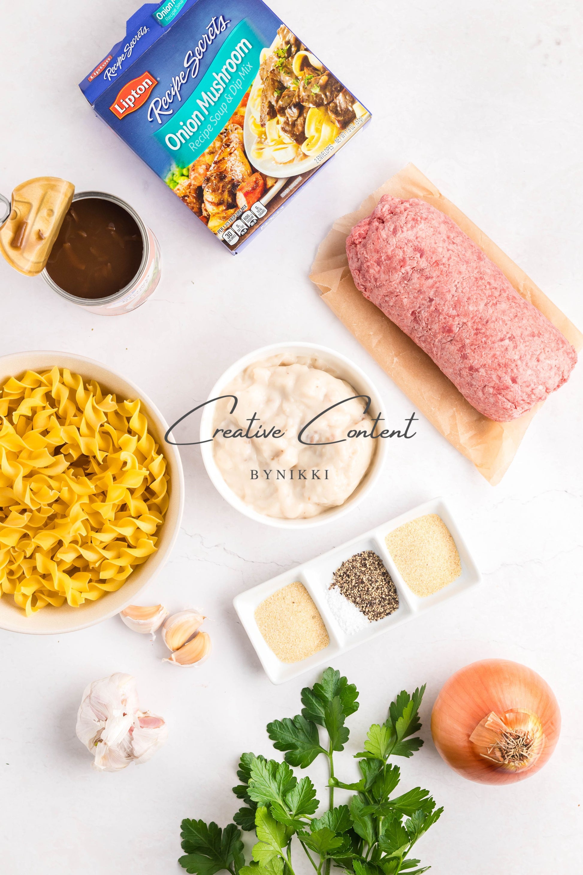 - Ingredients: egg noodles, ground beef, onion, garlic, garlic powder, onion powder, black pepper, mushroom soup, brown gravy, Lipton Onion Mushroom Soup and Dip Mix, fresh parsley