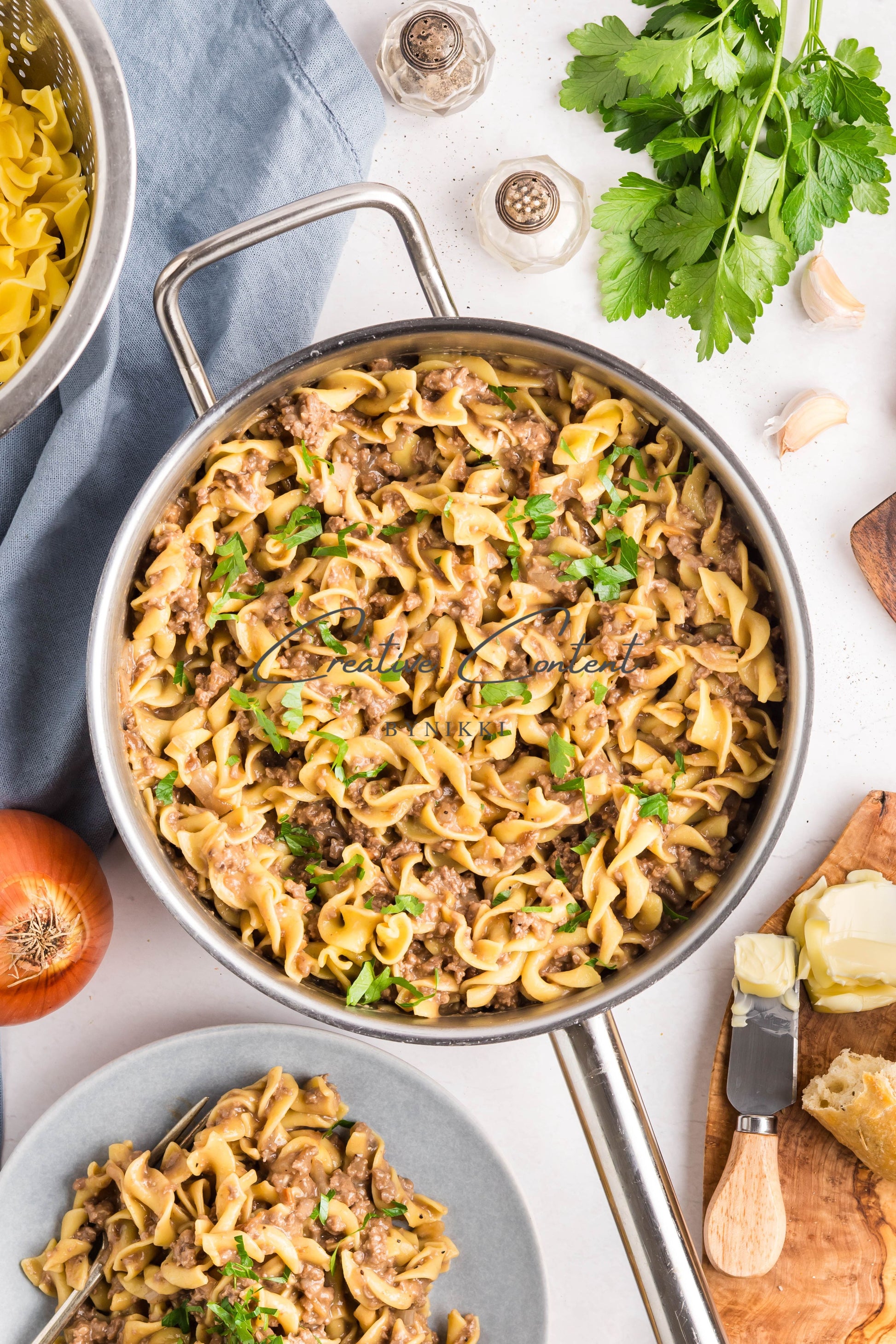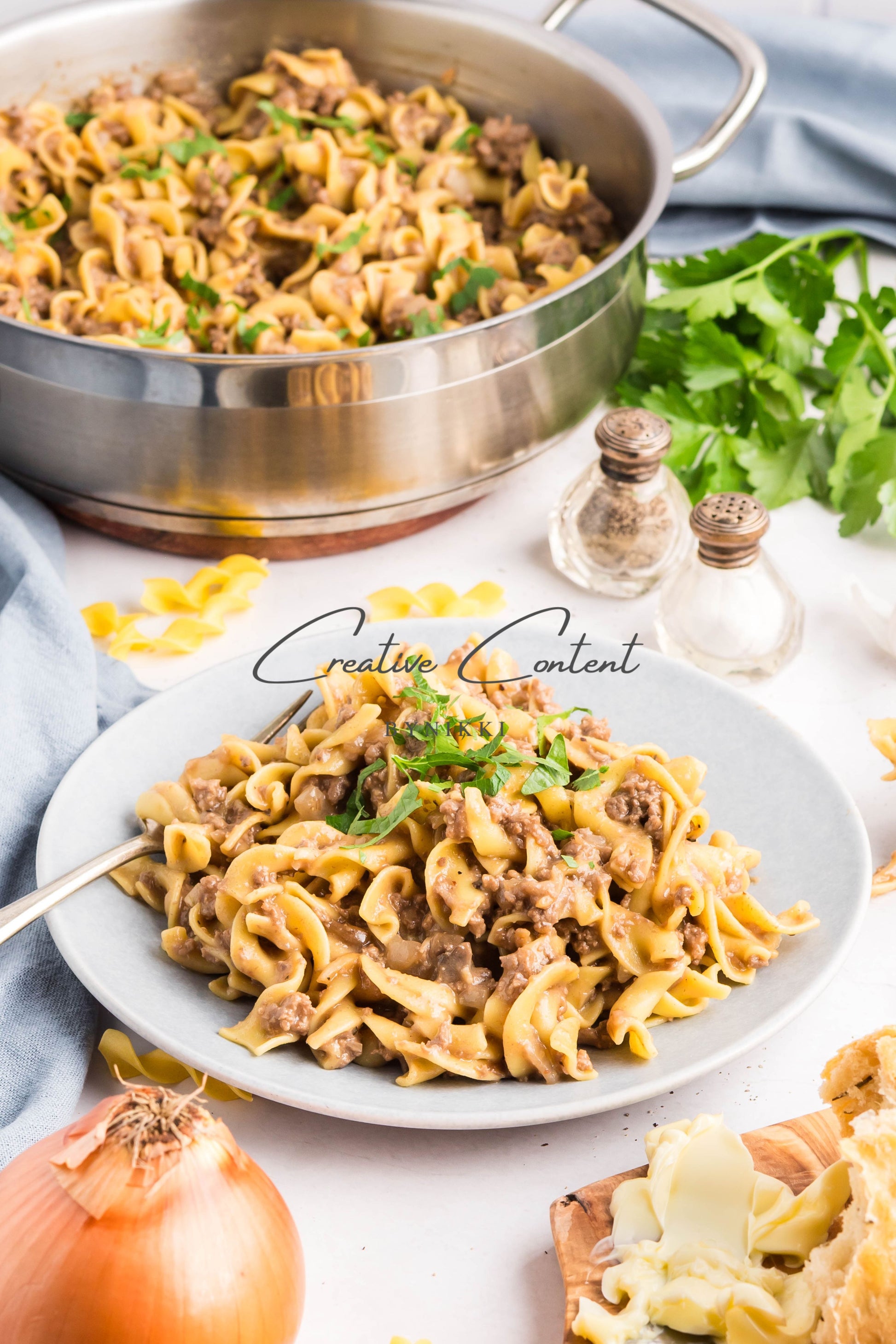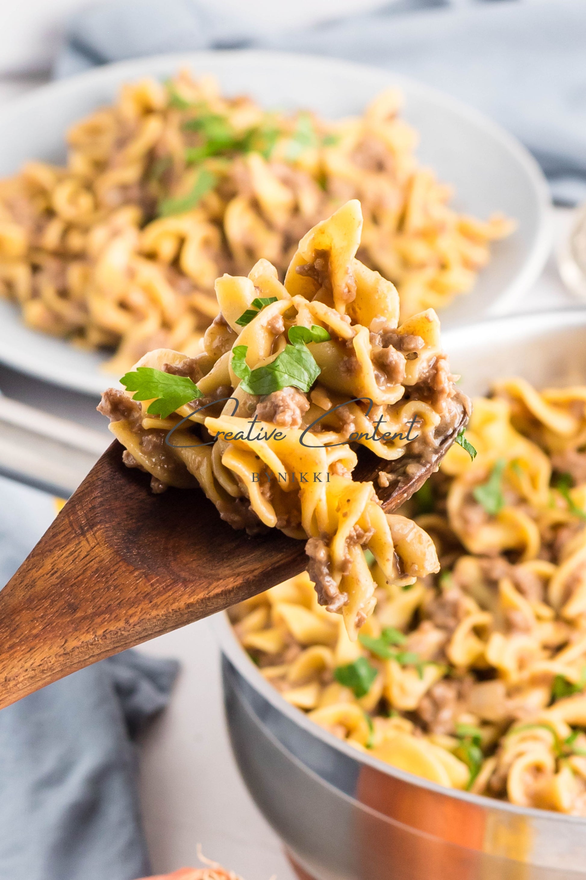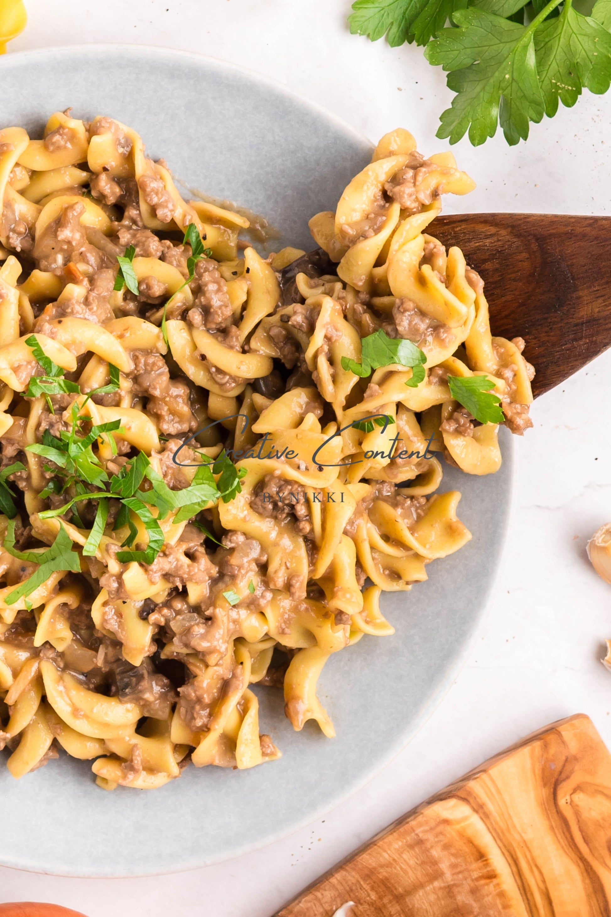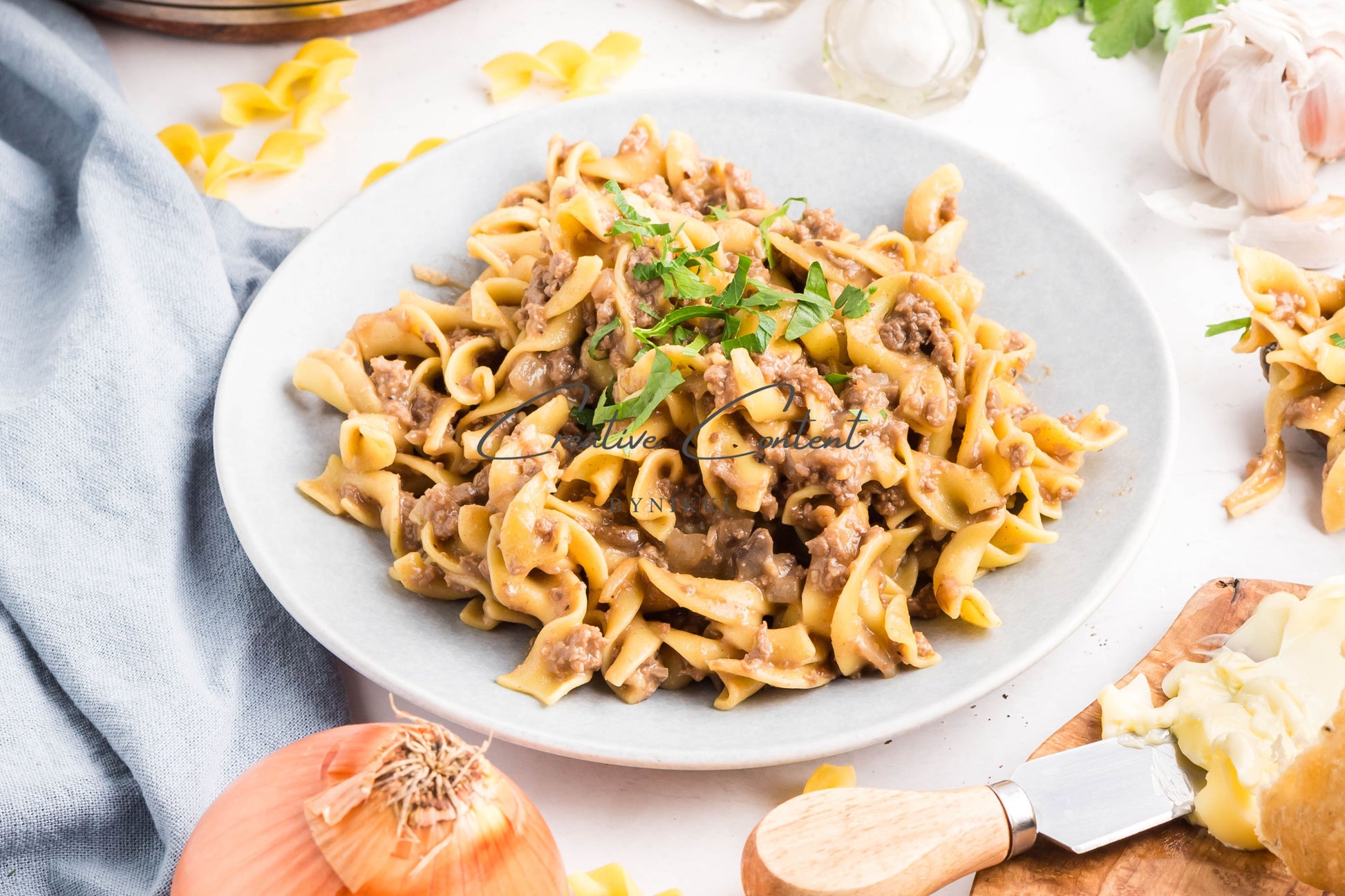 - Ingredients: egg noodles, ground beef, onion, garlic, garlic powder, onion powder, black pepper, mushroom soup, brown gravy, Lipton Onion Mushroom Soup and Dip Mix, fresh parsley