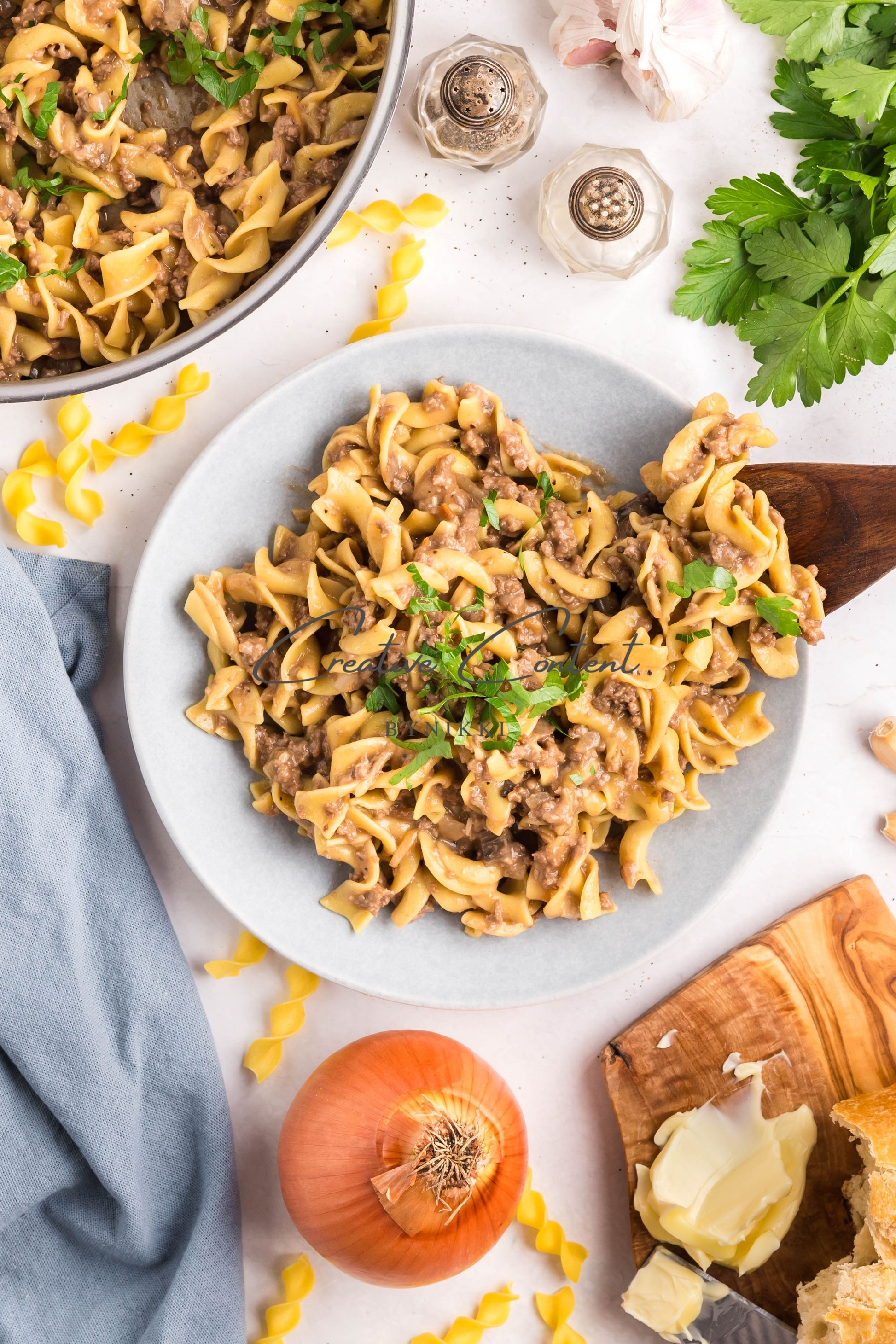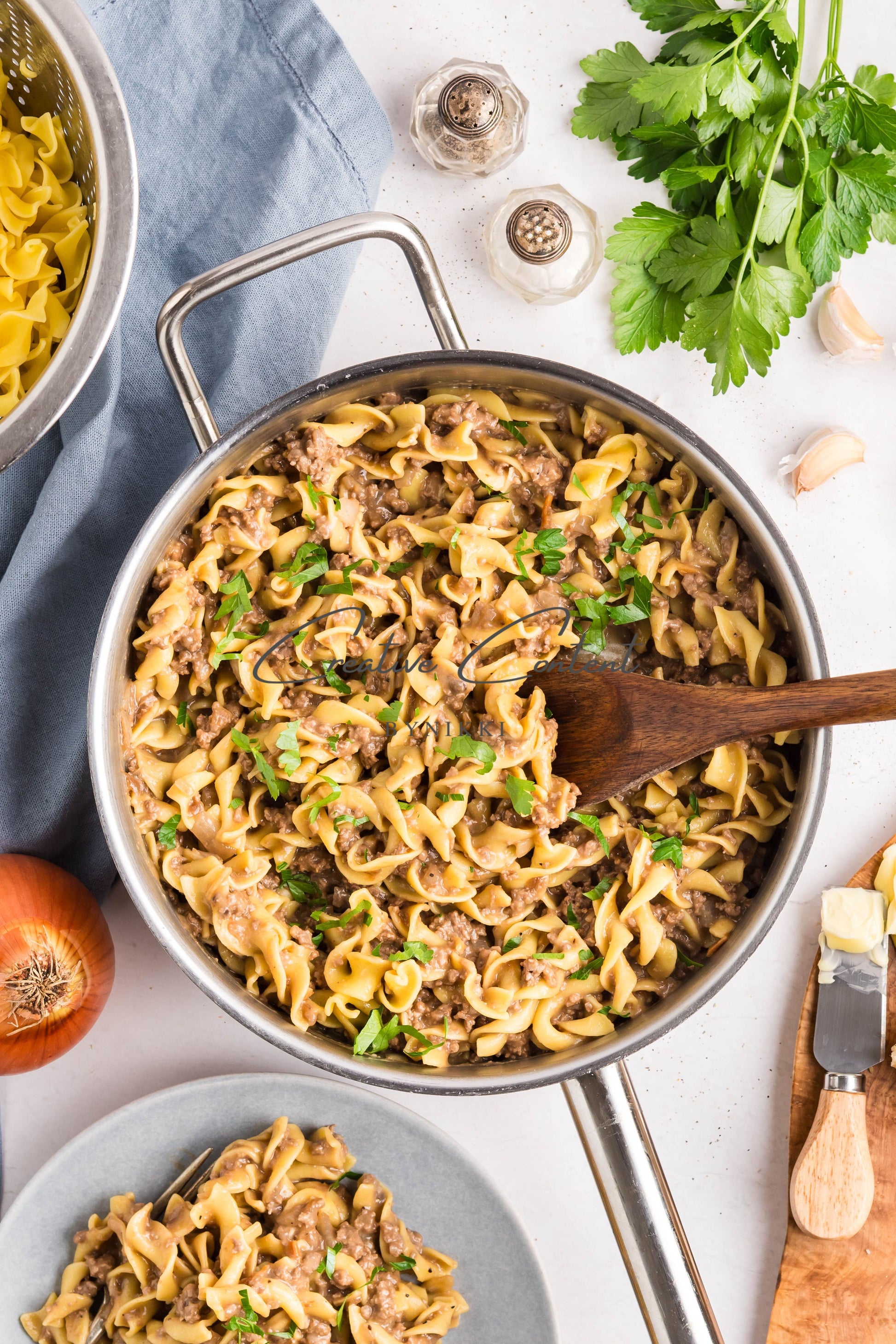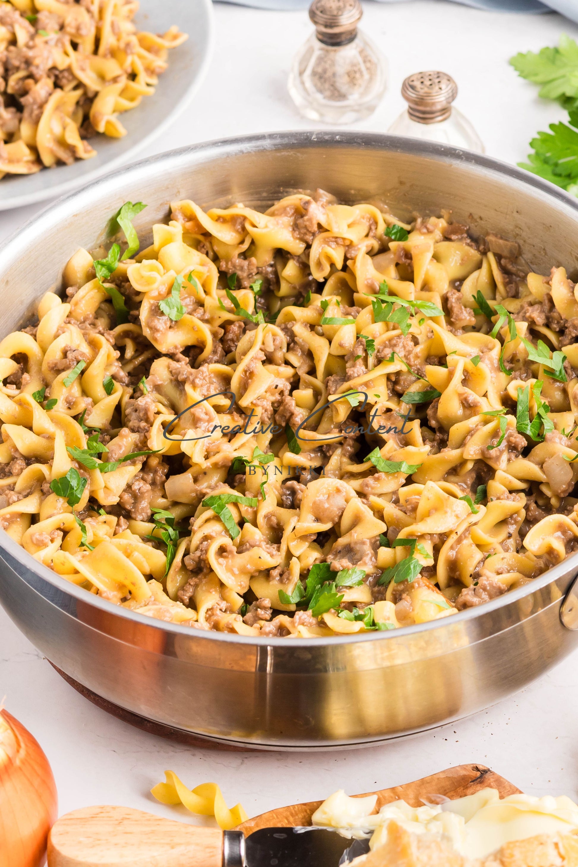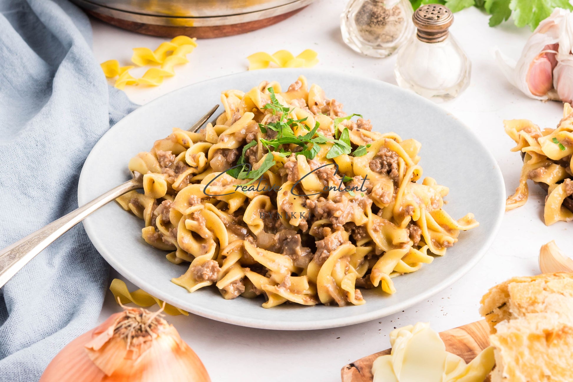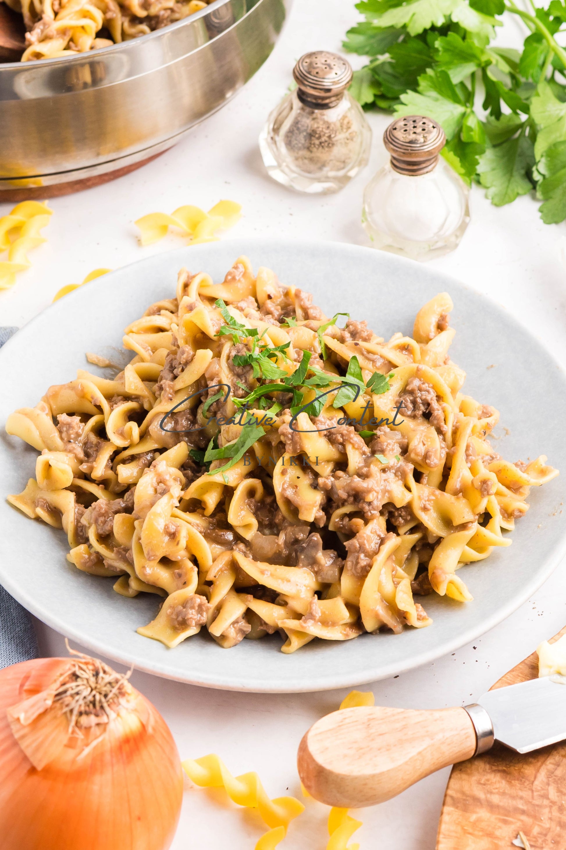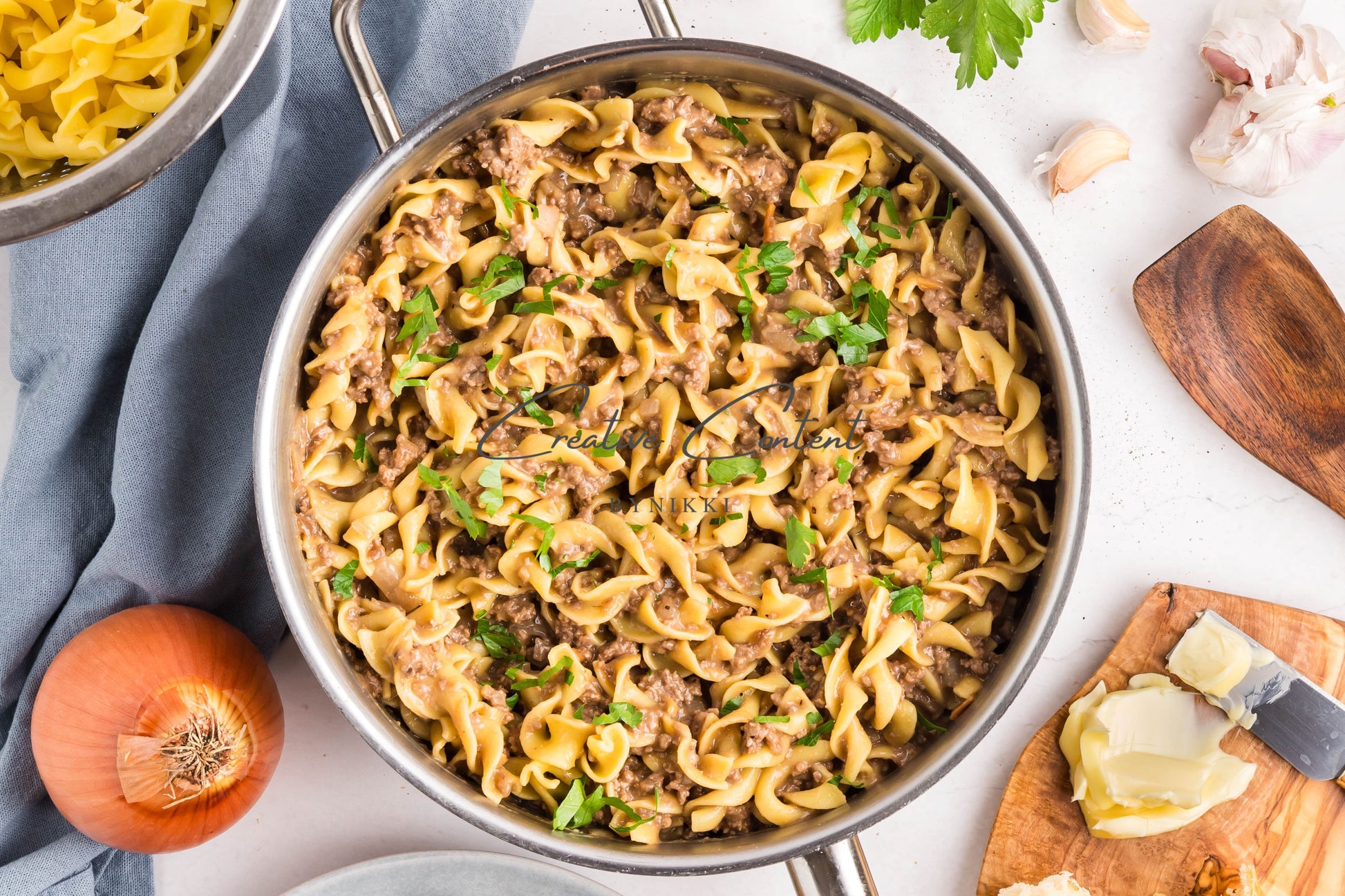 - Ingredients: egg noodles, ground beef, onion, garlic, garlic powder, onion powder, black pepper, mushroom soup, brown gravy, Lipton Onion Mushroom Soup and Dip Mix, fresh parsley