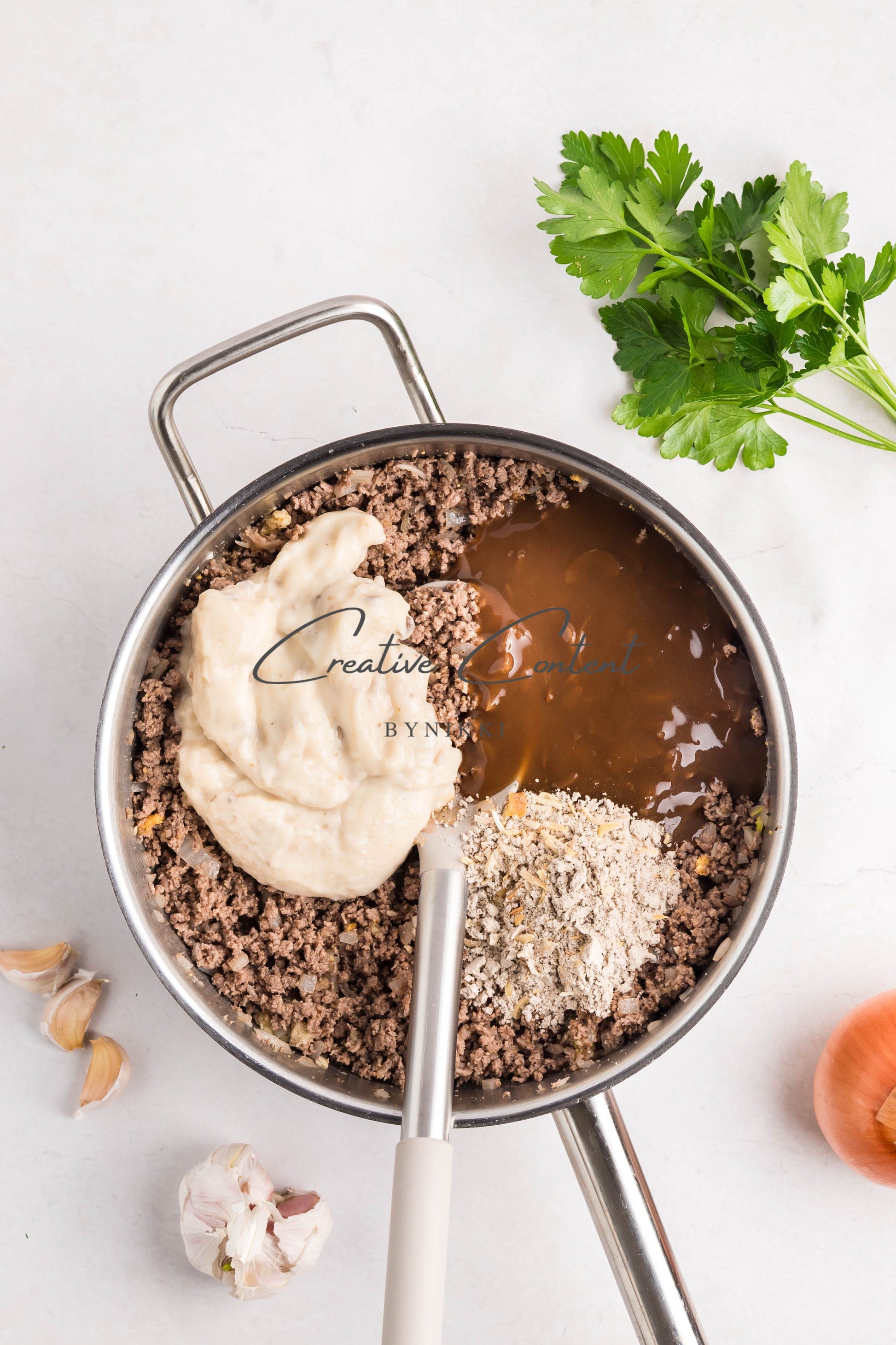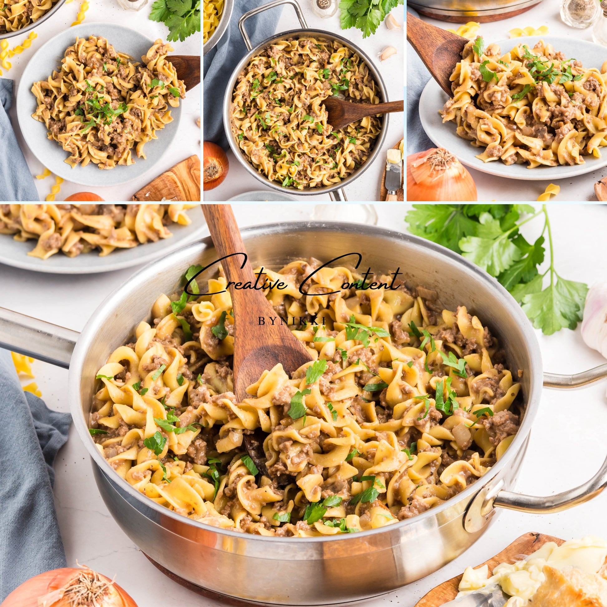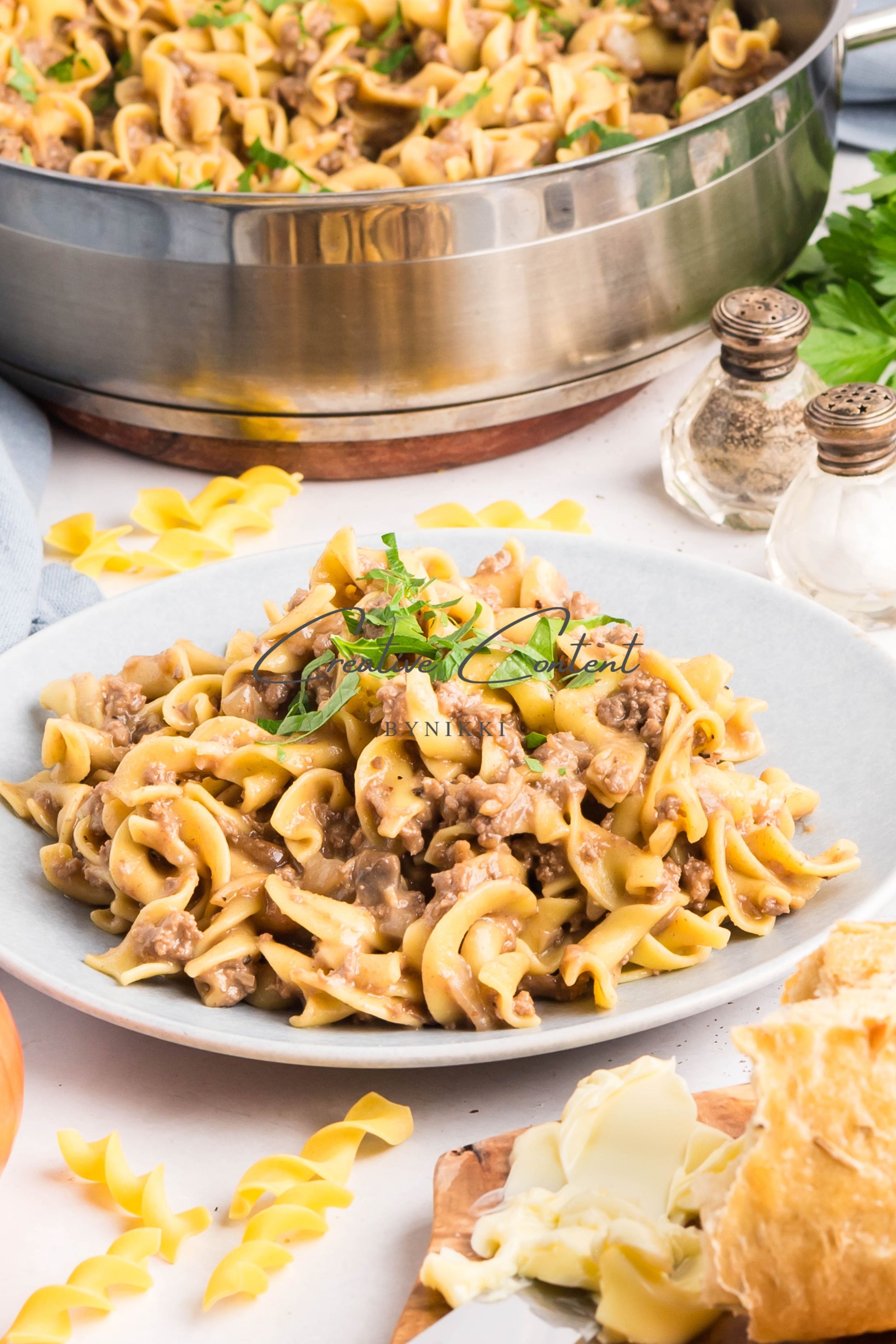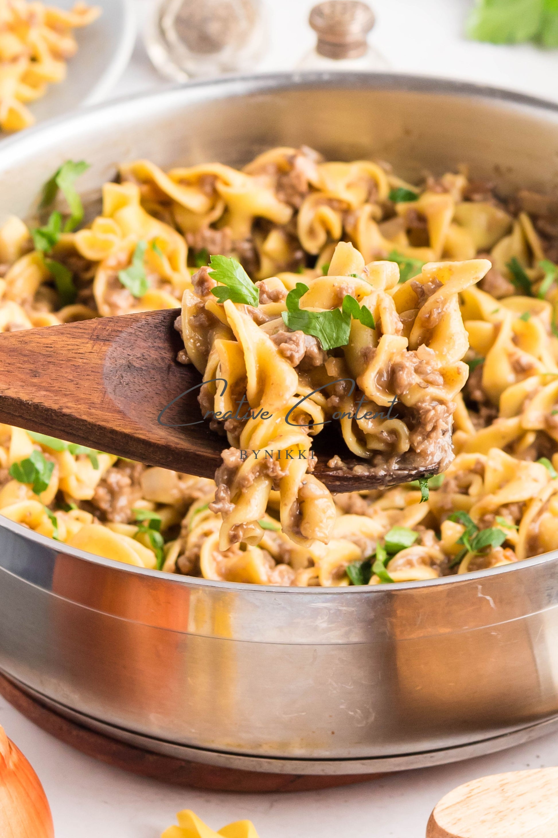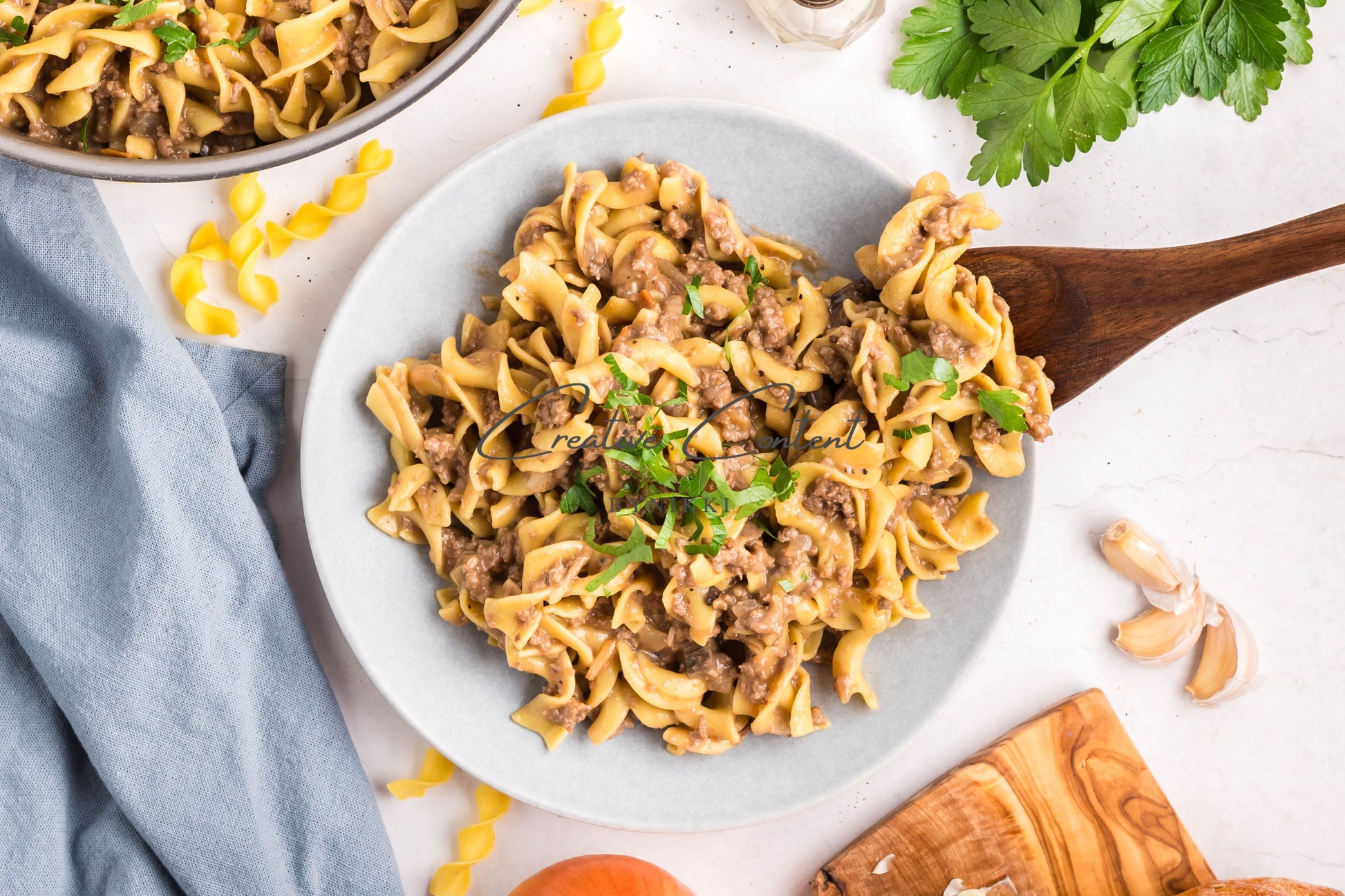 - Ingredients: egg noodles, ground beef, onion, garlic, garlic powder, onion powder, black pepper, mushroom soup, brown gravy, Lipton Onion Mushroom Soup and Dip Mix, fresh parsley