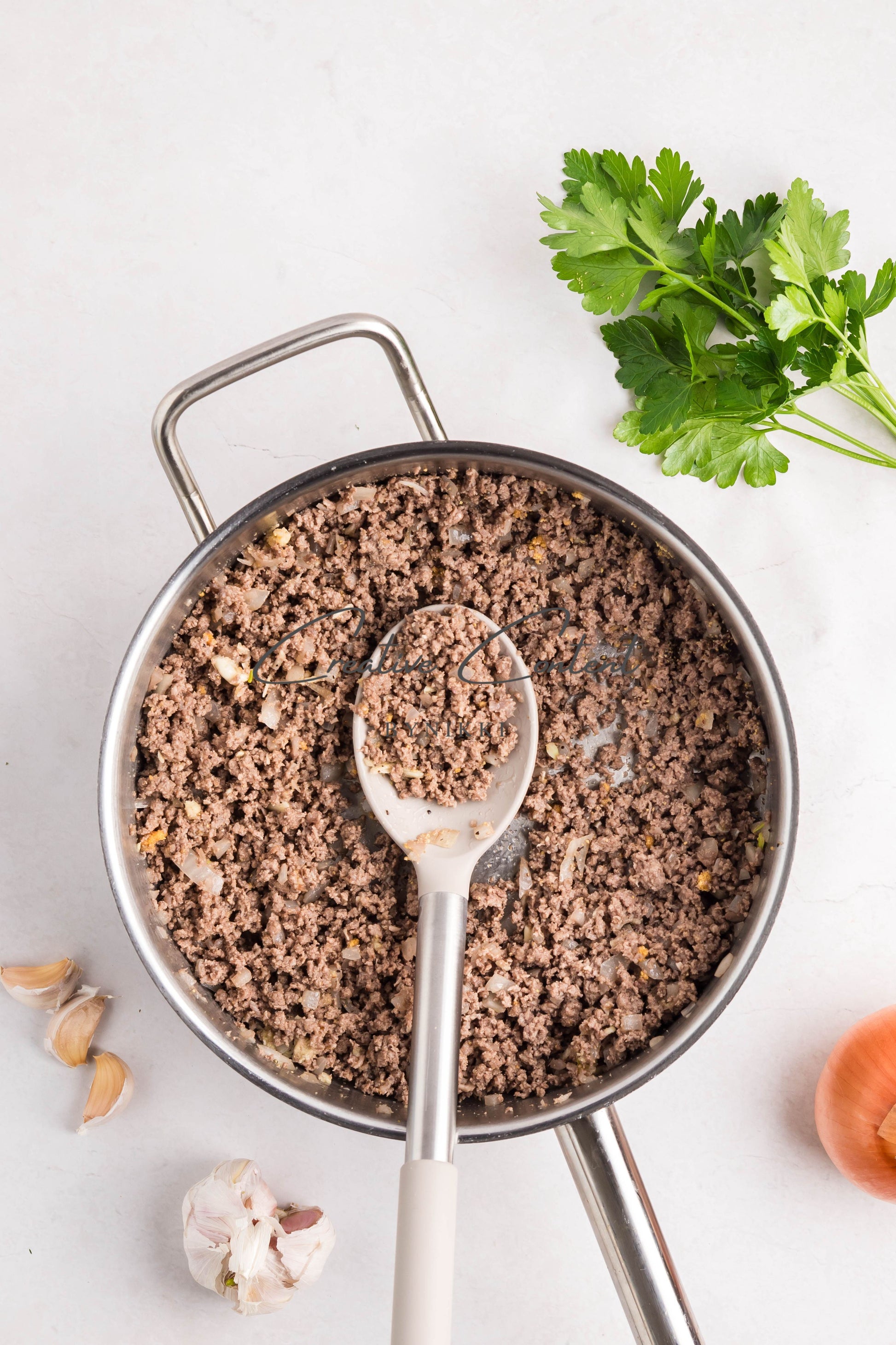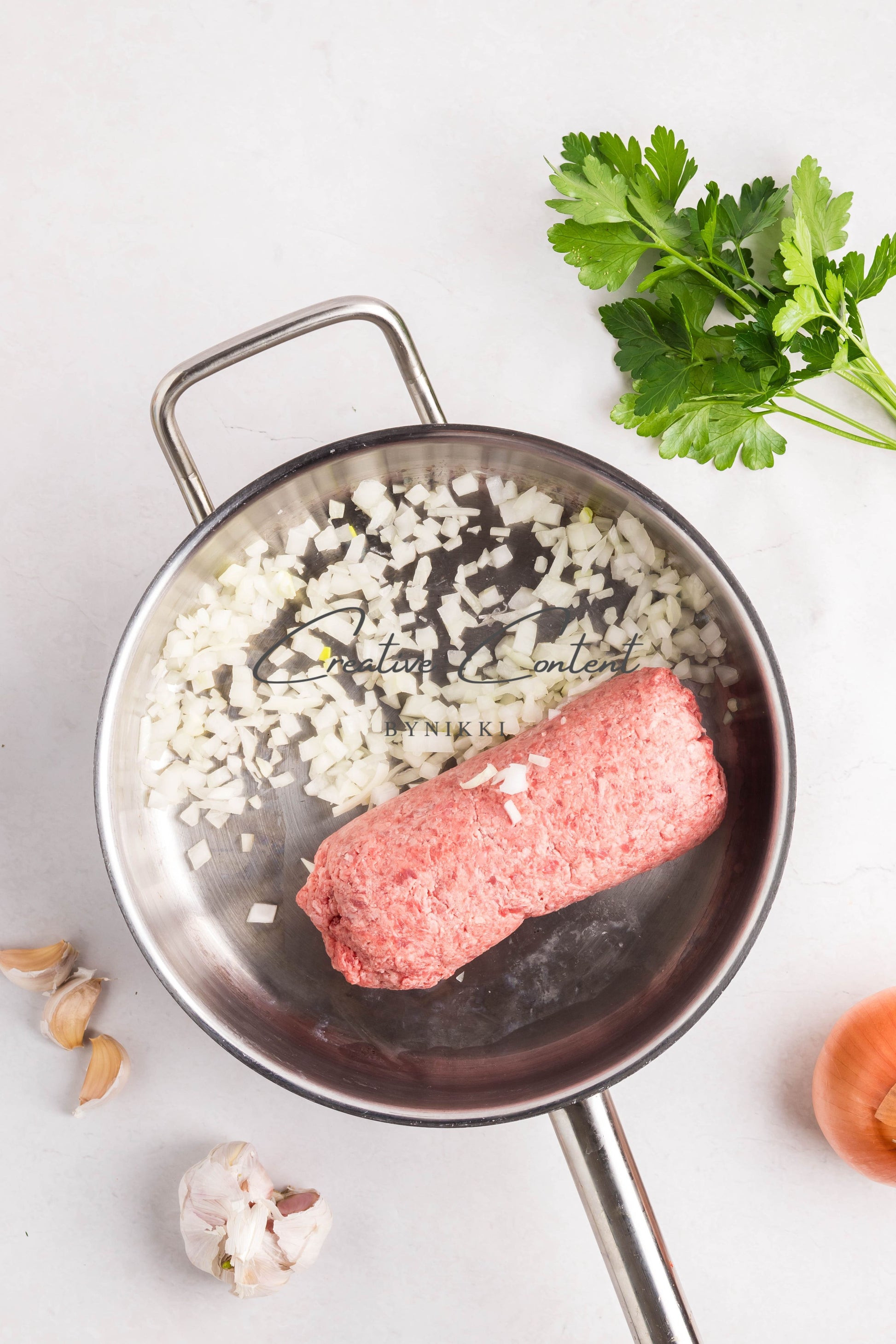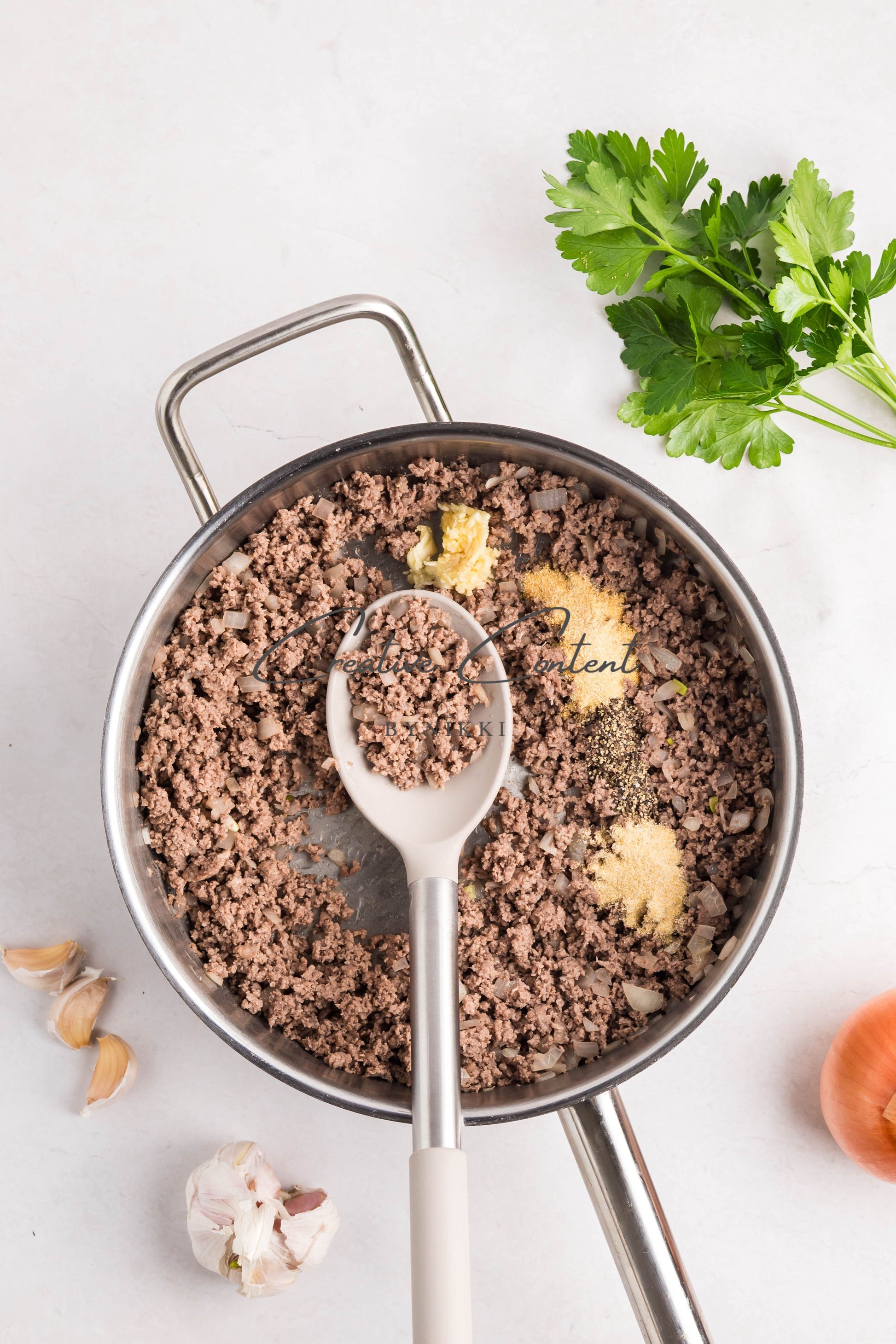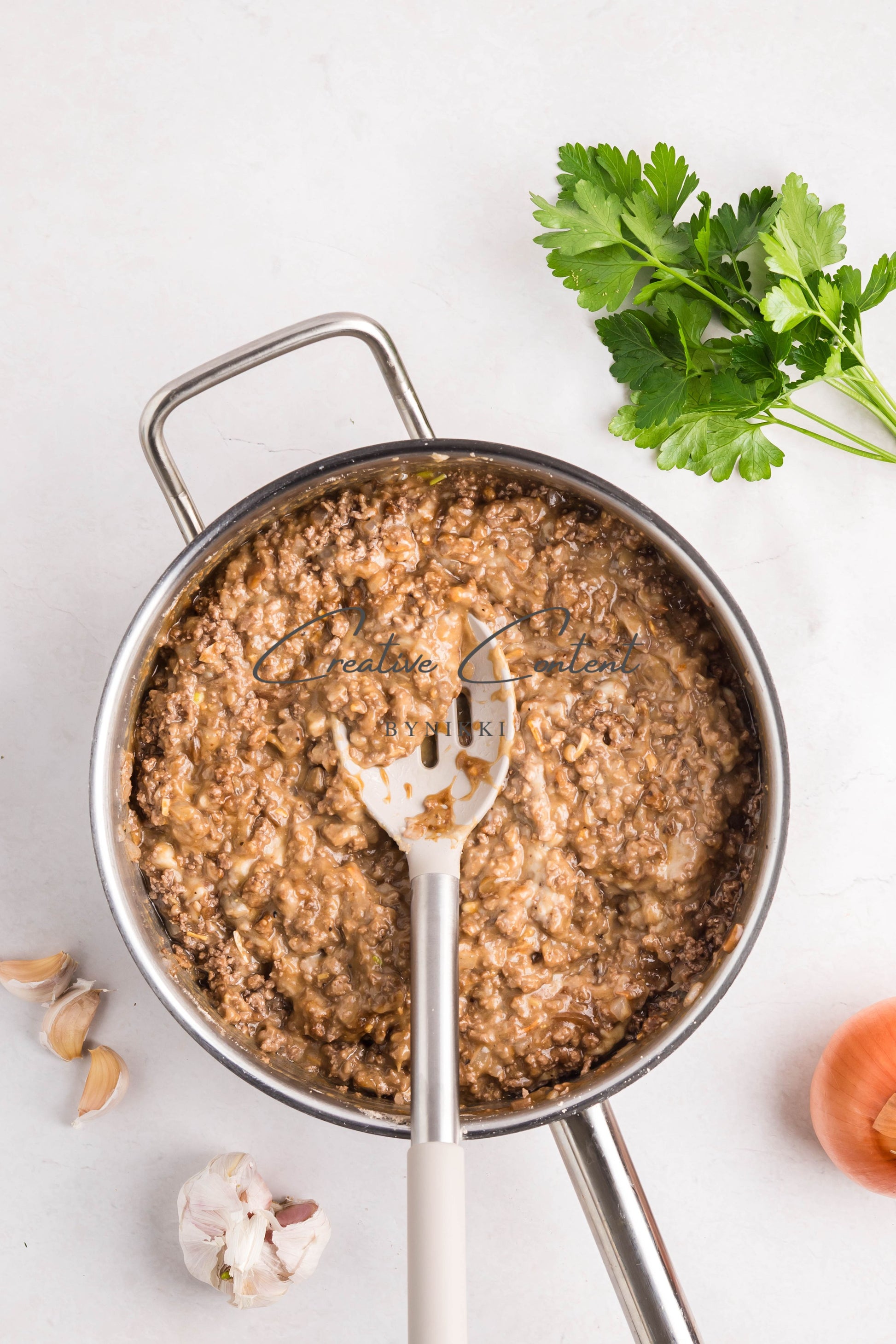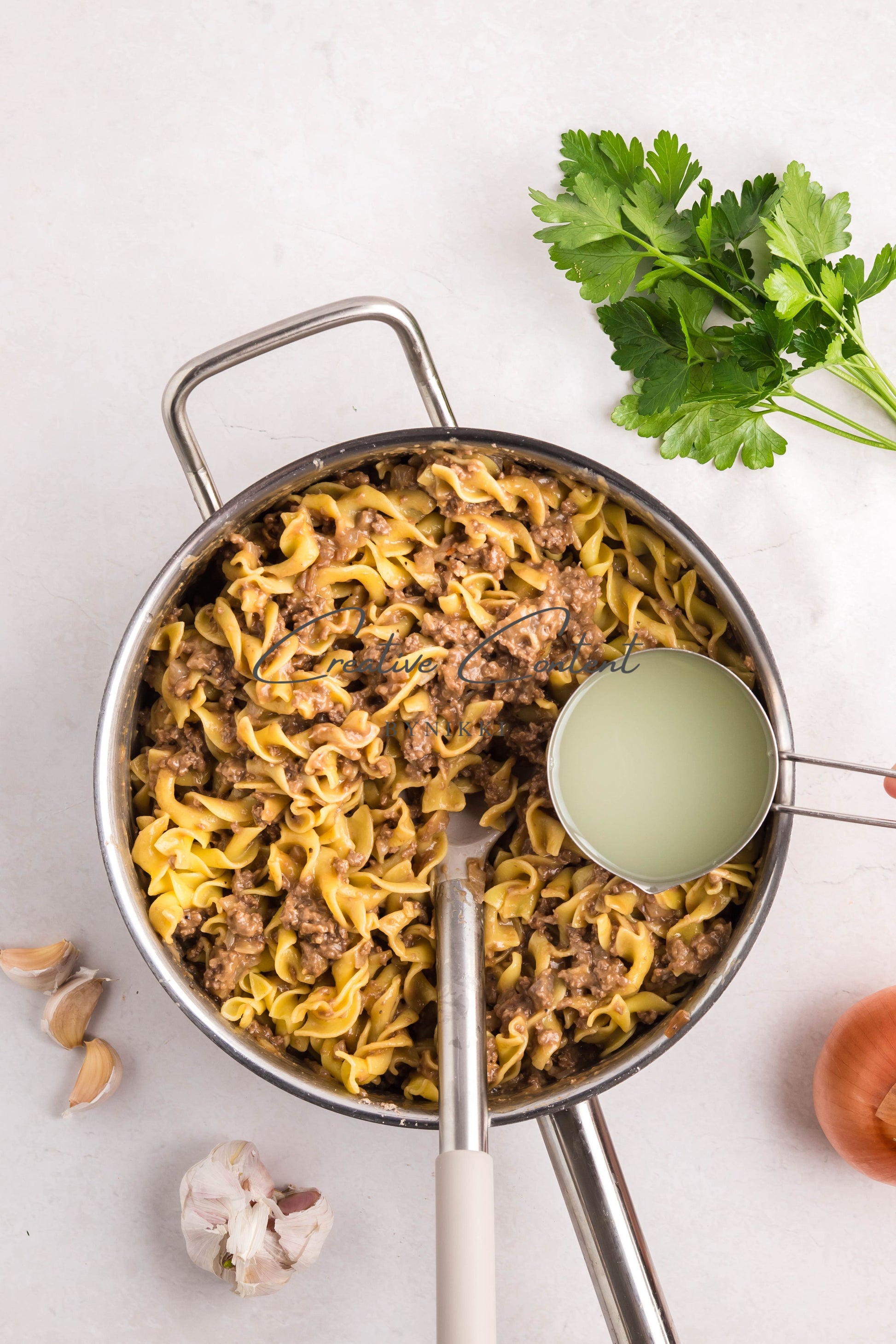 - Ingredients: egg noodles, ground beef, onion, garlic, garlic powder, onion powder, black pepper, mushroom soup, brown gravy, Lipton Onion Mushroom Soup and Dip Mix, fresh parsley