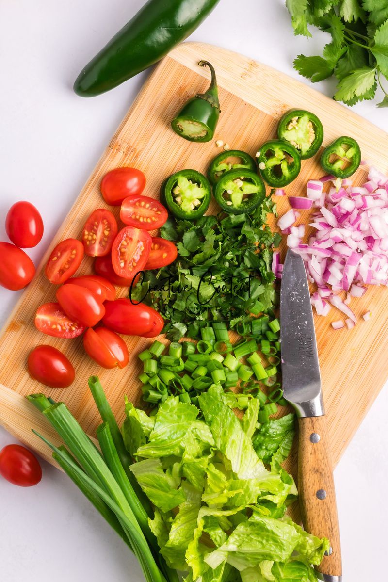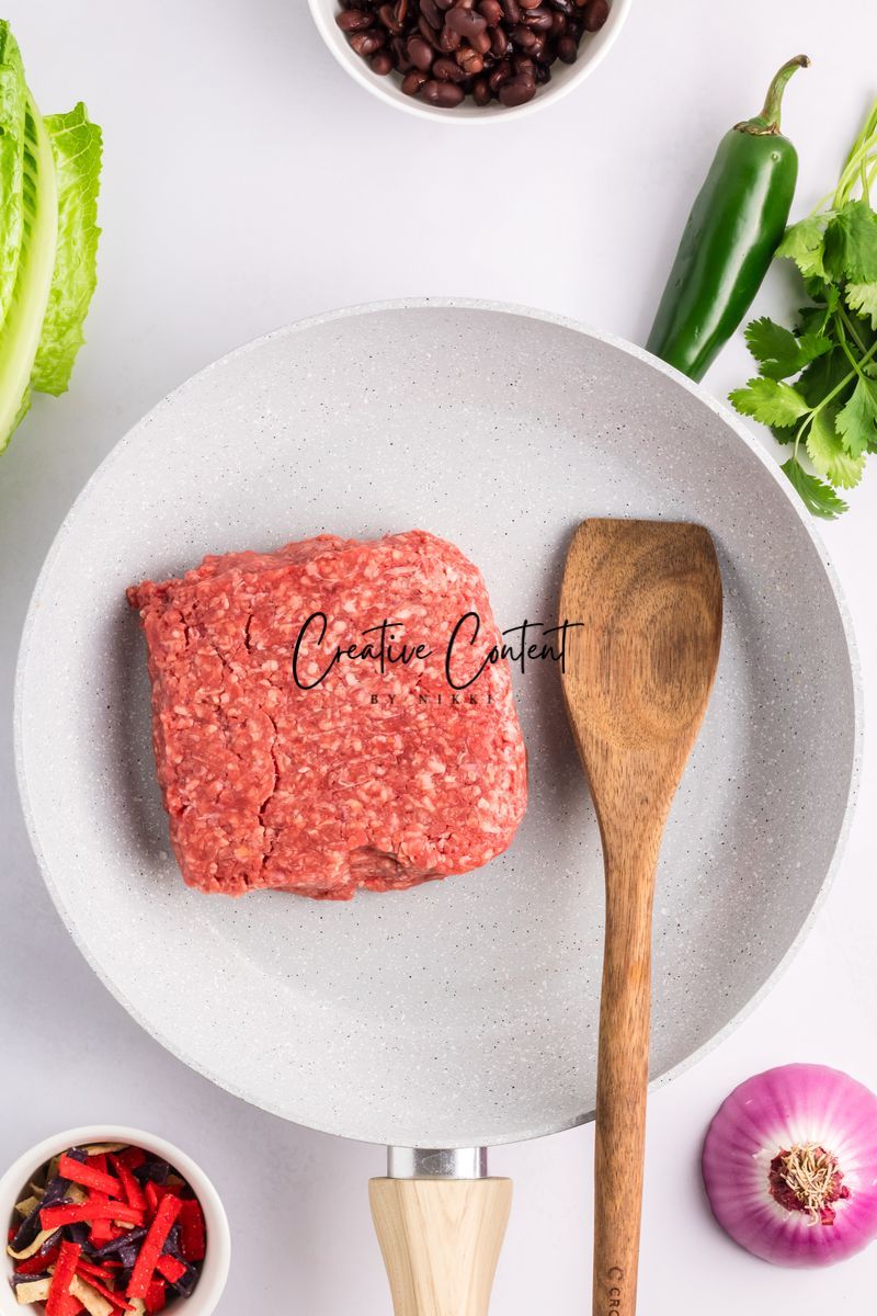 - Ingredients needed; ground beef, taco seasoning, water, romaine lettuce, black beans, corn, cherry tomatoes, Mexican cheese, tortilla strips, jalapenos, cilantro, red onion, black olives, salsa, sour cream, and green onions.