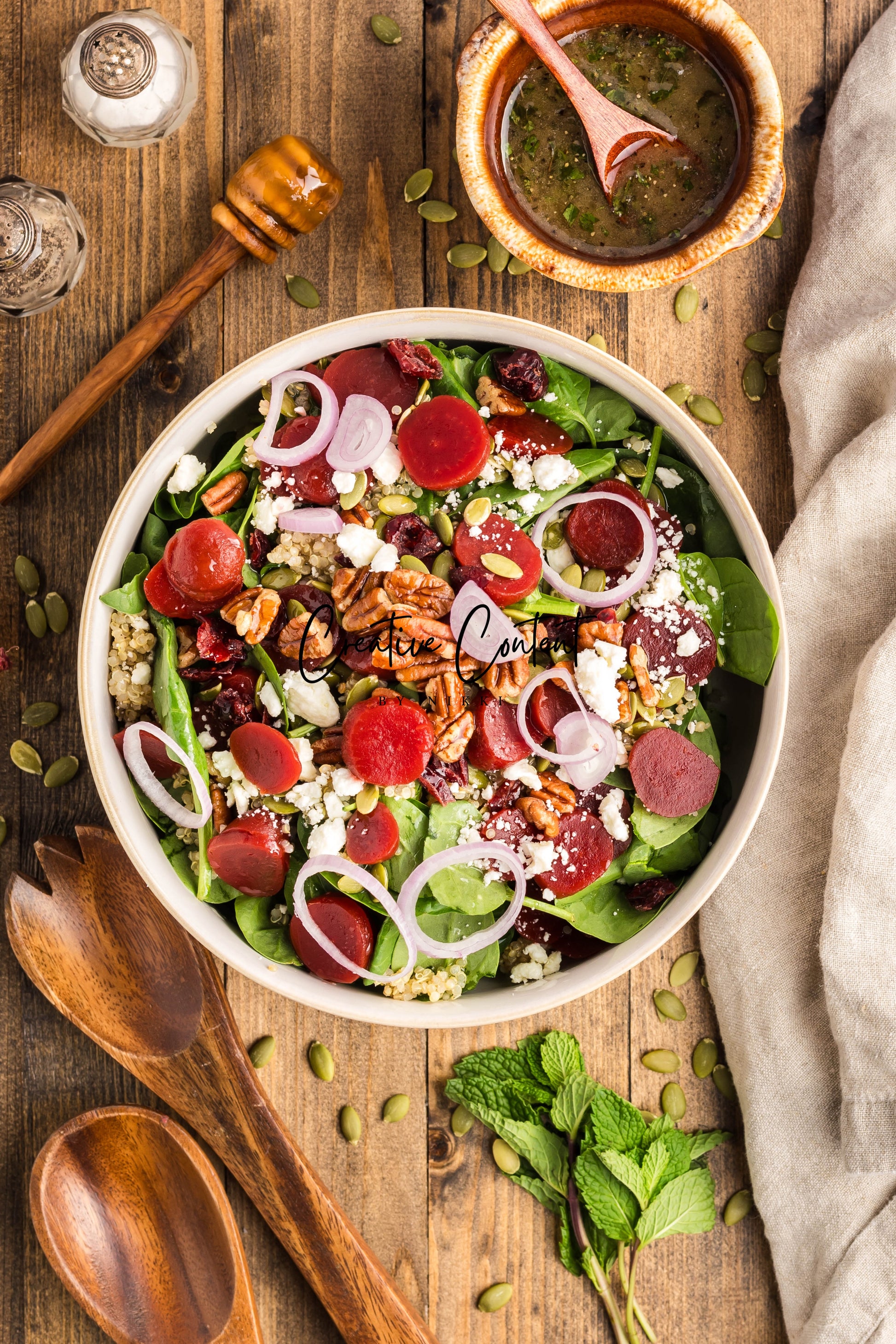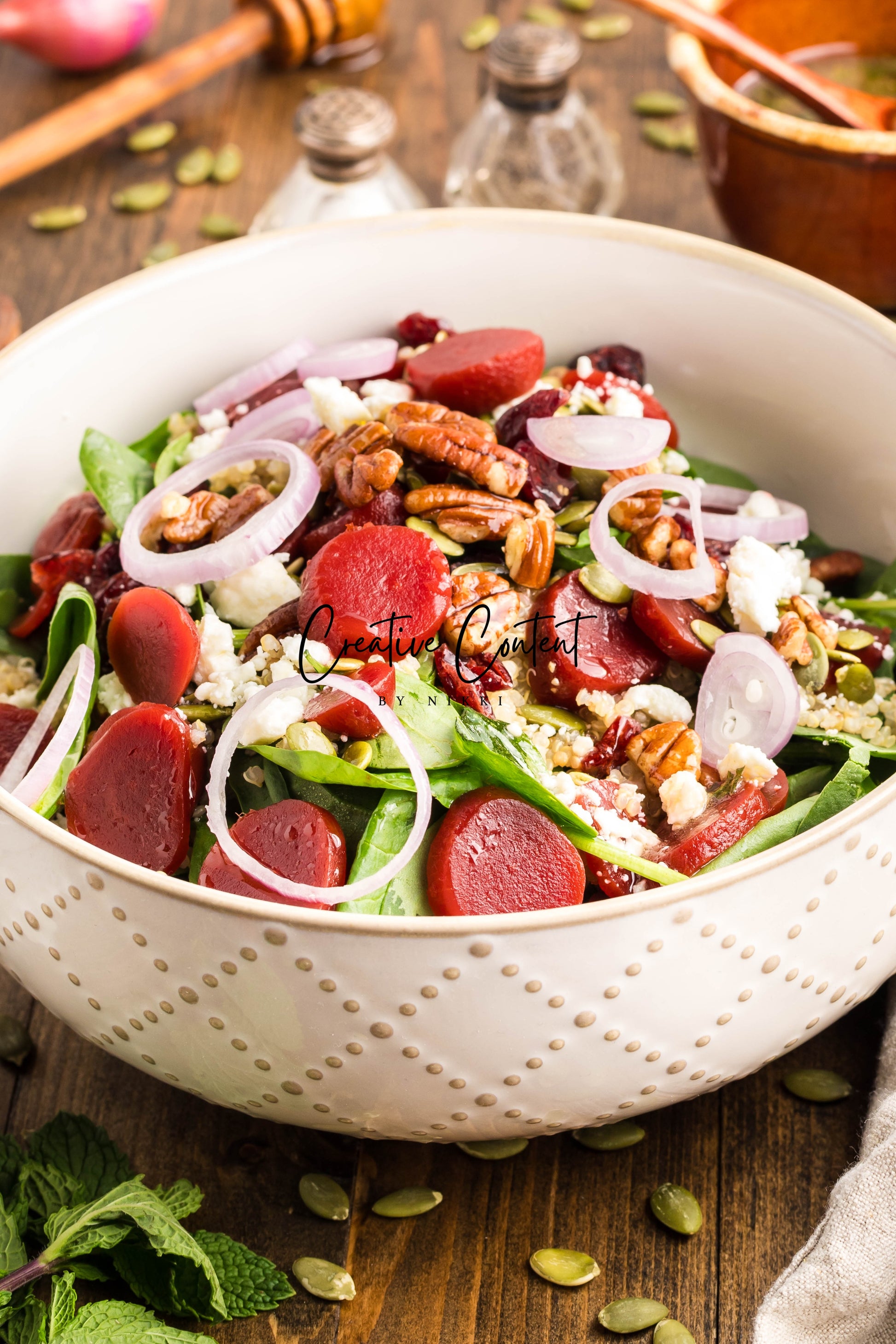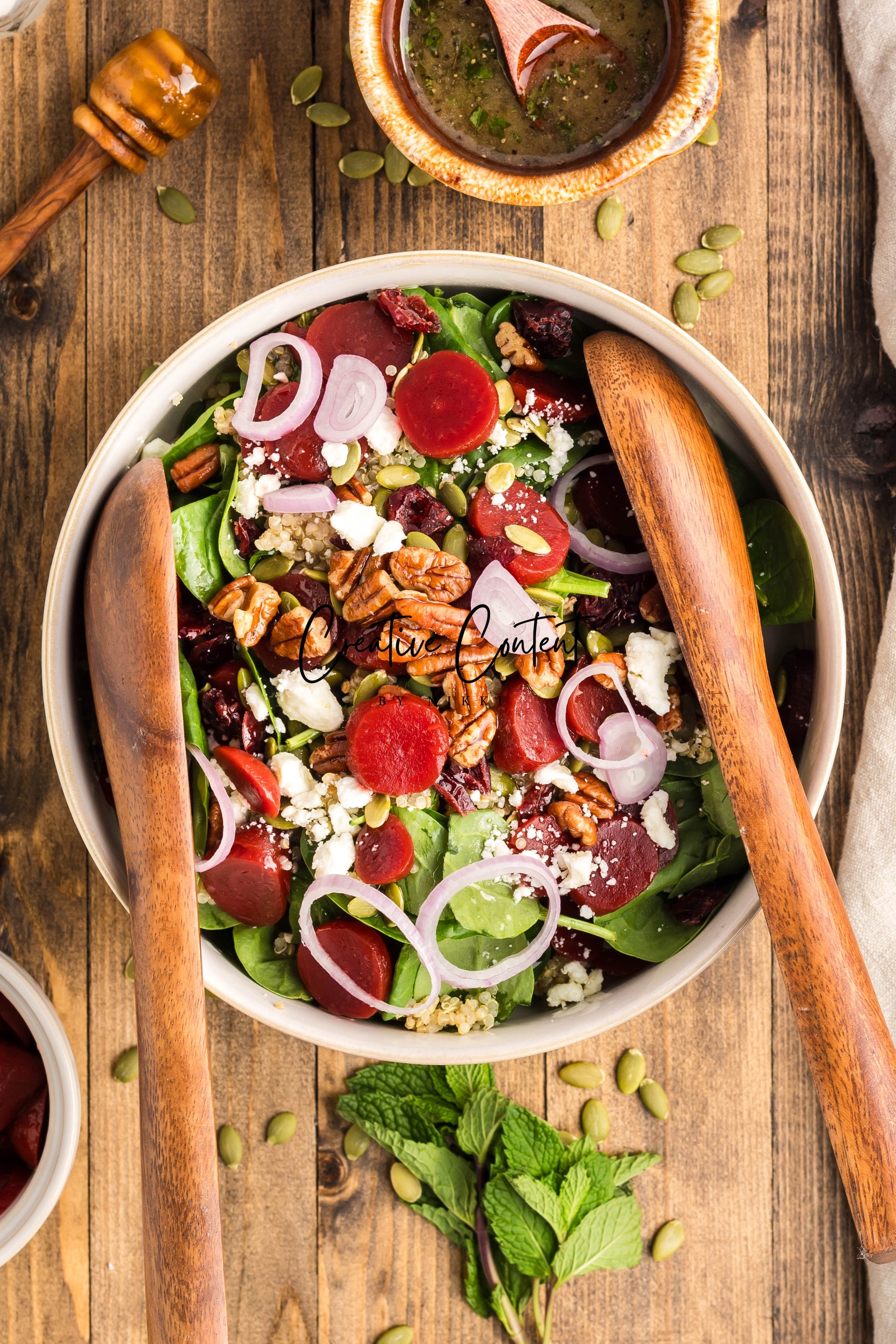 baby spinach, cooked quinoa, green pumpkin seeds, feta crumbles, sliced beets, chopped shallot, avocado oil, red wine vinegar, chopped mint, honey, Dijon mustard, coarse kosher salt, black pepper