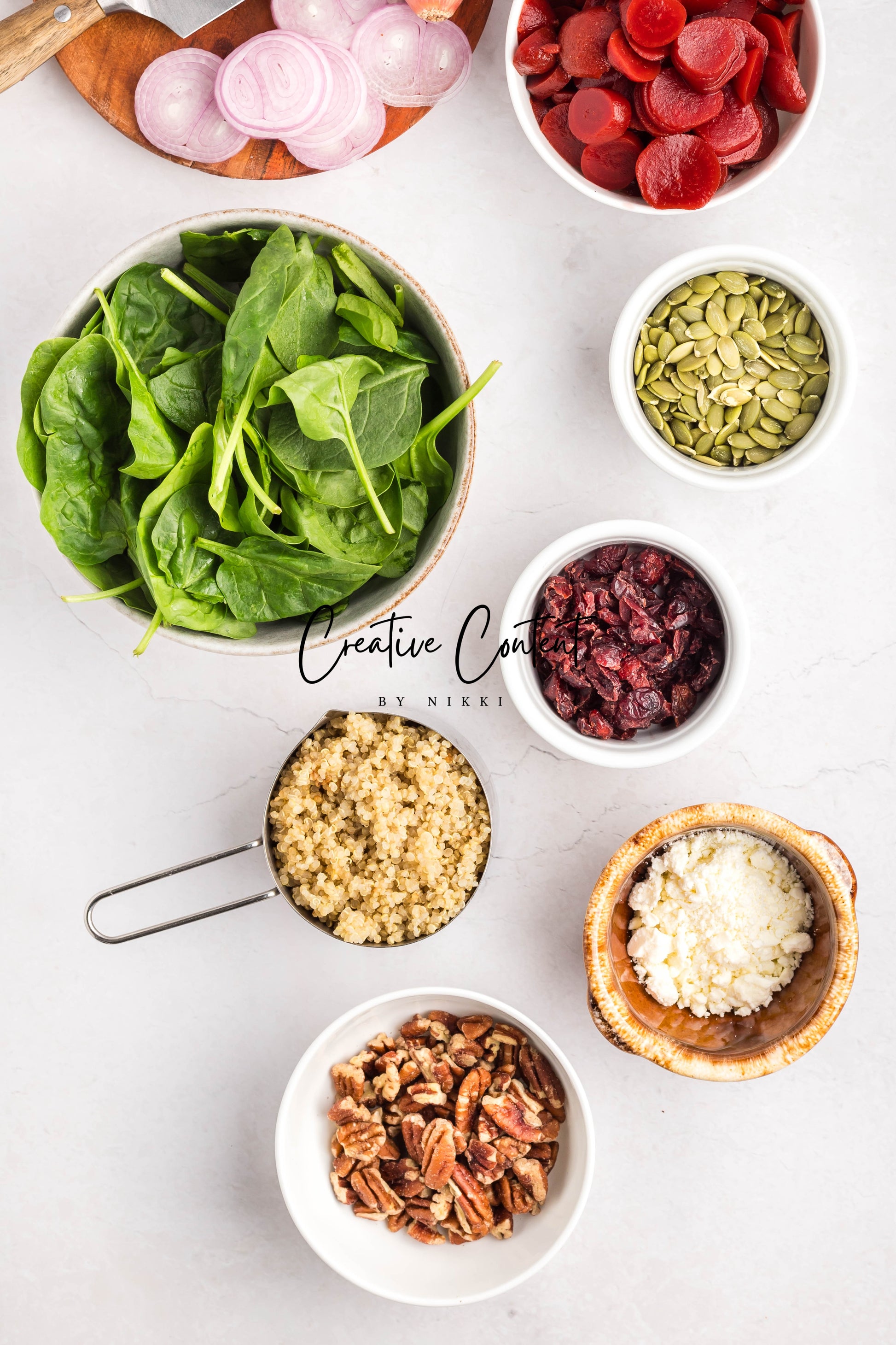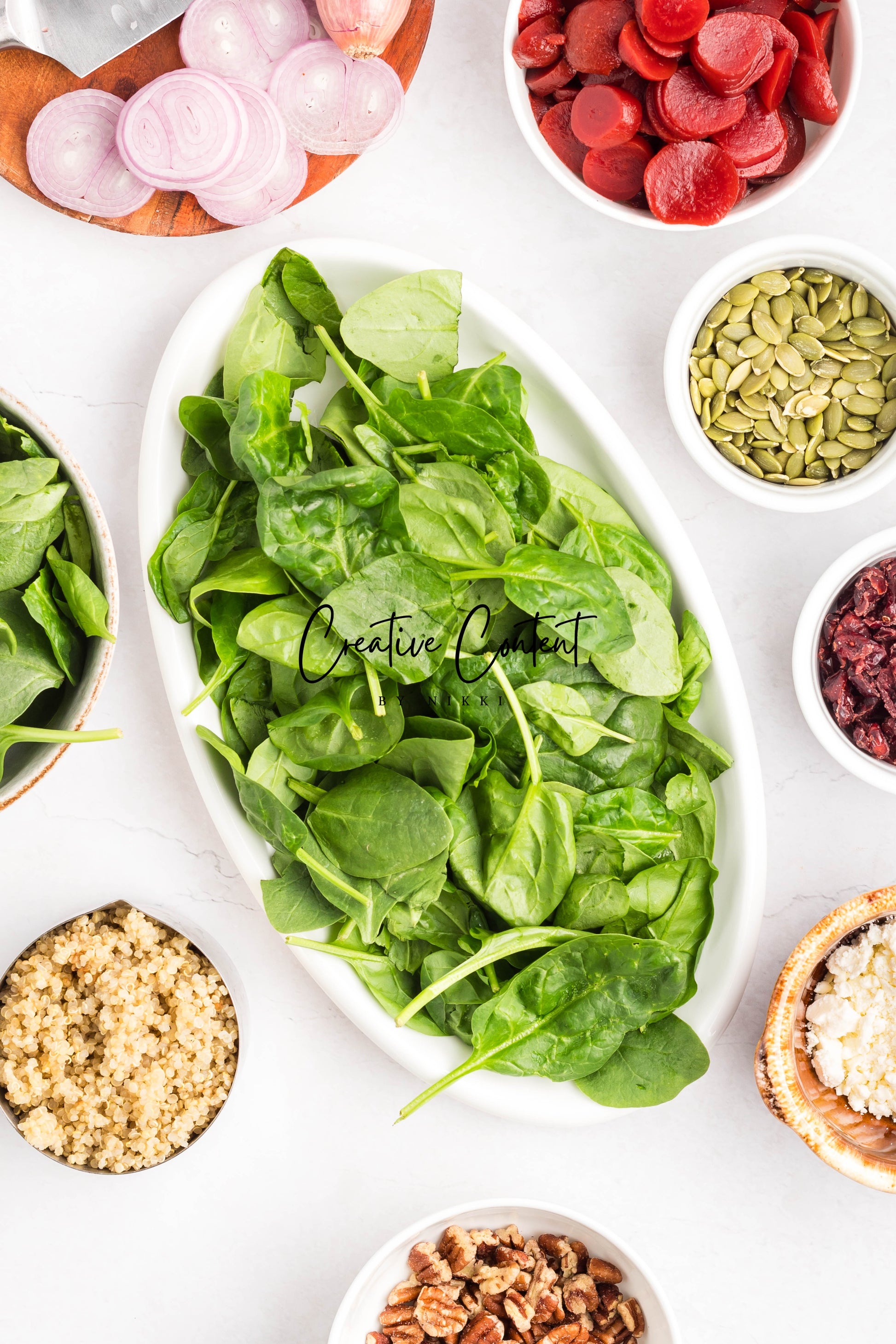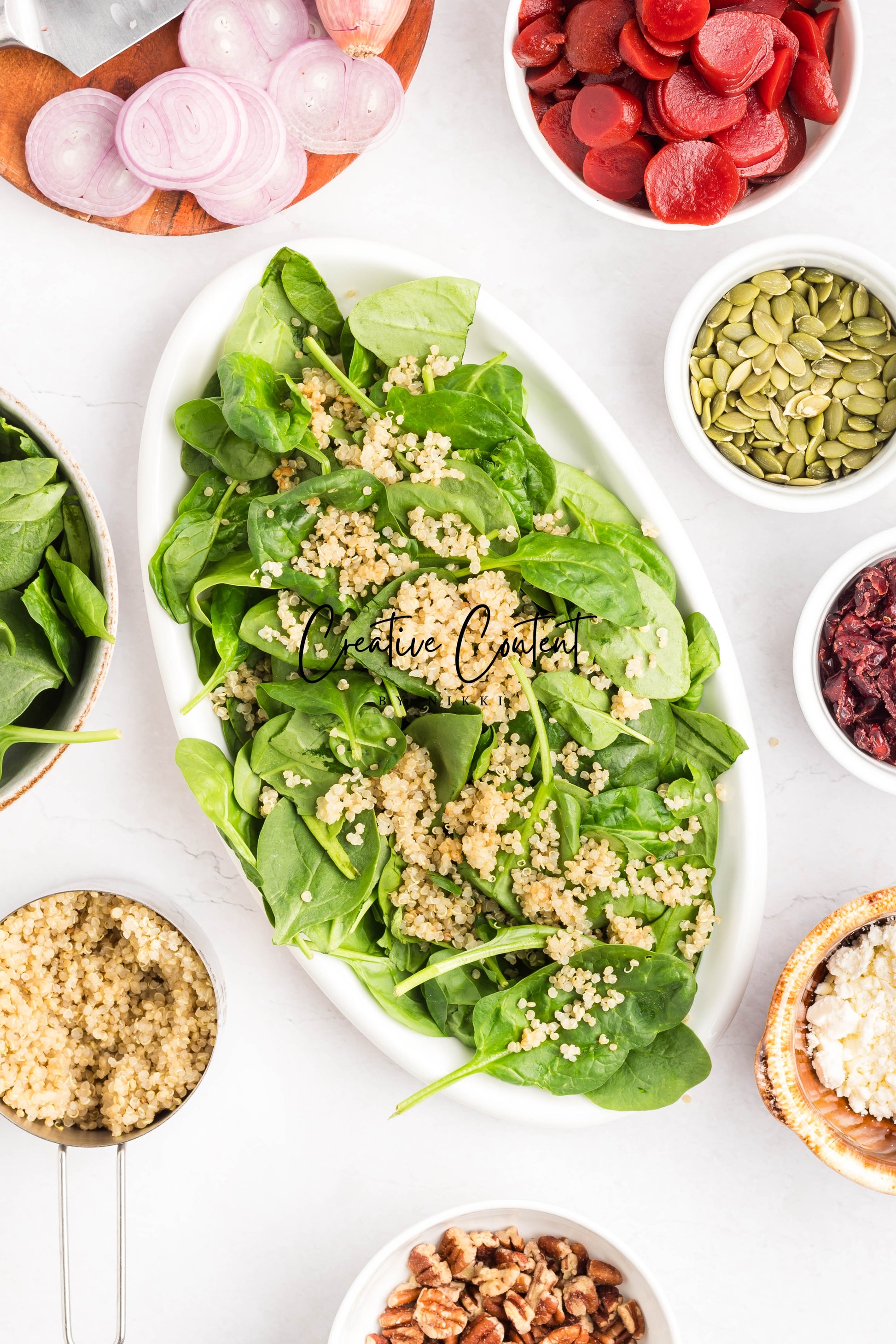 baby spinach, cooked quinoa, green pumpkin seeds, feta crumbles, sliced beets, chopped shallot, avocado oil, red wine vinegar, chopped mint, honey, Dijon mustard, coarse kosher salt, black pepper