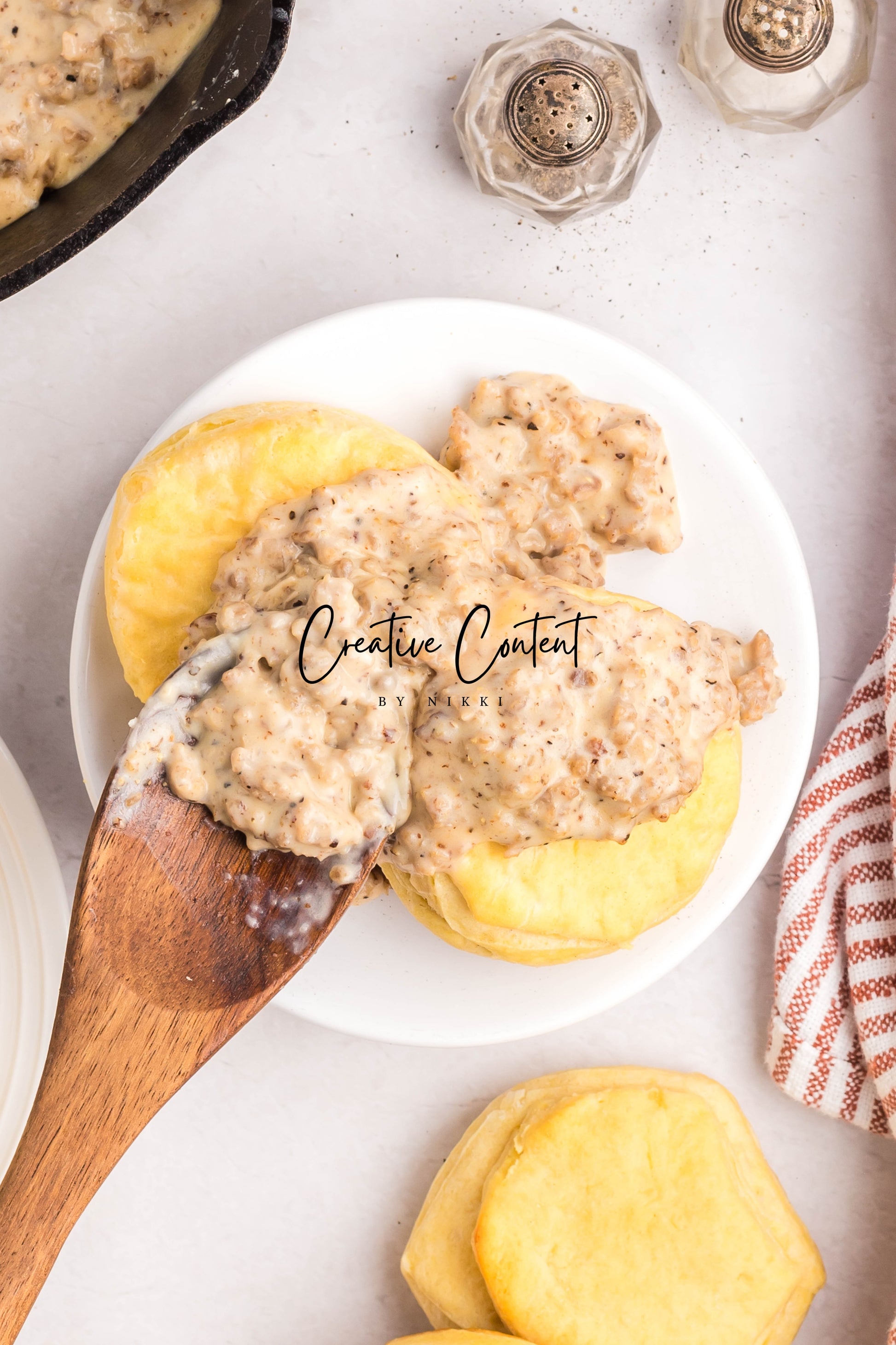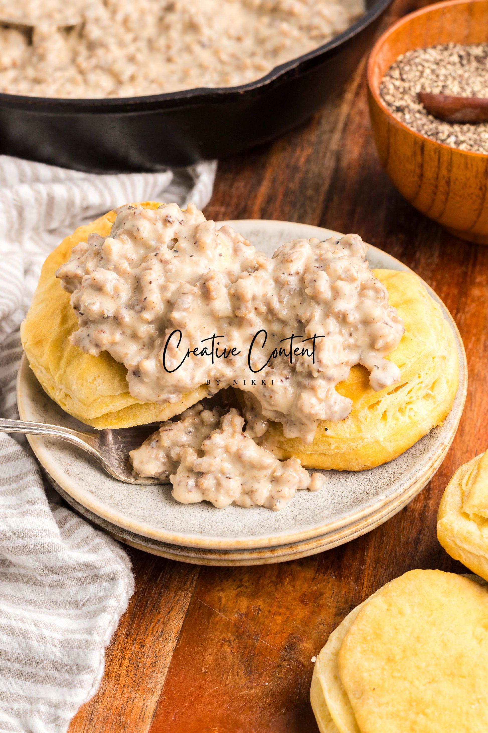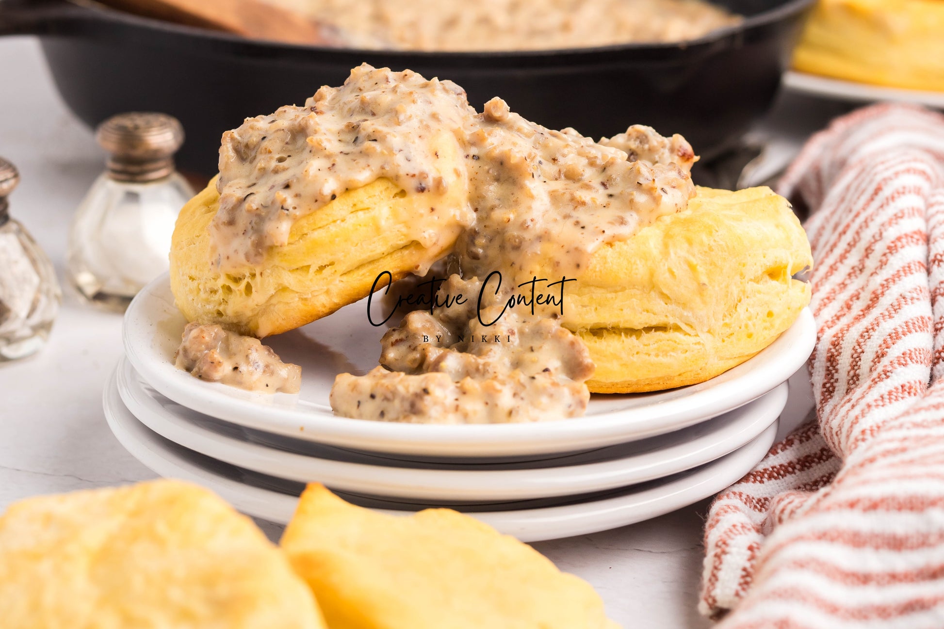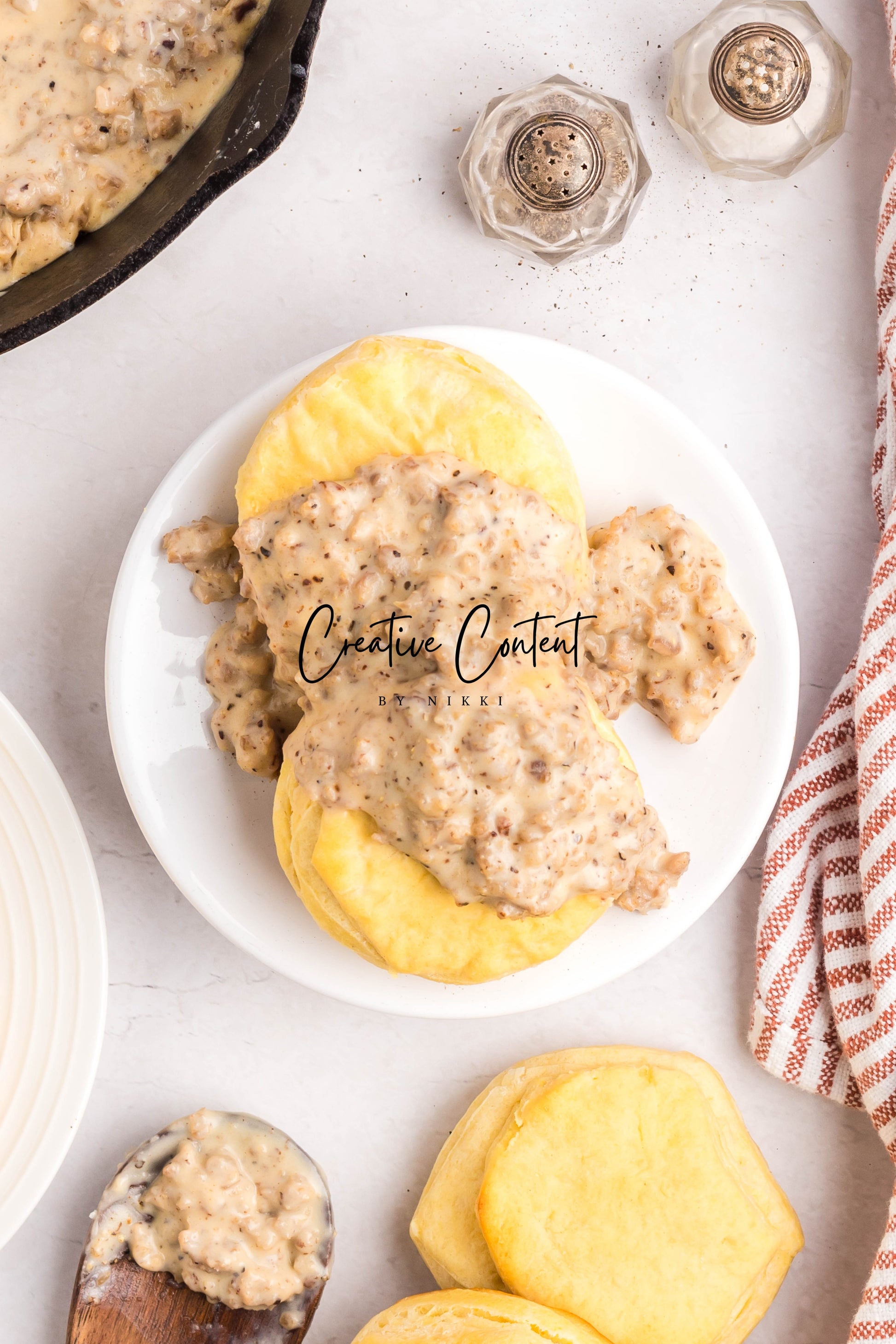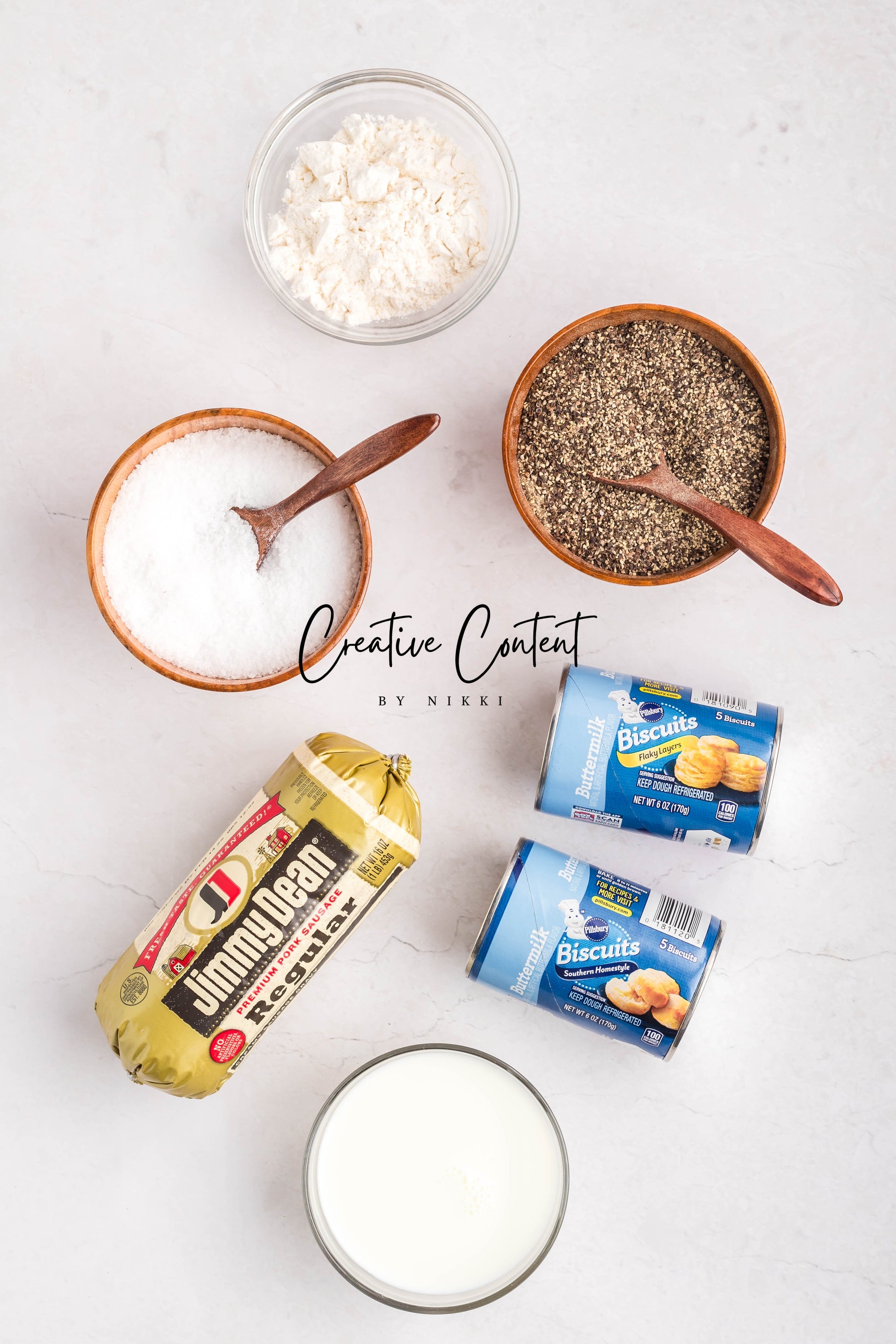 - Ingredients: biscuits, sausage, all-purpose flour, whole milk, black pepper, coarse salt