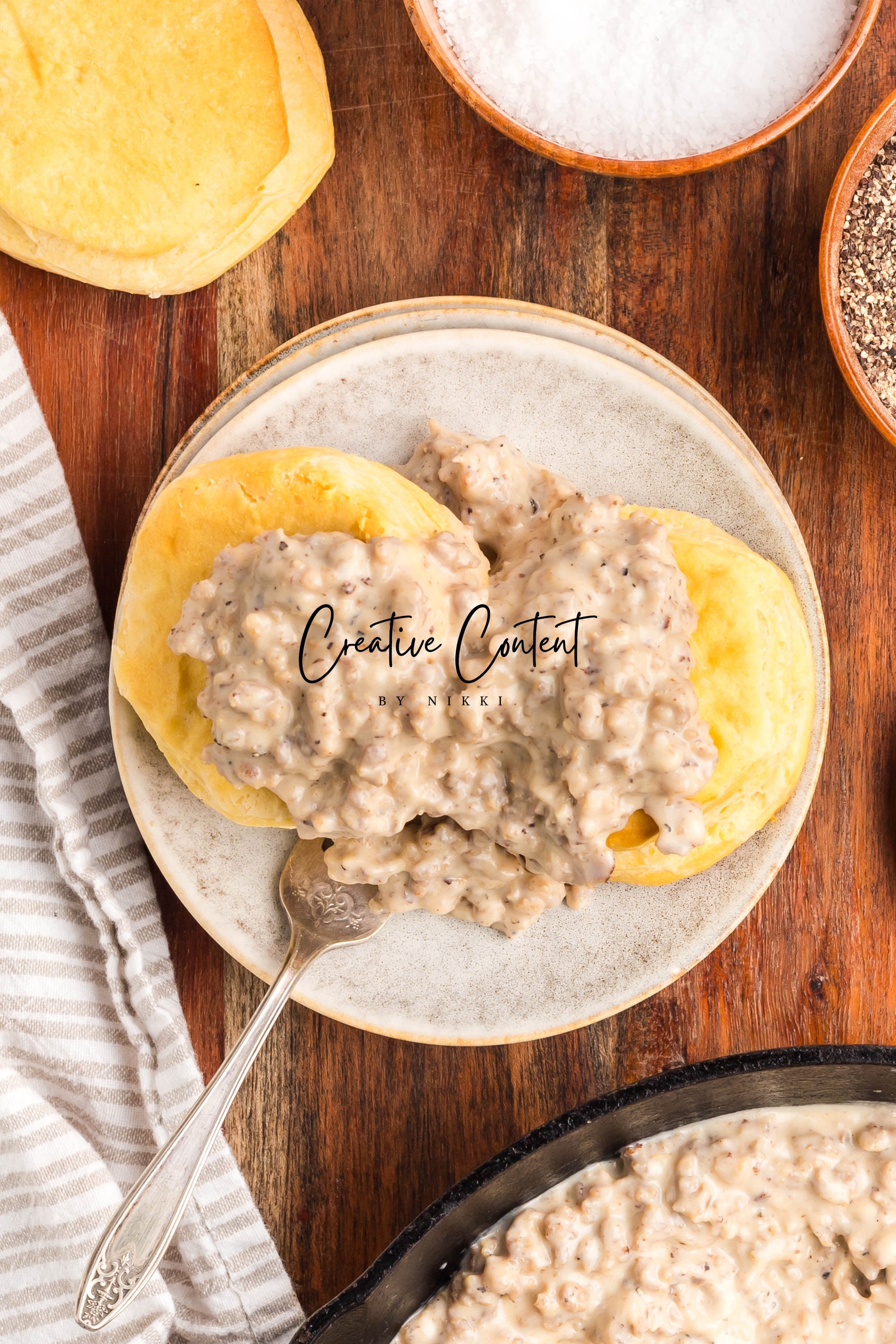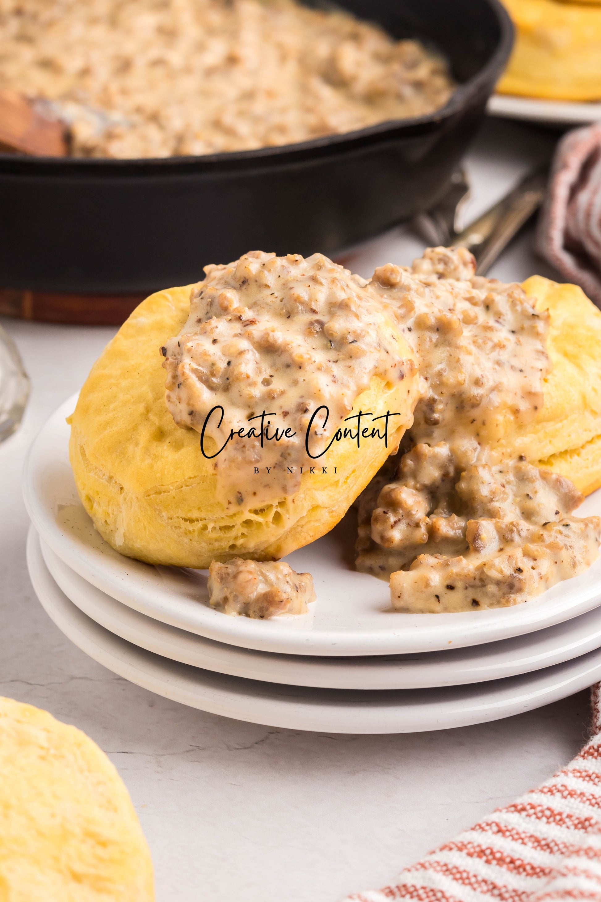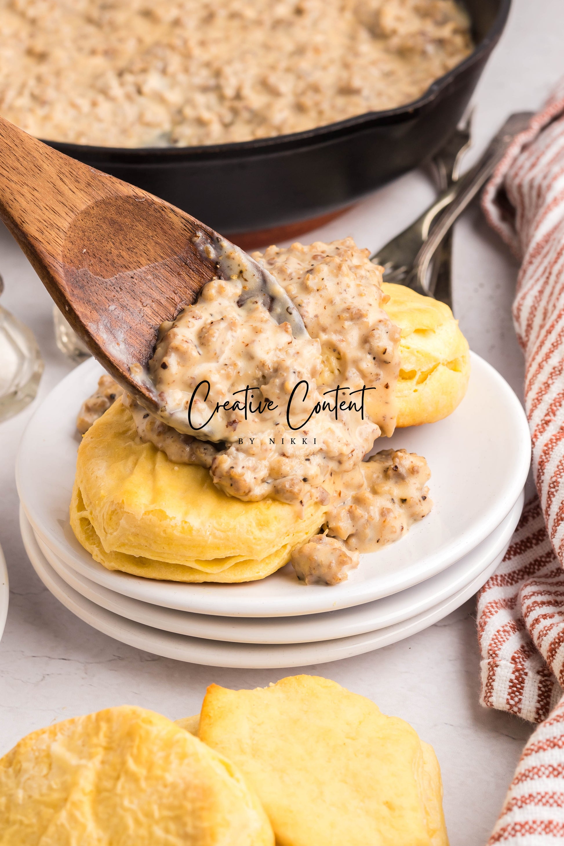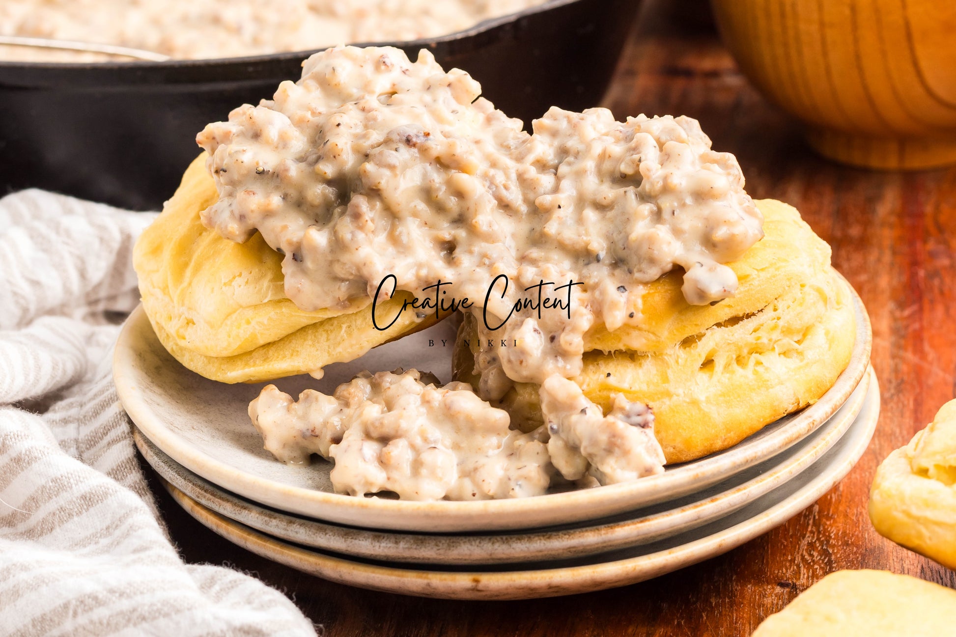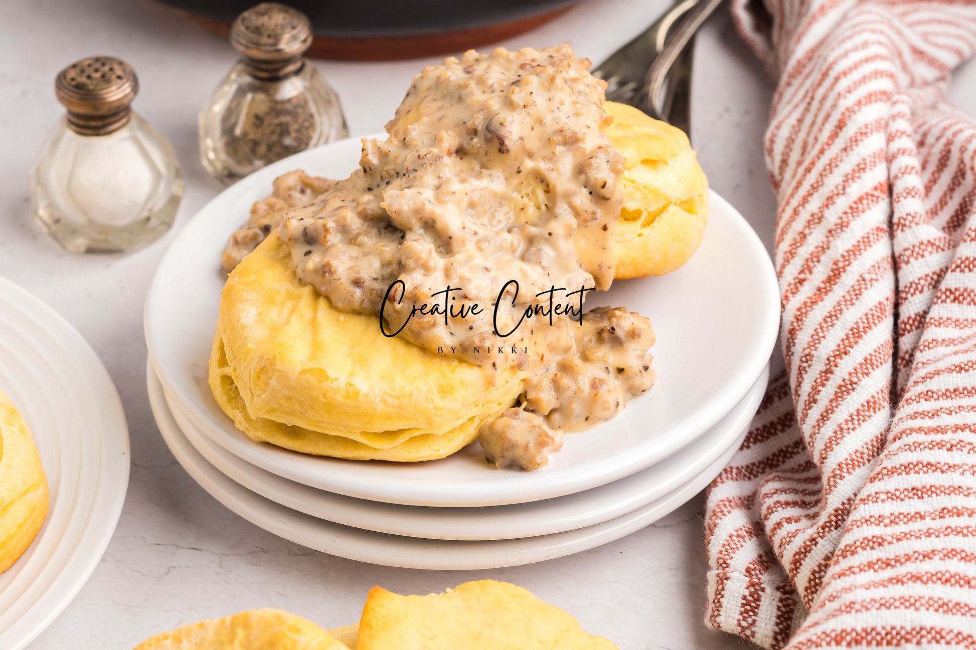 - Ingredients: biscuits, sausage, all-purpose flour, whole milk, black pepper, coarse salt