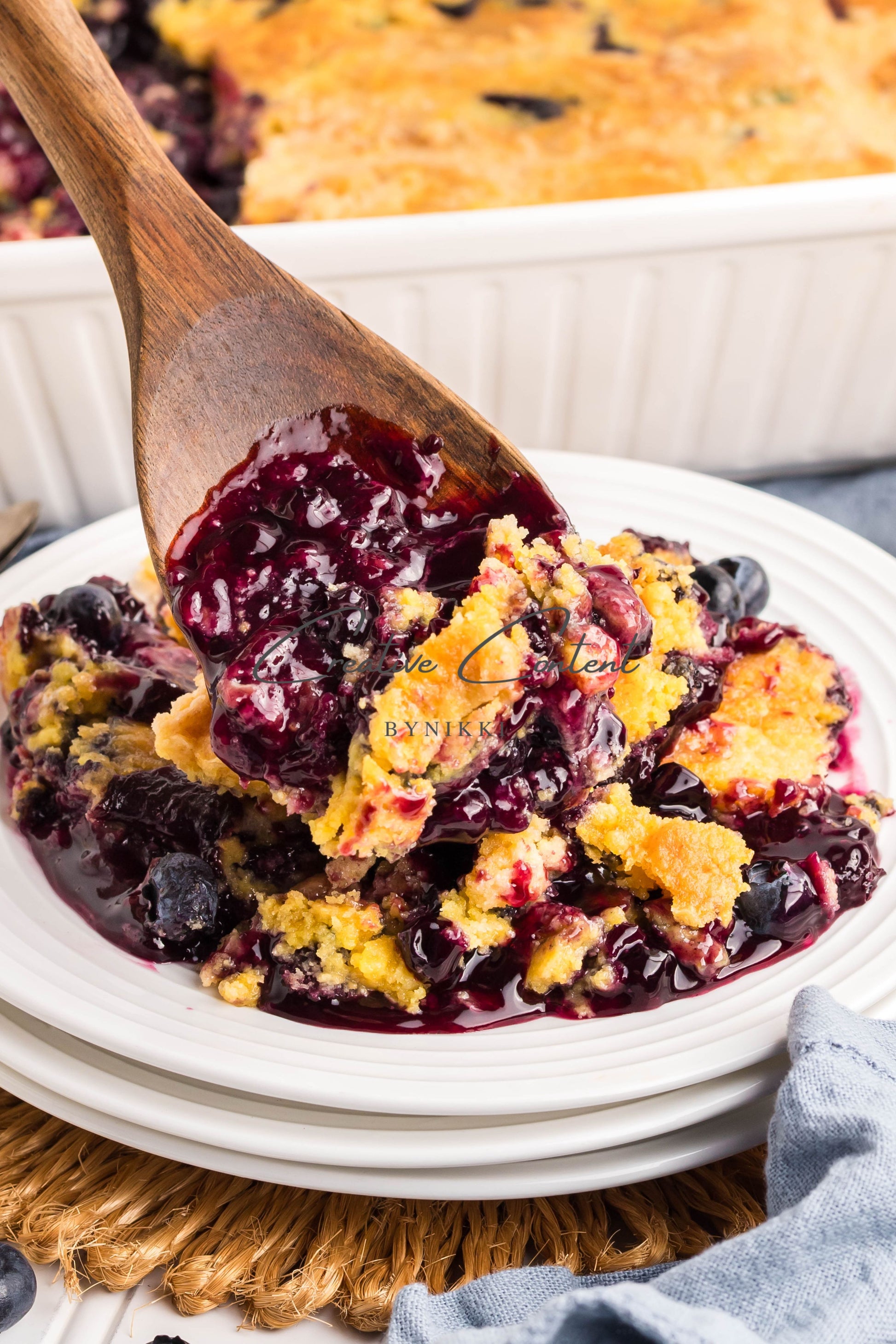 - Ingredients: blueberry pie filling, fresh blueberries, lemon juice, yellow cake mix, butter
