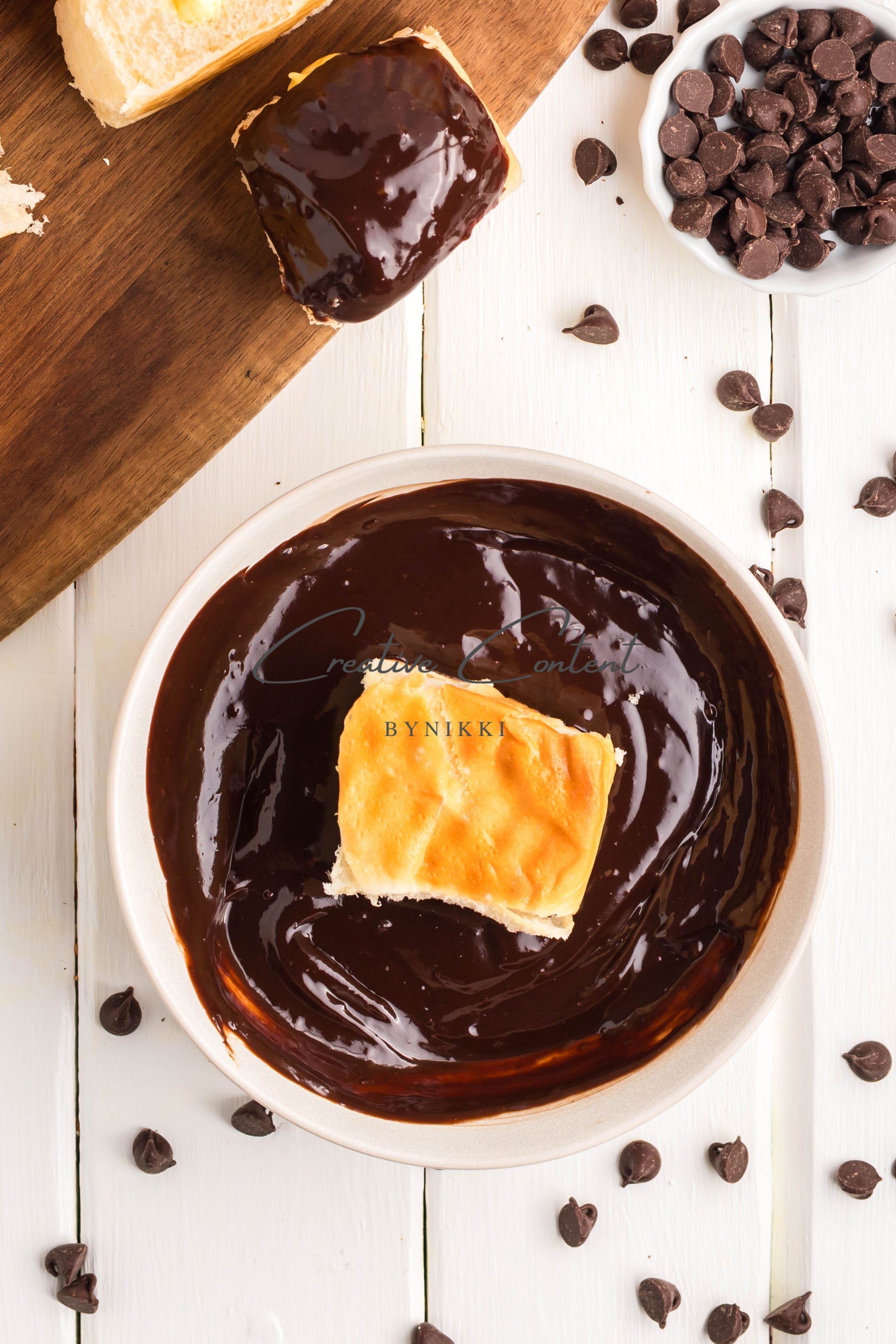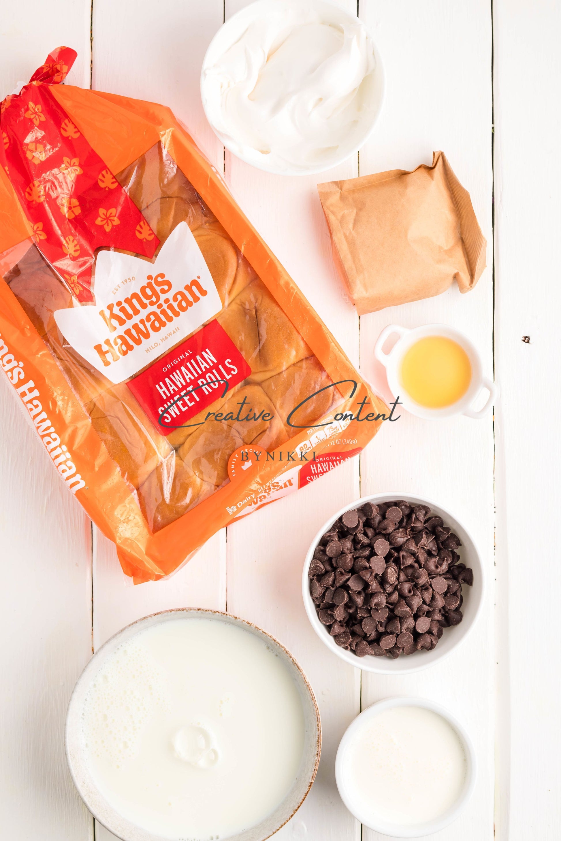 - Ingredients: Hawaiian rolls, butter, vanilla pudding, milk, vanilla extract, heavy whipping cream, bittersweet chocolate.