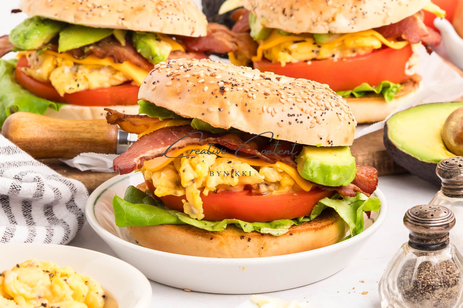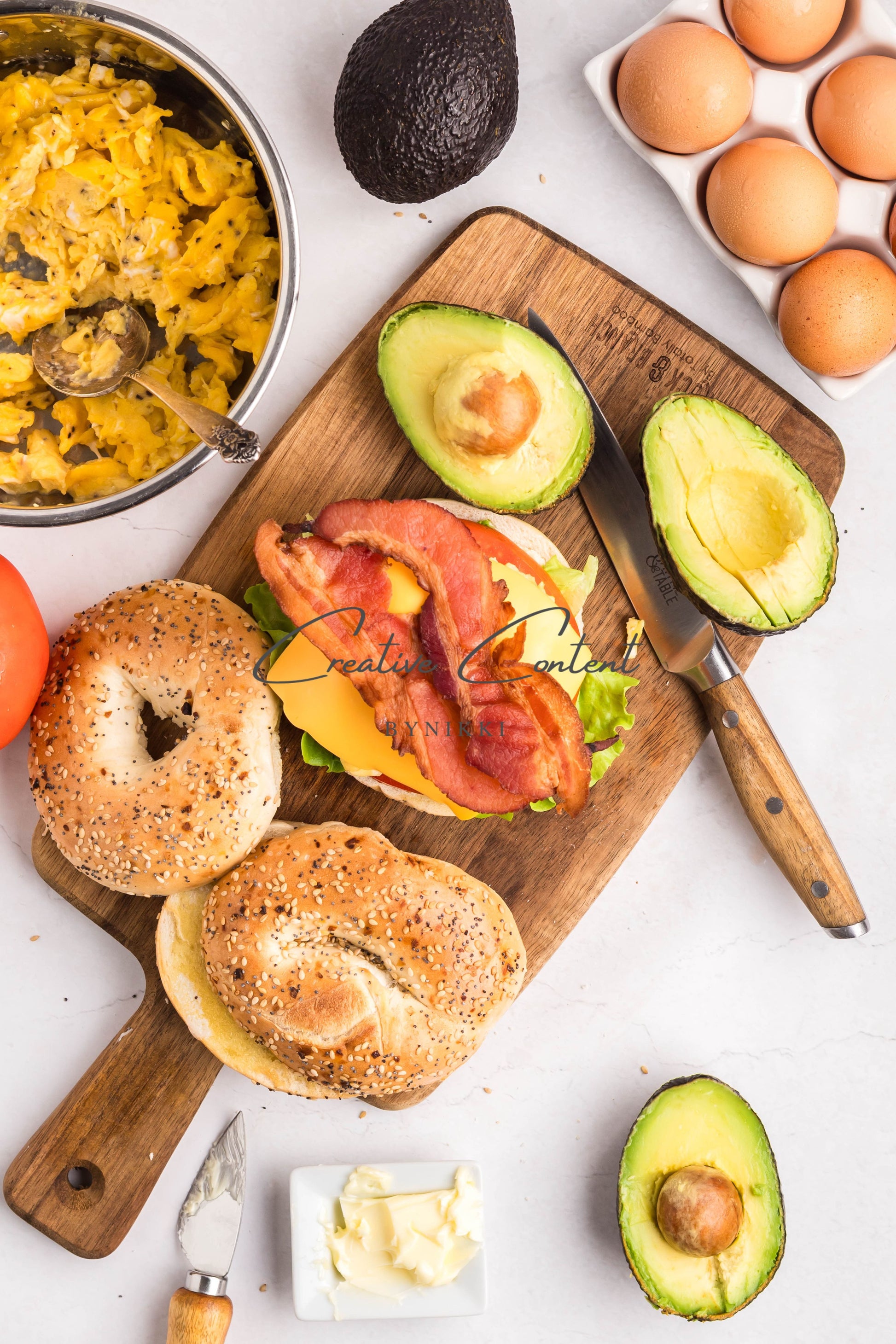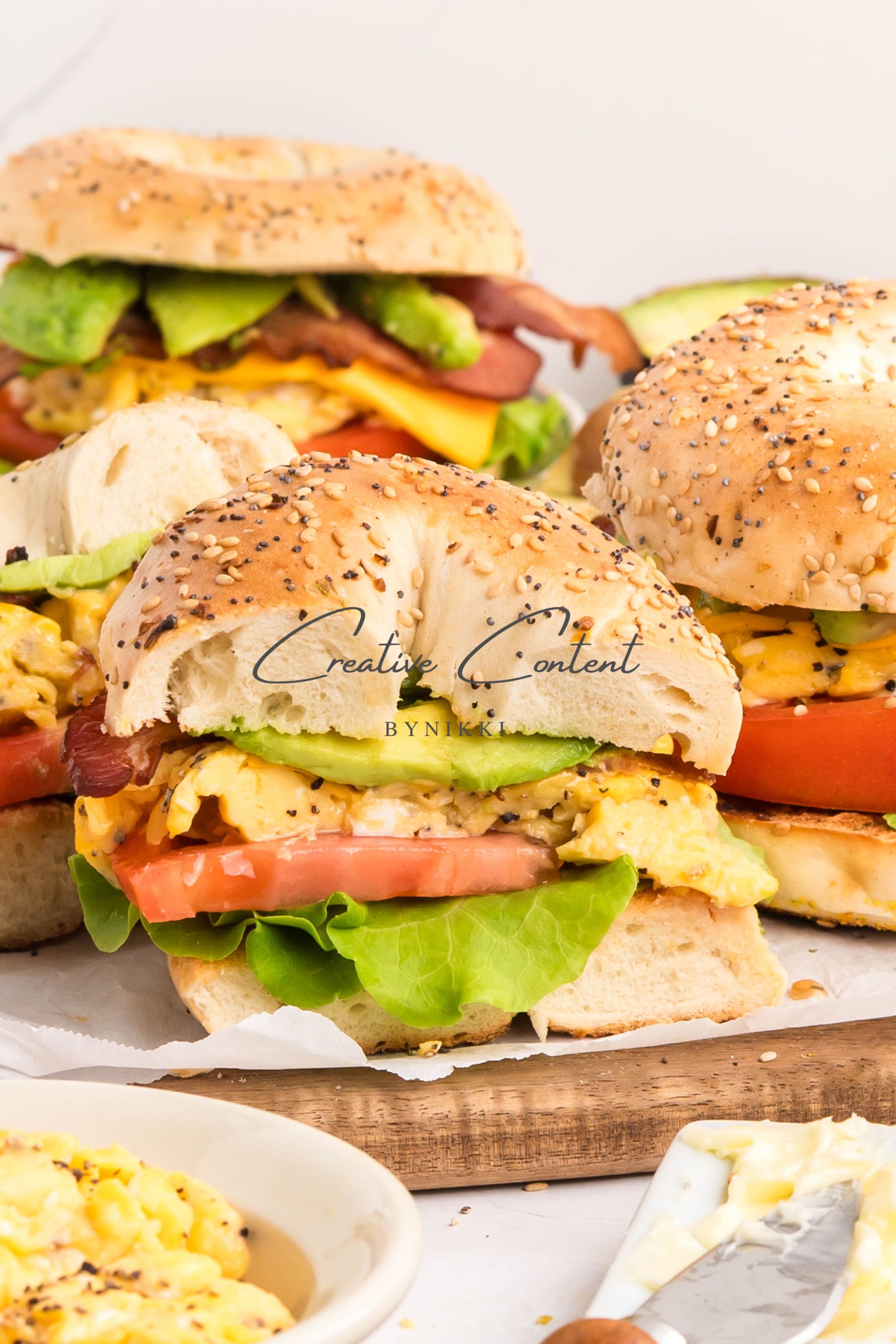 - Ingredients: bagel, unsalted butter, cooked bacon, egg, American cheese, avocado, leafy lettuce, sliced tomatoes