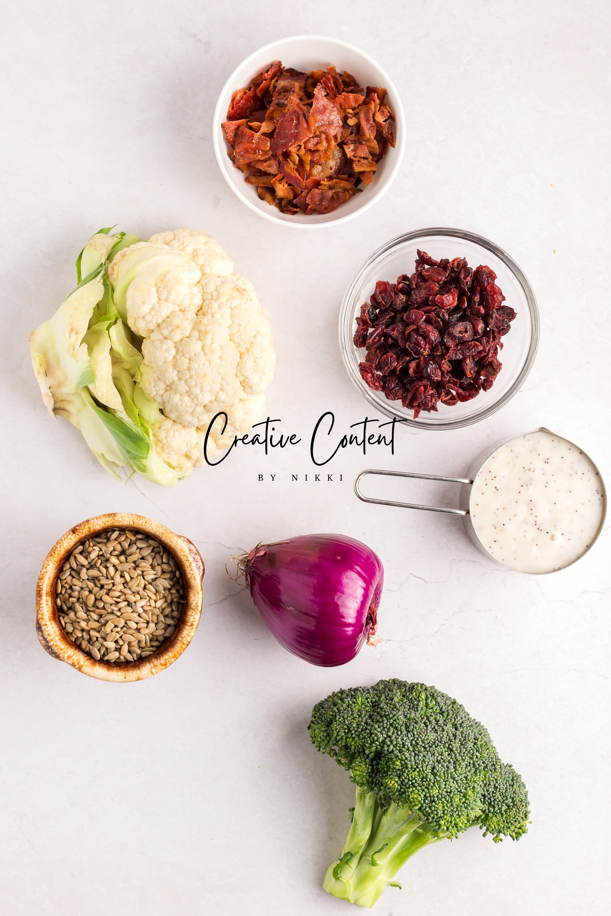 - Featured Ingredients; cauliflower, broccoli, bacon, dried cranberries, poppyseed dressing, sunflower seeds, and red onions.