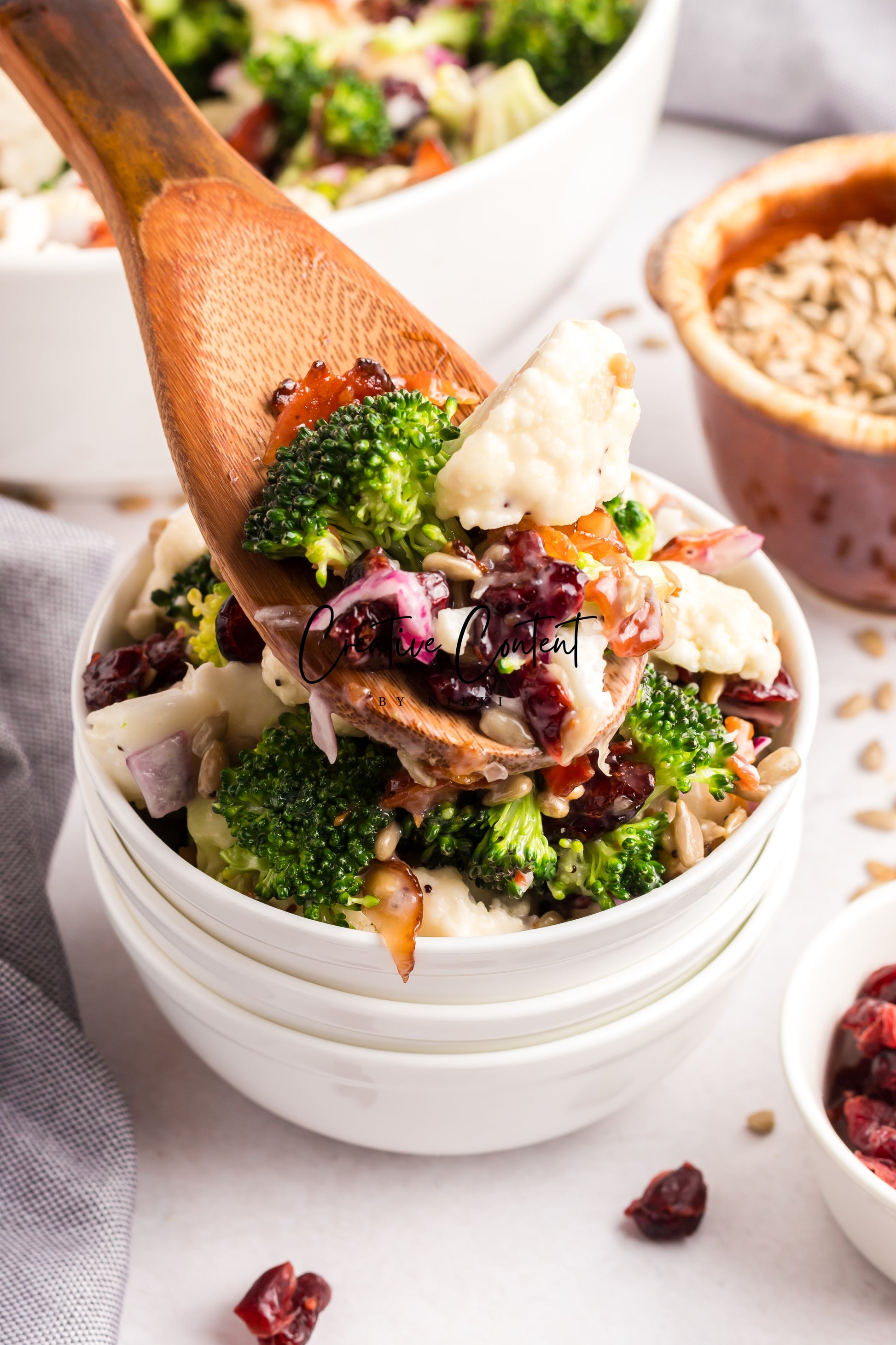 This broccoli and cauliflower salad is sweet, crunchy, and chewy. The crunchy veggies, sweet cranberries, salty bacon, and poppyseed dressing make a salad that everyone will be coming back for seconds. In just 10 minutes you will have the best salad for your next gathering.