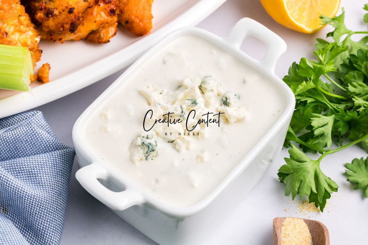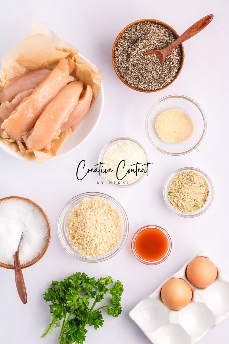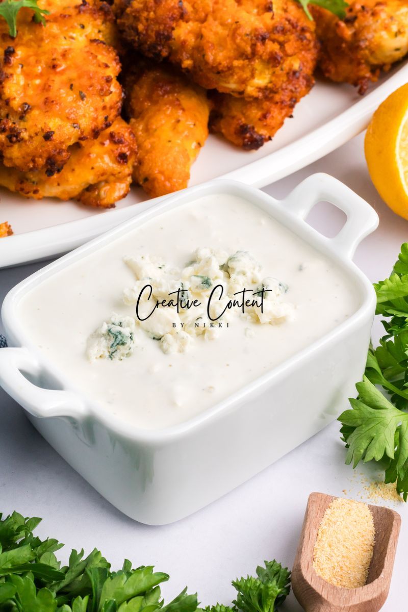 Featured Ingredients; blue cheese crumbles, mayonnaise, sour cream, garlic clove, milk, lemon juice, garlic powder, onion powder, Worcestershire sauce, coarse kosher salt, black pepper, eggs, hot sauce, chicken tenderloin, panko breadcrumbs, parmesan cheese, breadcrumbs, oil spray, and parsley.