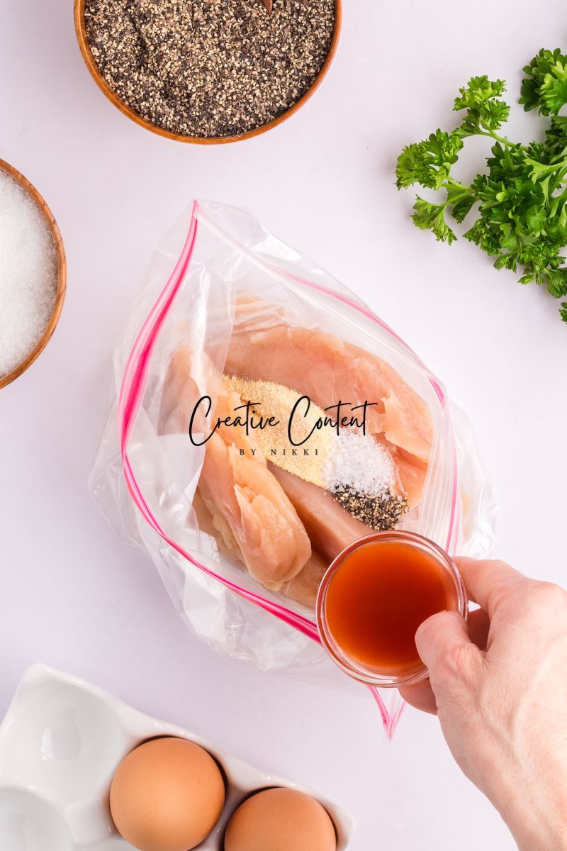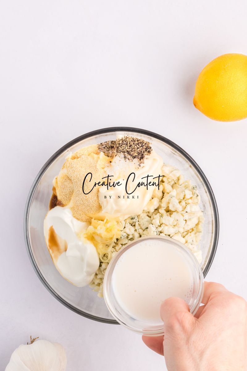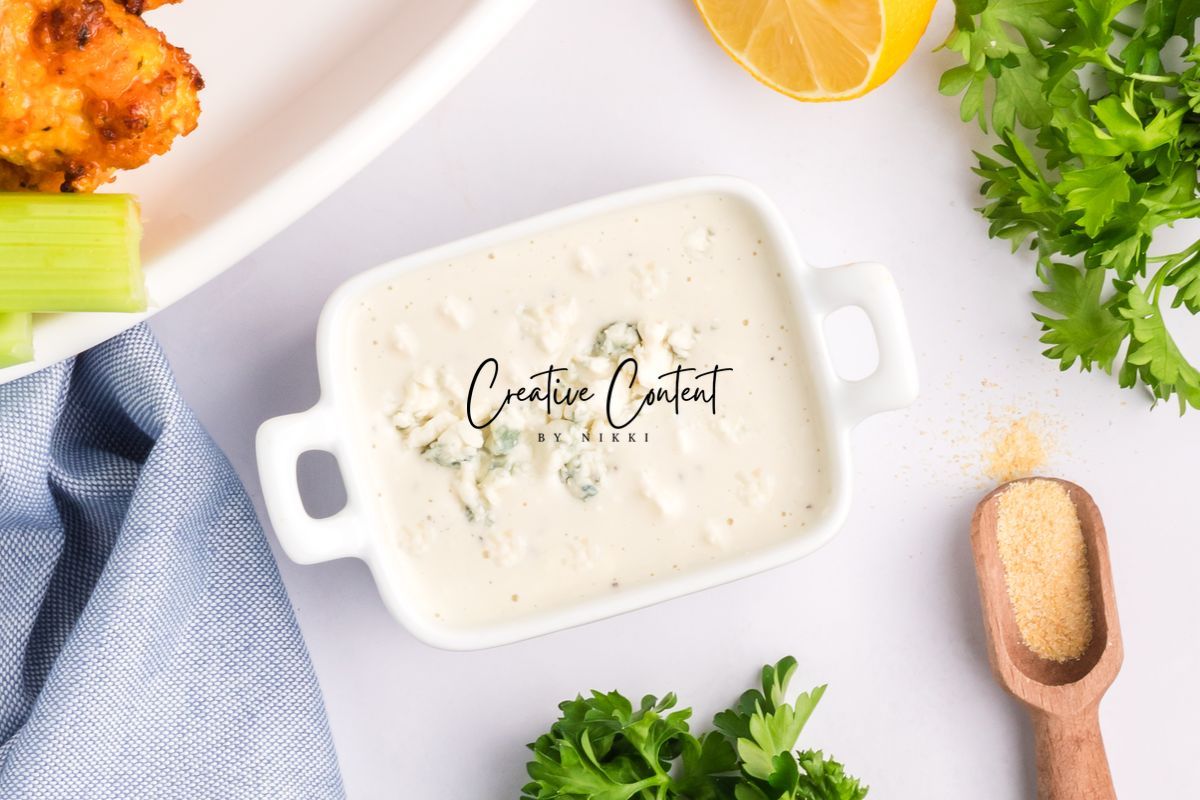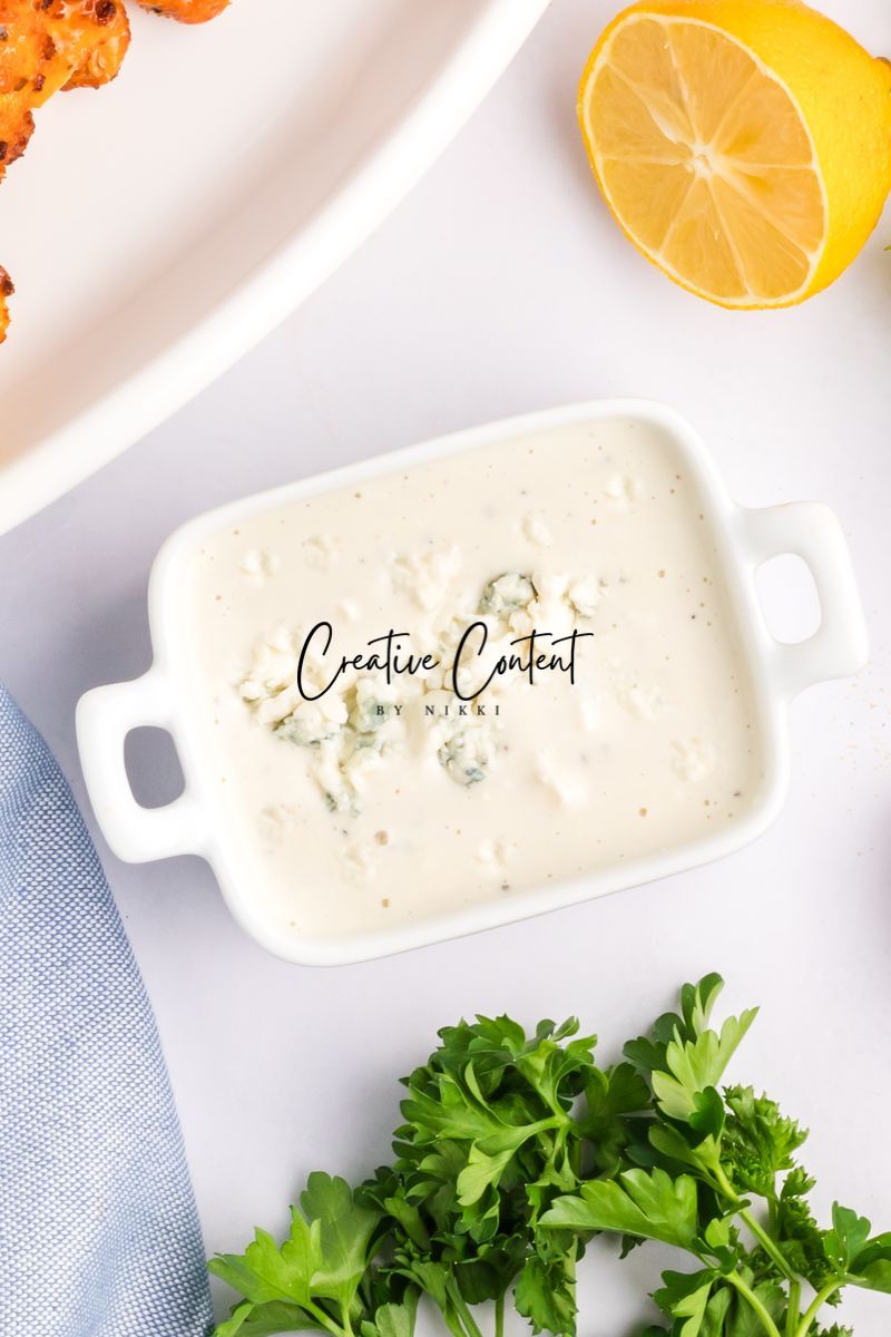Featured Ingredients; blue cheese crumbles, mayonnaise, sour cream, garlic clove, milk, lemon juice, garlic powder, onion powder, Worcestershire sauce, coarse kosher salt, black pepper, eggs, hot sauce, chicken tenderloin, panko breadcrumbs, parmesan cheese, breadcrumbs, oil spray, and parsley.